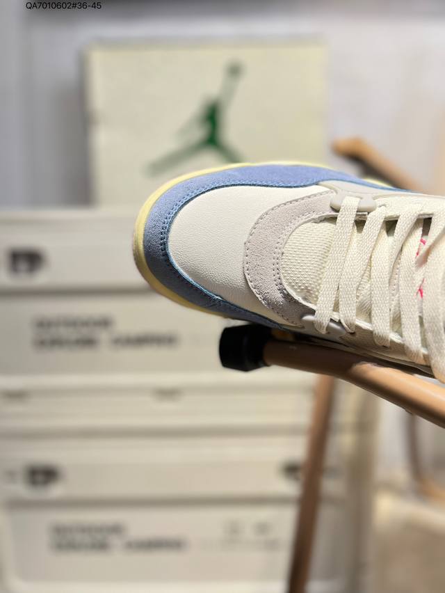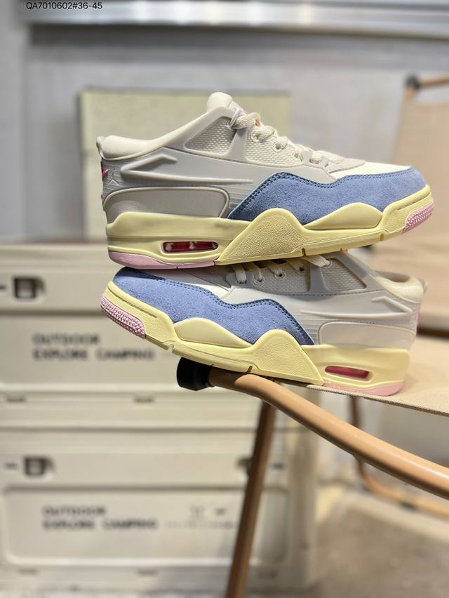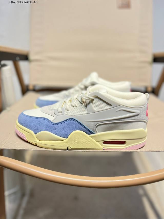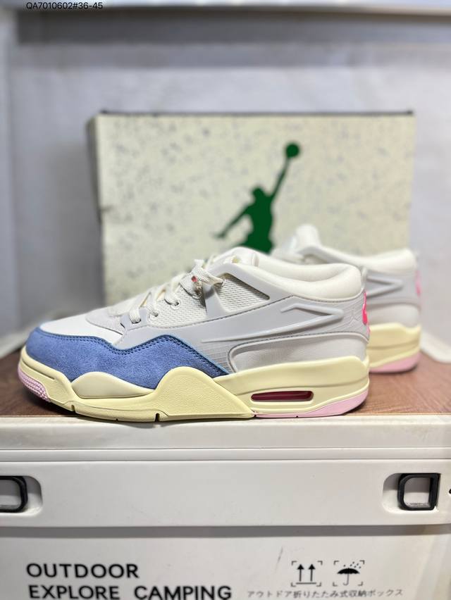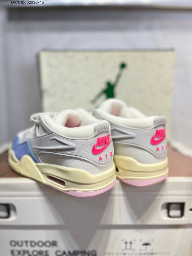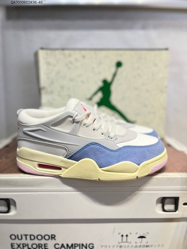 Air Jordan 4 Rm Jade Horizon Low-Top Aj4. This Jordan 4 basketball shoe is crafted from leather and suede, featuring a predominantly light green upper with a gray suede frame at the toe. While retaining the classic Air Jordan 4 styling, the original mesh has been removed, complemented by light green laces for a more cohesive look. A green tongue tag emblazoned with a white Jumpman logo further enhances the shoe's identity. Light green TPU material is used on the upper and heel tabs, adding a touch of color. A white Nike Swoosh and Air are featured on the heel. The midsole continues the previous model's split, visible Air Sloem unit. A distressed, oxidized midsole and off-white green rubber outsole complete the design. Qa7010602#36-45
