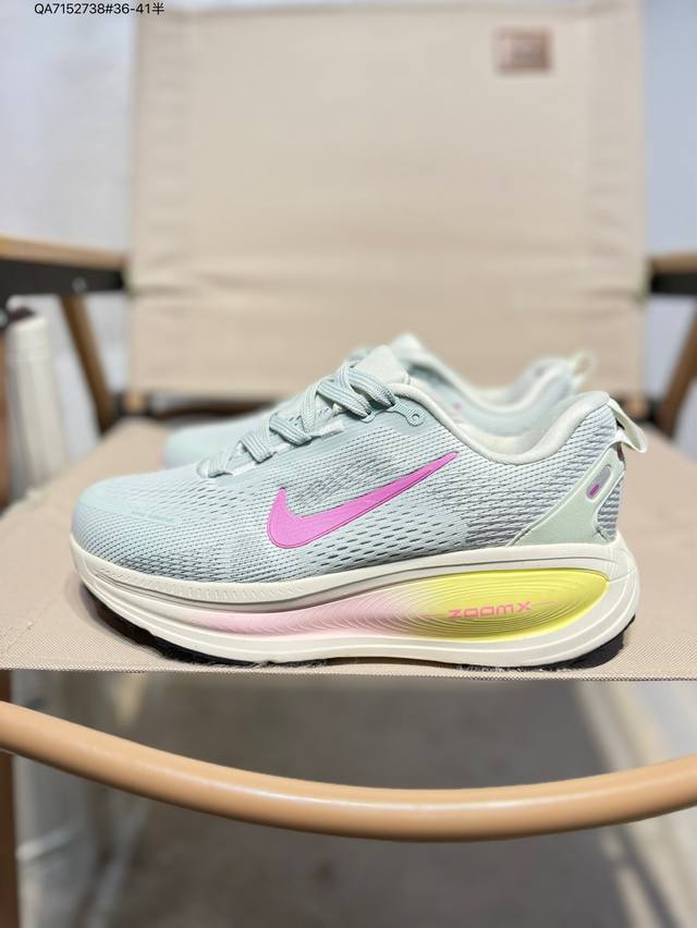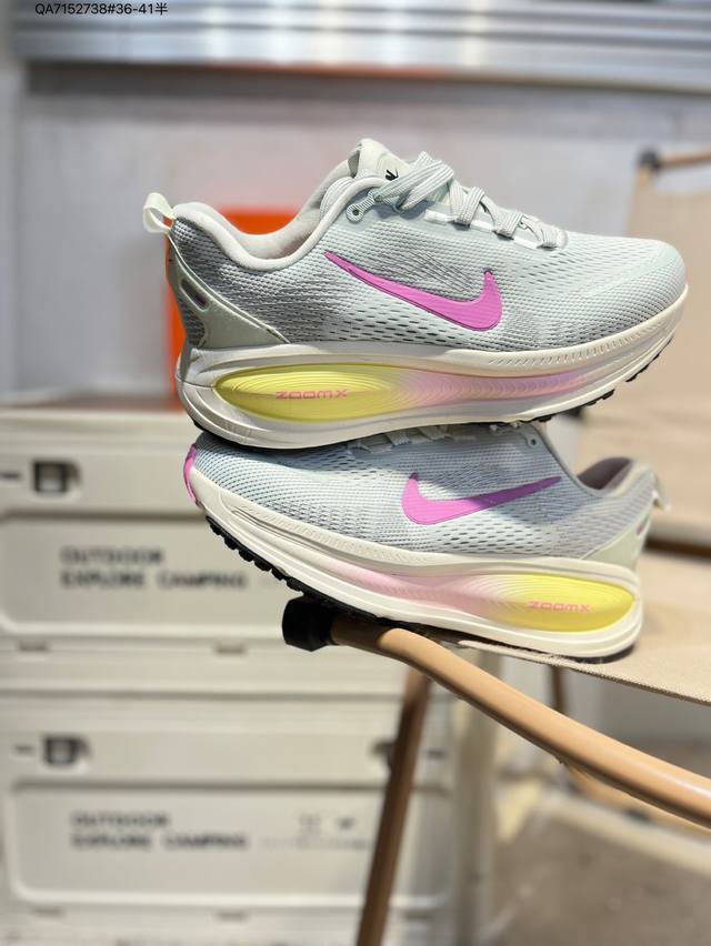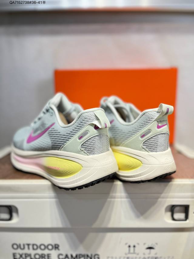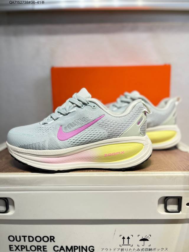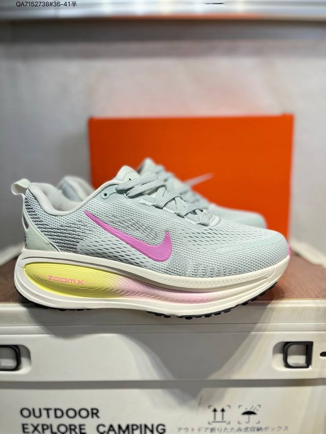 The entire shoe is made of engineered mesh material, which is very breathable. The biggest highlight of this Vomero is that the midsole uses a combination of Zoomx foam that runs through the entire palm and Reactxx foam distributed in the heel and forefoot; it achieves double-layer dual-density foam cushioning and provides excellent foot feel. The stack height is increased to 46 mm, an increase of 6 mm from the previous work, refreshing the highest stack height in the history of the Vomerob series, bringing an extraordinary cushioning effect; and the sole is made of wear-resistant rubber material with good grip.