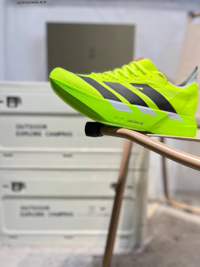 The Celermesh knitted mesh upper is very lightweight with large gaps between the fibers, ensuring breathability and sweat-wicking during running. The tongue is directly connected to the lining on both sides and the sole, preventing it from shifting laterally during running. An extra set of eyelets has been added to the standard eyelets to accommodate different foot shapes. Breakthrough Energyrods technology helps runners achieve better results. The unique Lightstrike Pro foam in the midsole provides a slightly elastic feel and excellent support during running. For top elites and advanced runners, the Adios Pro is a reliable racing shoe. Jr6757 Qz7012553# 36-45 half