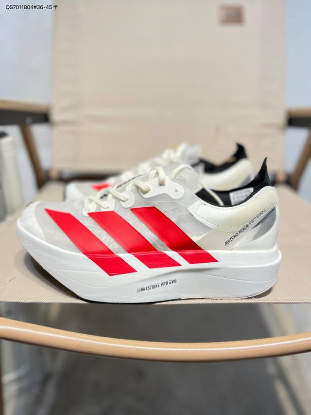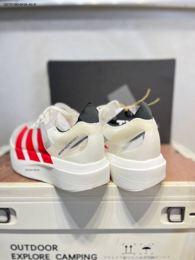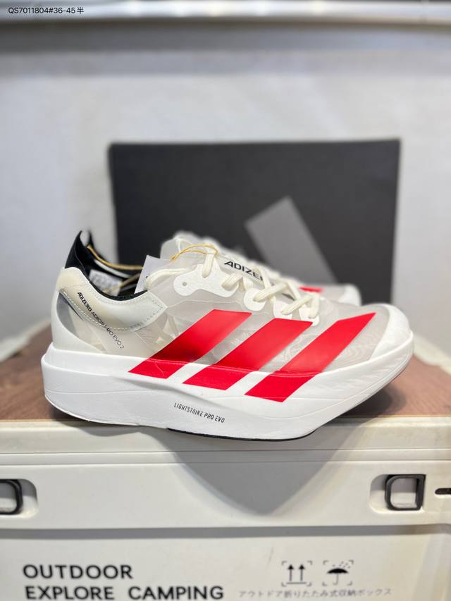 Adidas Adizero Pro Evo 2 Adidas Ultralight Breathable Cushioning Running Shoes DDD The overall appearance is very similar to the Adizero Adios Pro Evo 1. The midsole features full-length Lightstrike Pro DDD The upper uses breathable mesh, fitting its positioning as a daily training shoe for greater durability DDD The outsole uses Continental rubber and the previous generation racing flagship Adidas Adizero Adios Pro 3. (Area distribution: Ih5579 Qs7011804 #36-45 half DDD)