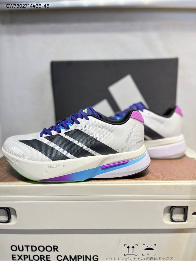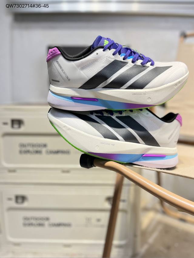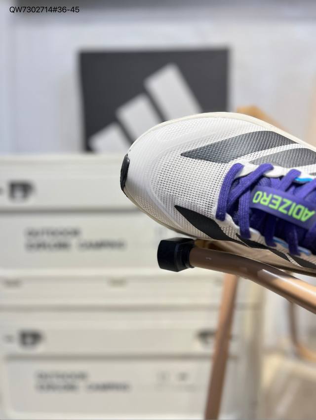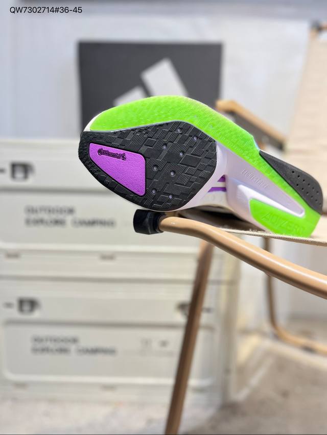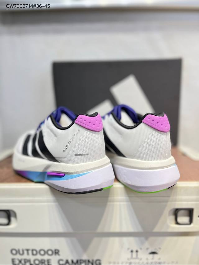 The Celermesh knitted mesh upper is very lightweight with large gaps between the fibers, ensuring breathability and sweat-wicking during running. The tongue is directly connected to the lining on both sides and the sole, preventing it from shifting laterally during running. An extra set of lace holes has been added to the standard eyelets to accommodate different foot shapes. Breakthrough Energyrods technology helps runners achieve better results. The unique Lightstrike Pro foam in the midsole provides a slightly elastic feel and excellent support during running. For top elites and advanced runners, the Adios Pro is a reliable racing shoe. Js4955