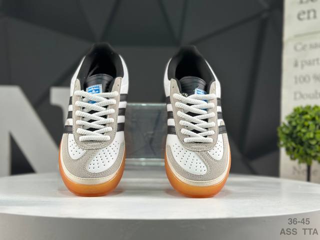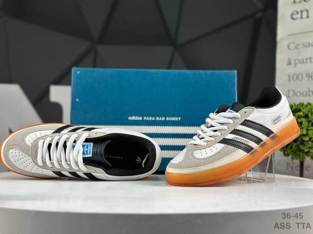 Adidas Bad Bunny X Ad Gazelle Indoor Trainers Collaboration: Low-top Retro Versatile Casual Sports Sneakers. Bad Bunny himself was spotted wearing them during a magazine photoshoot, setting the stage for the release. Emm, the magazine cover he's holding is still featuring Kylie Jenner, so it seems his ex-girlfriend and Booker are back together, and he hasn't quite moved on... Back to the shoes themselves, the overall design features a simple black and white leather upper paired with light gray long-pile suede, finished with a semi-transparent gum sole, giving it a premium feel. Unlike previous collaborations with their color palettes, Bad Bunny widened and thickened the Gazelle Indoor, and added a deformed toe box, creating a new, slightly tilted, bread-like Gazelle silhouette. Furthermore, the shoe tag is prominently displayed on the heel, and the Benito logo is added below the Adidas logo on the side, maximizing recognizability. Sizes: As shown in the picture. Style Code: If9735