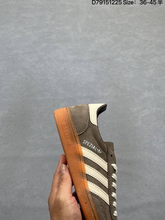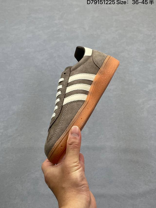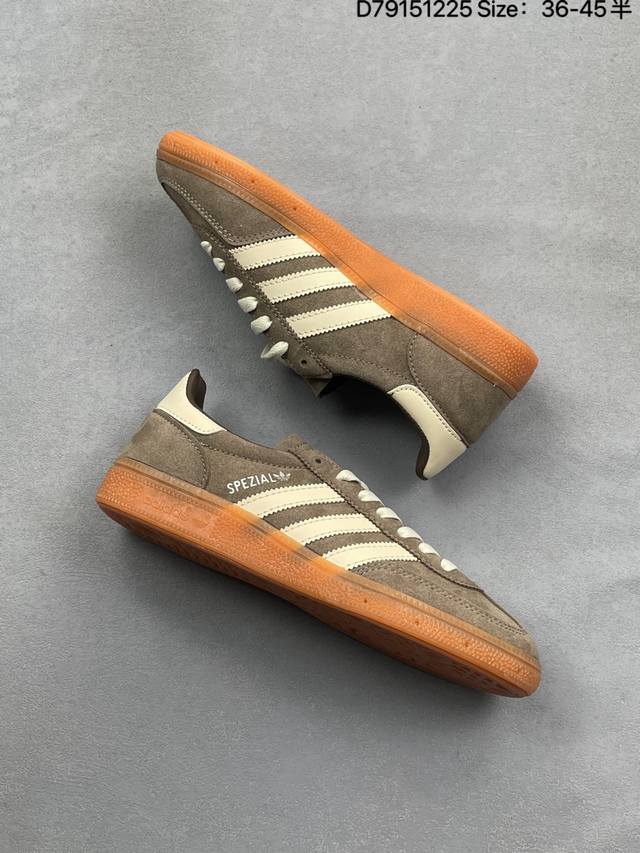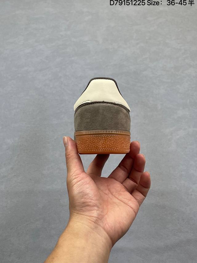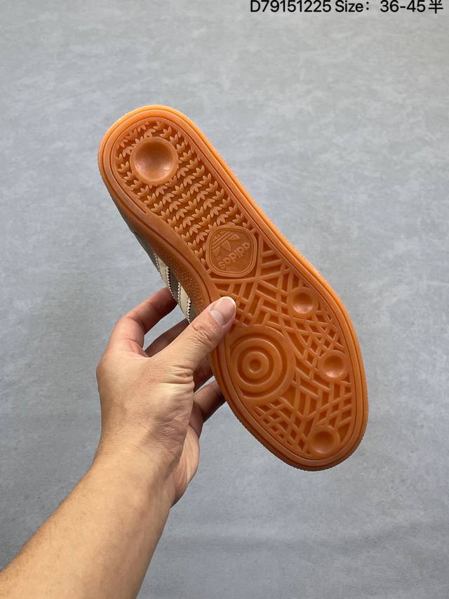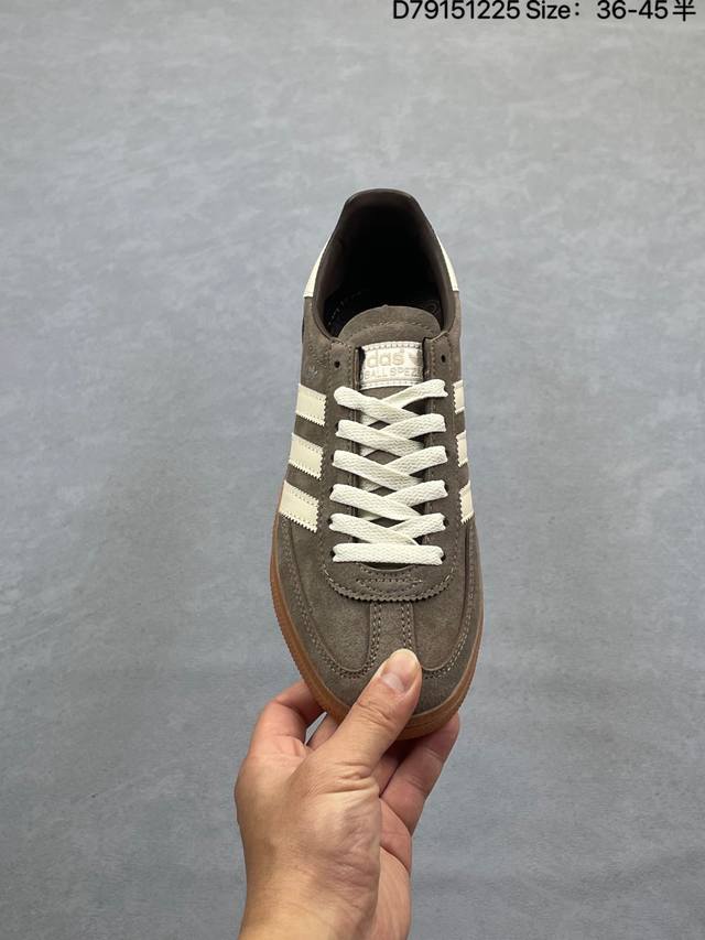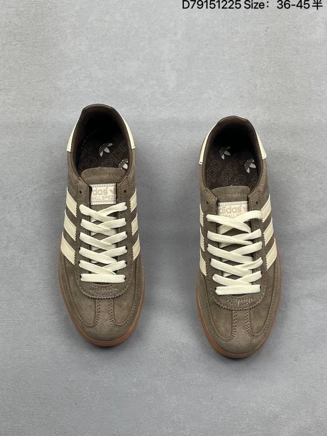 Adidas Handball Spezial, Trefoil logo, retro casual sneakers, German training shoes, rubber sole, soft leather, classic athletic shoes. Round toe, stitched design, front lace-up, tongue tag, classic three stripes on the side, these sneakers embody youthful spirit. Clear brand recognition, durable rubber outsole. Product Code: If6490 Sizes: 36-45 (including half sizes) Code: D79151225