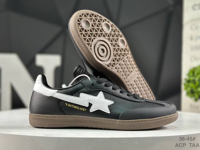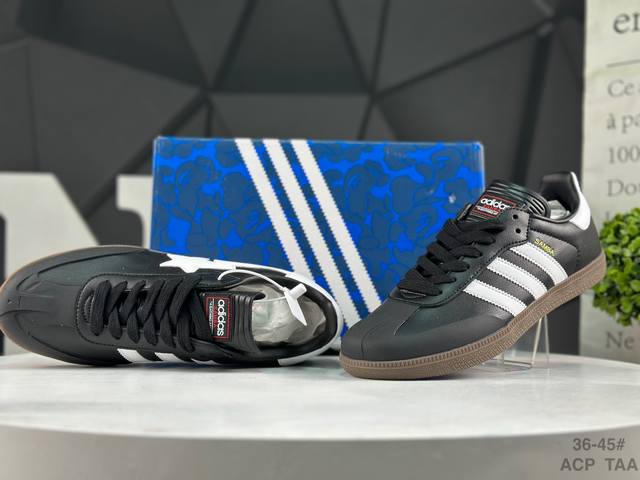 Adidas Original Samba Bape Sneakers. These samba shoes showcase high-quality craftsmanship with decorative superlock stitching and a seamless, soft feel. The supple leather styling and iconic 3 stripes complete the sophisticated look. Regular fit with laces, a suede upper, a rubber insole, and a soft, orthodontic sleeve. They've been winning over fans since their debut in the 1950s. Style Code: Jr9246. Sizes: 36-45. (Note: The last part, "