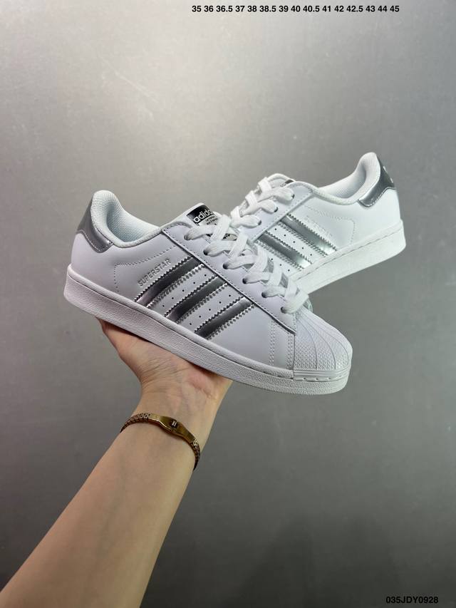 Adidas Superstar classic shell-toe sneakers with the finest top-layer uppers. Perfectly lasted, perfectly curved, with a rounded shell toe cap, a seamless fit, and built-in, original panels! Available in-store!