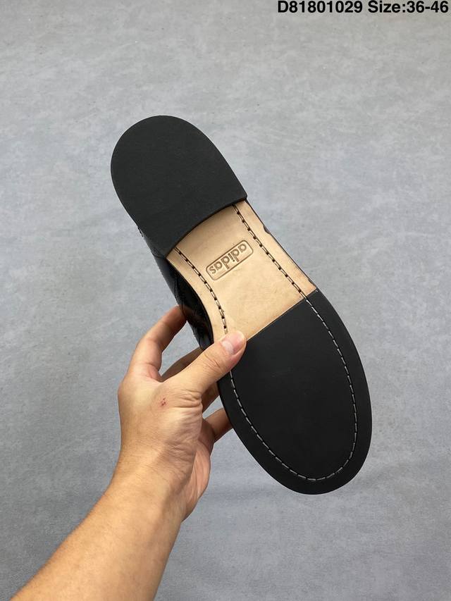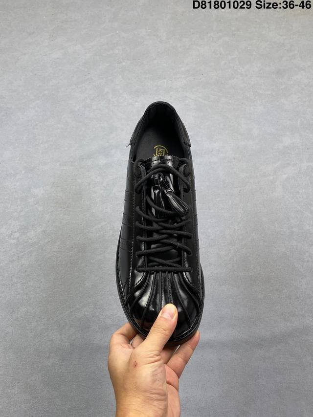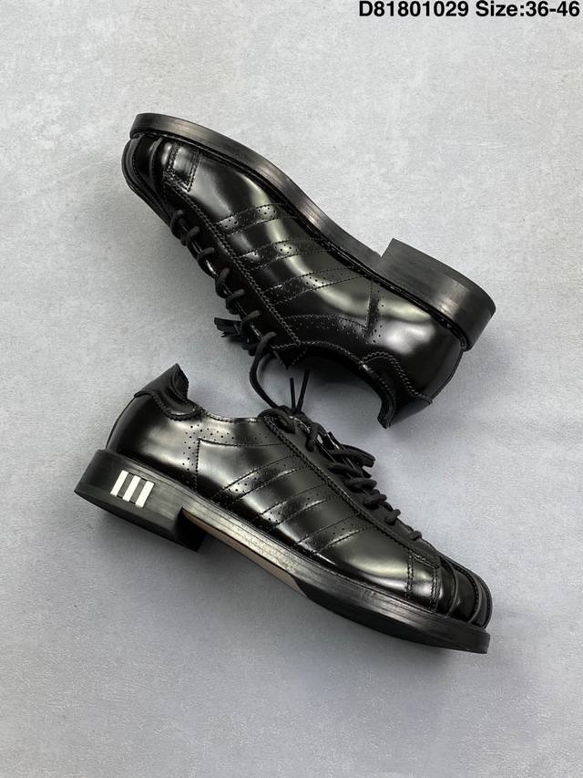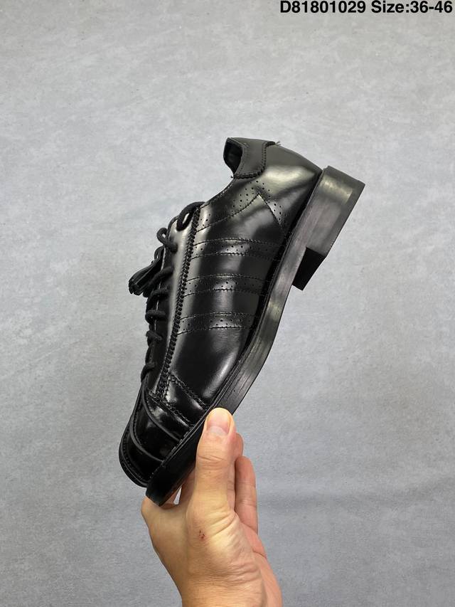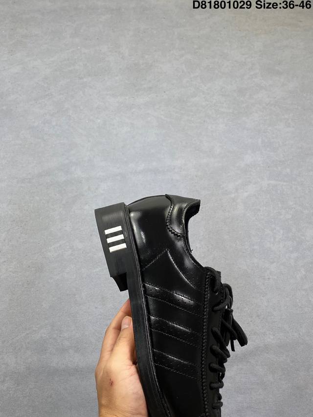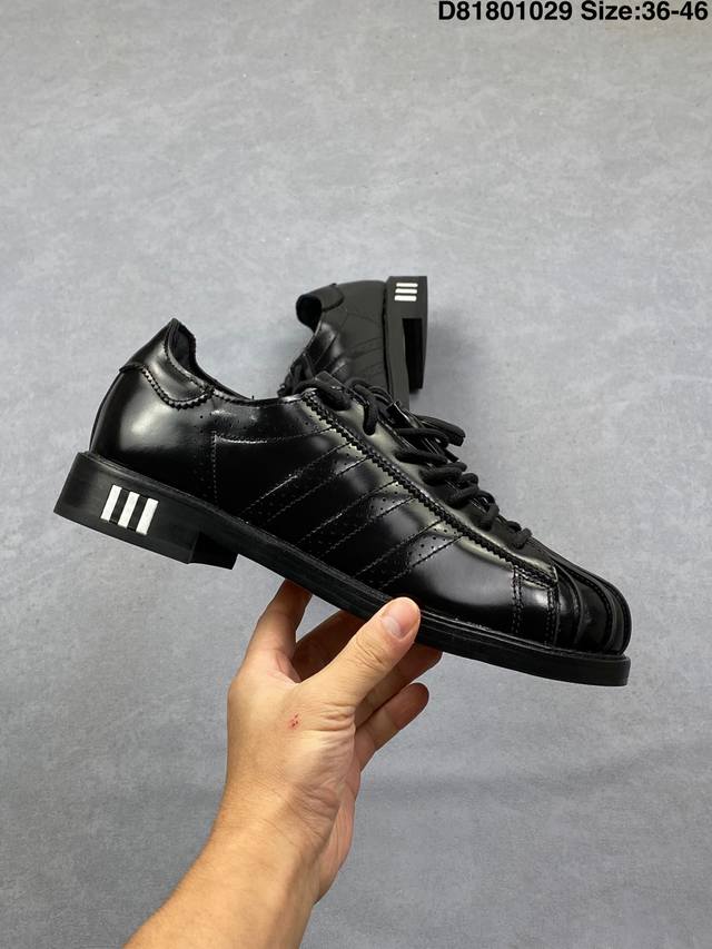 #The upper design retains the recognizable lines of the Superstar, using black patent leather. It retains the iconic rubber toe cap, but Oxford-style rope laces replace the traditional flat laces, adding a touch of formality and elegance.