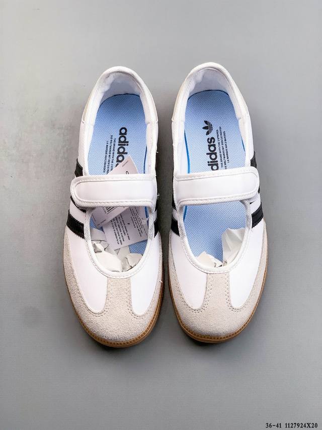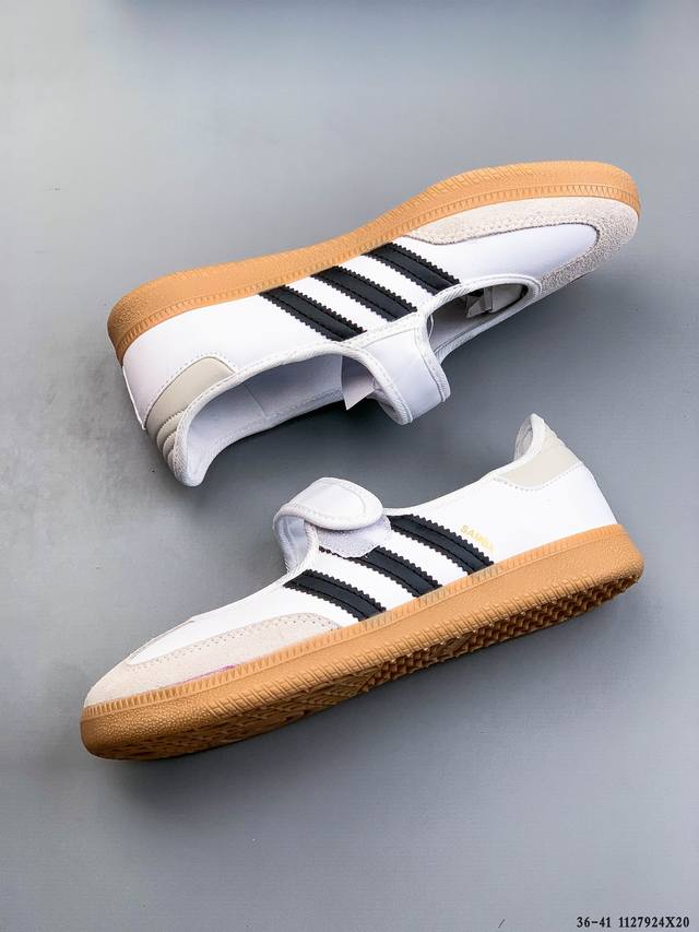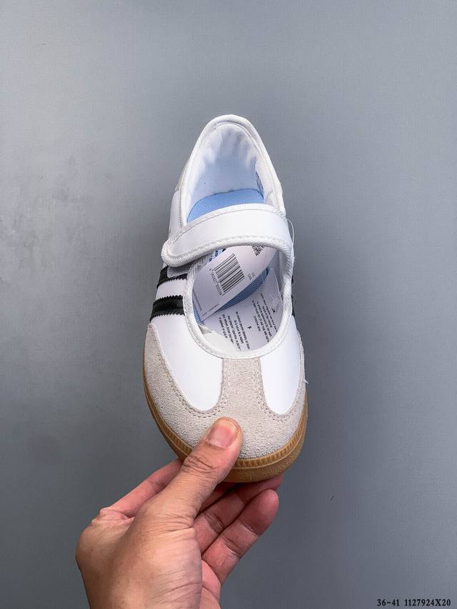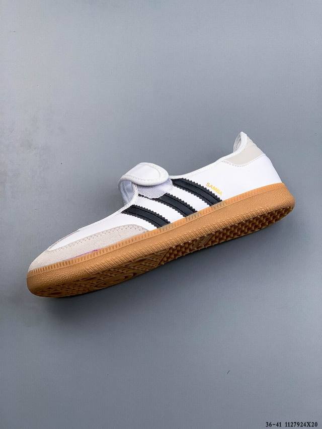 Company Grade! Adidas Samba Jane Mary Jane Sneakers, slip-on athletic shoes. Made with leather, these shoes blend classic and modern elements. They feature Mary Jane design elements such as buckles and ring details on the upper, while retaining the classic three stripes and rubber outsole of the Samba shoe. The shoe has a slender silhouette, narrower in the midfoot, and offers a strong overall fit, suitable for both standard and wide feet. (1127924X20)