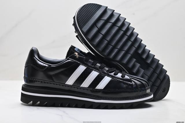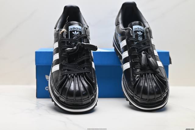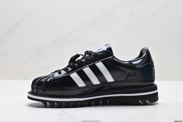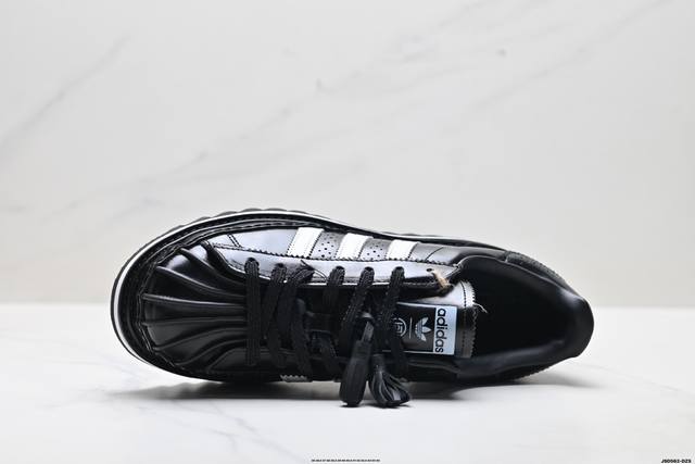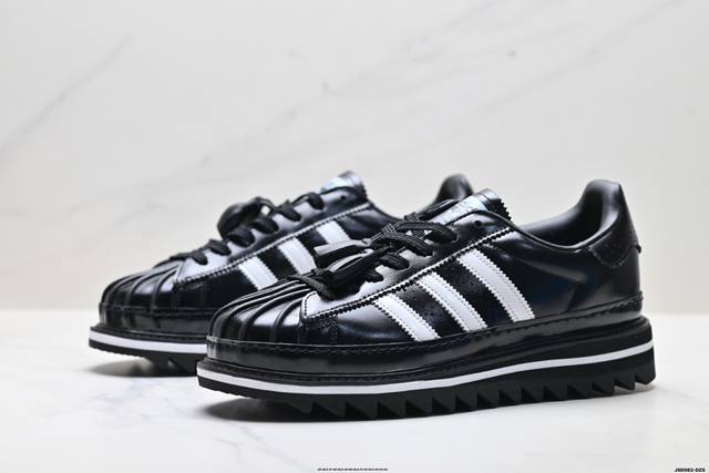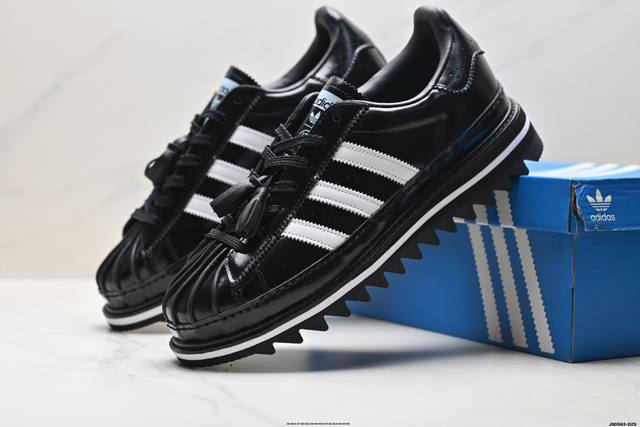 The overall design is based on the classic Superstar, reinterpreting the iconic shell toe. The tongue features special tassel details and both brands' logos, highlighting the collaboration. The biggest highlight is the sole, which, in addition to the midsole's height-increasing design, also features a unique shark sawtooth pattern