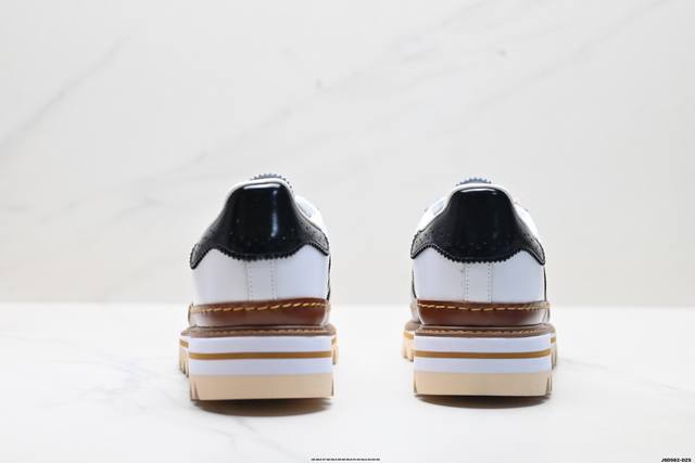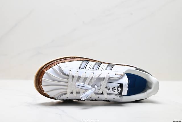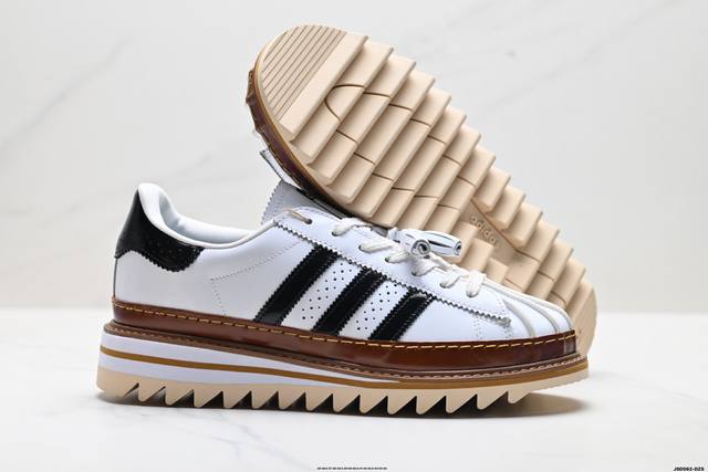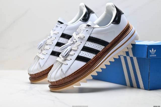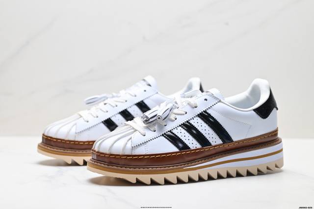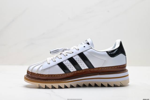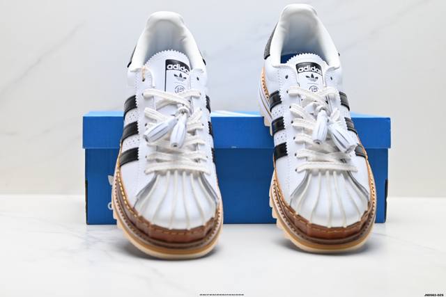 The overall design is based on the classic Superstar, reinterpreting the iconic shell toe. The tongue features special tassel details and both brands' logos, highlighting the collaboration. The biggest highlight is the sole, which, in addition to the midsole's height-increasing design, features a unique shark sawtooth pattern