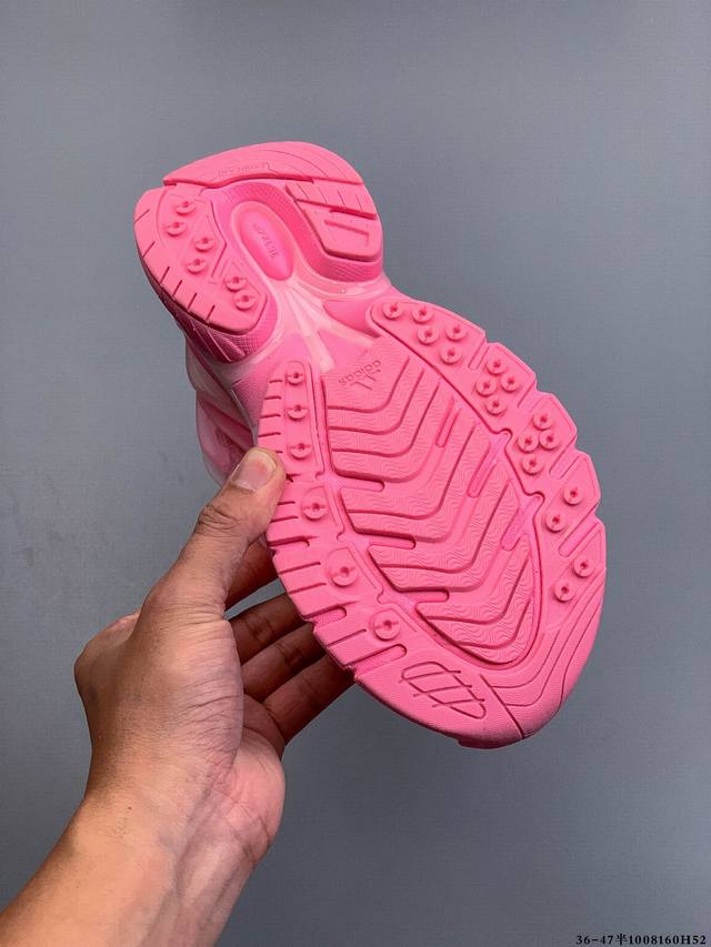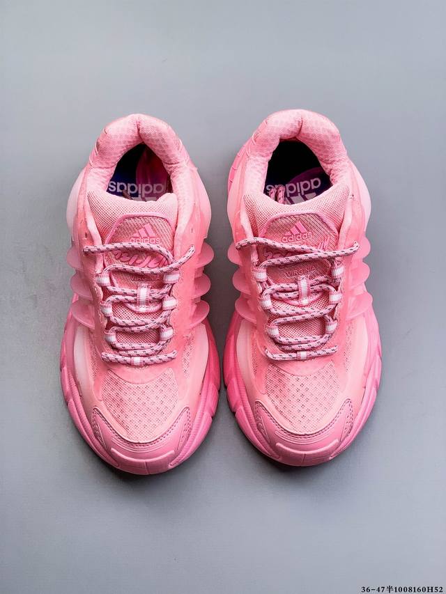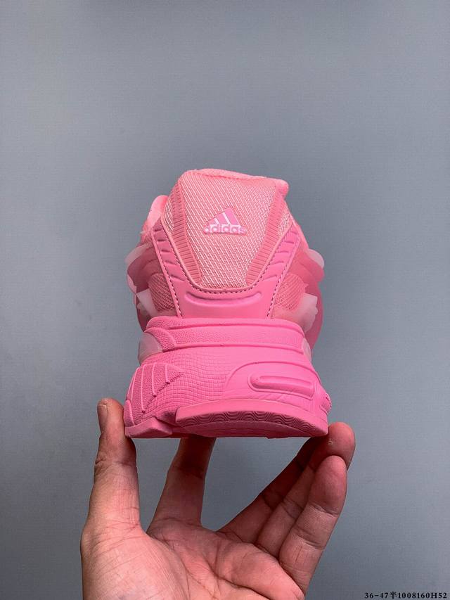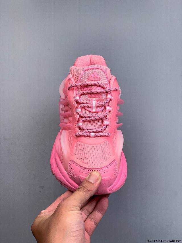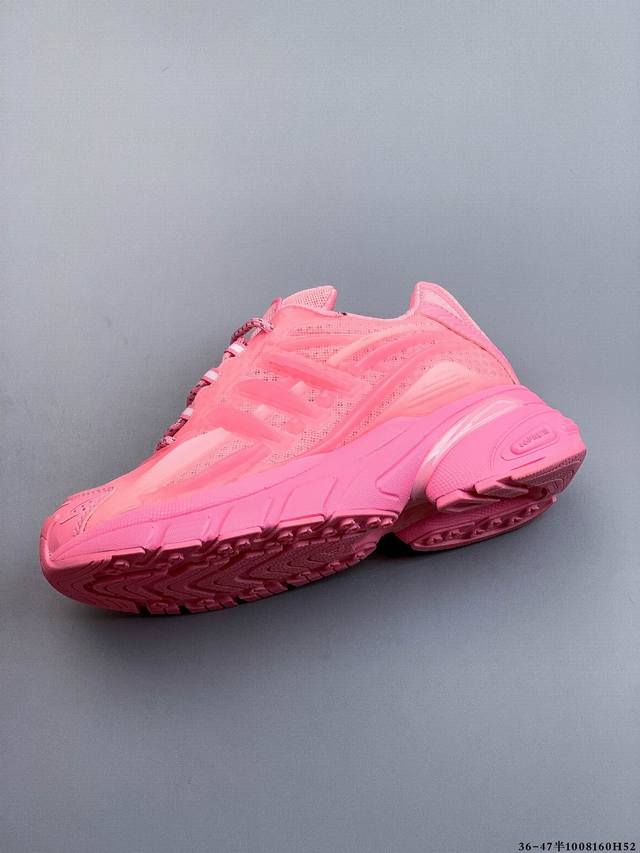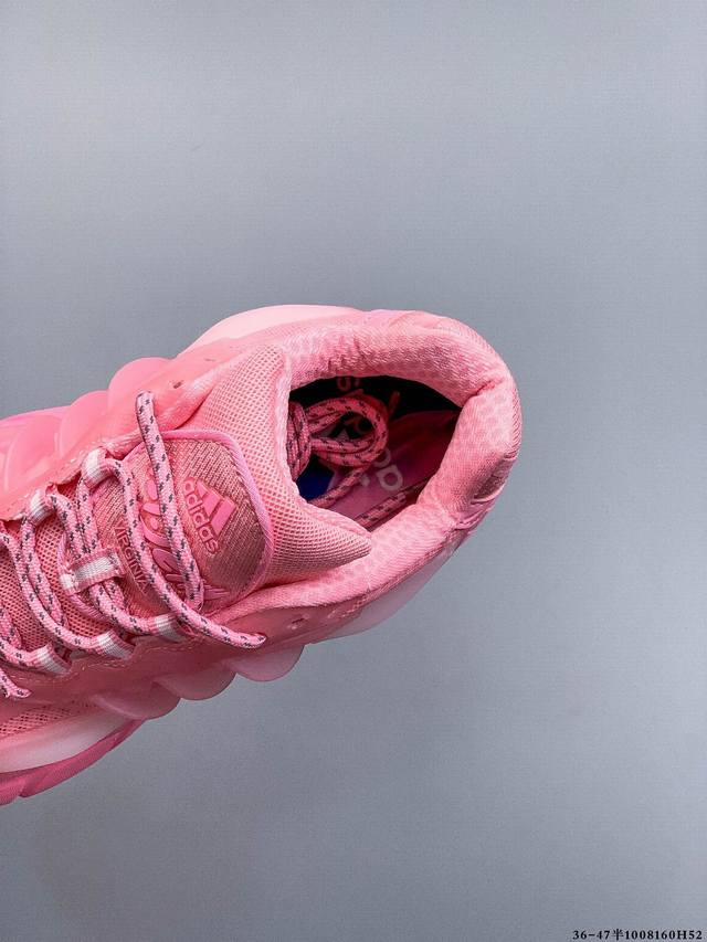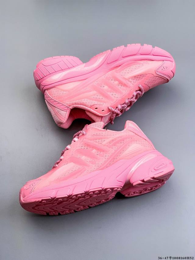 infuses Adidas' classic heritage with a modern twist. Its most striking design element is the complex plastic frame outsole, cleverly mimicking the shape of a jellyfish, capturing muscular movement and flowing energy through layered panels and sculptural elements. The