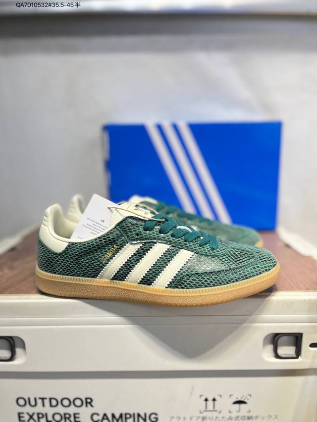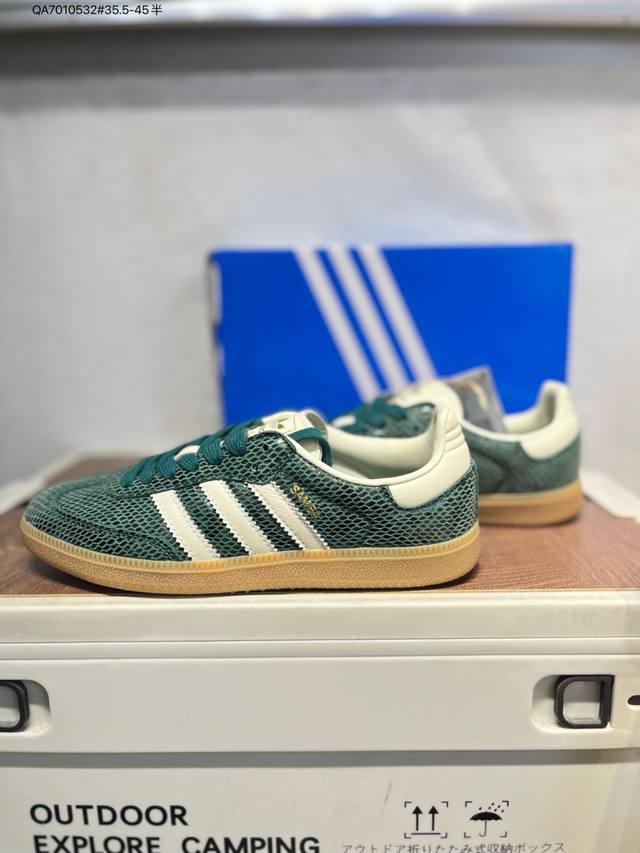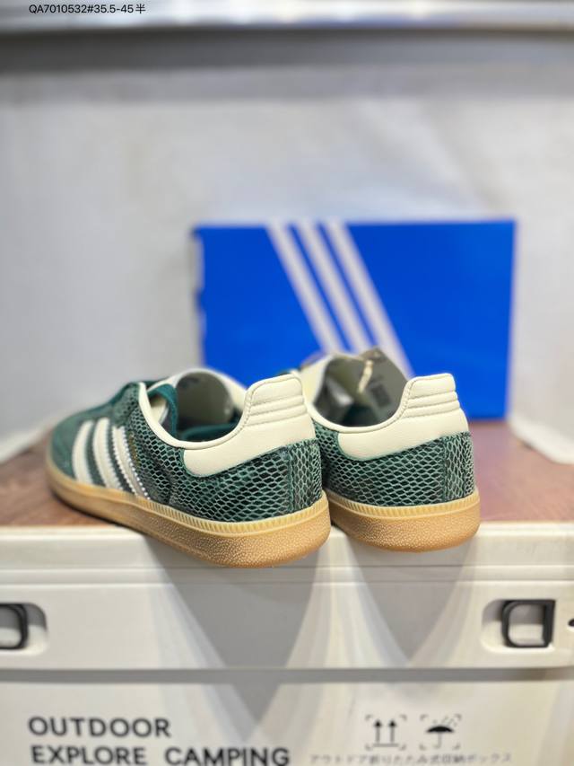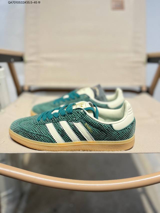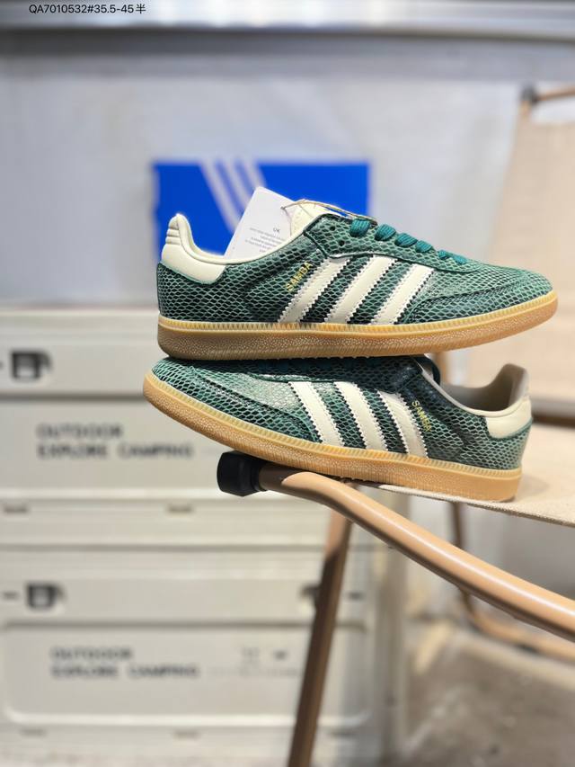 Featuring a snakeskin-patterned split leather upper, an embedded cushioned, breathable, and sweat-wicking insole, and an external durable rubber outsole, this Adidas Originals Samba Og Collegiate Green Gum sneaker is a versatile low-top casual sports shoe with a retro snakeskin green and white rubber sole. (Jr8848 Qa7010532, size 35.5-45)