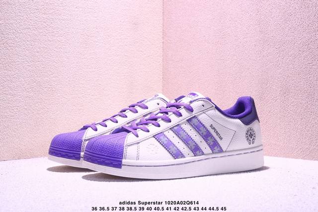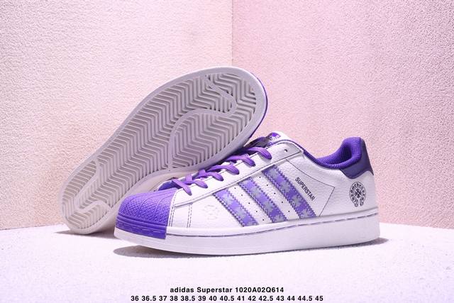 Limited release of overseas hot item! High-end custom Adidas Superstar "Chrome Hearts Collaboration - White and Purple Chrome Hearts Print" classic shell toe design, paired with a refreshing off-white and navy blue color scheme. High-end custom low-top casual sneakers. Custom shoe box. Factory direct, pure original quality. Super clean leather with clean cuts and no rough edges. Perfect details. Item No.: Ds0021 Size: 36 36.5 37.5 38 38.5 39 40 40.5 41 42 42.5 43 44 44.5 45 Xm1020Q614