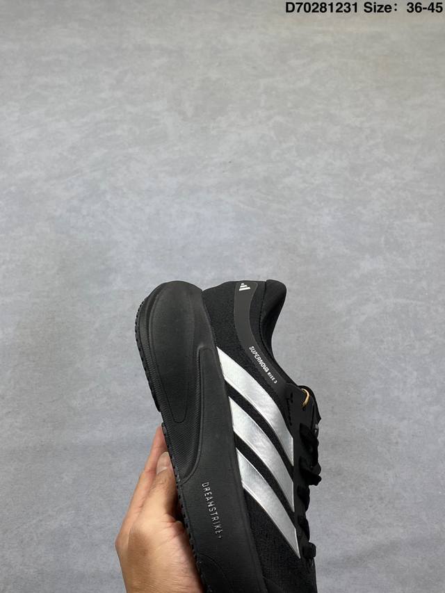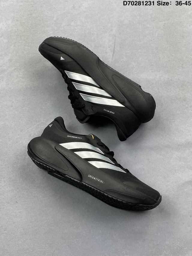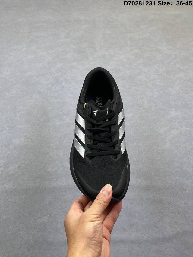 New Product: Company-Grade Adidas Supernova Rise 3 Shoes - Slip-resistant, durable, and comfortable running shoes. Midsole Technology: Utilizes Dreamstrike+ supercritical foam material reconstructed from Peba base material, combining cushioning and rebound. Support System: Density gradient support bar design optimizes gait transition stability. Waterproof Version: GTX models feature a Gore-Tex invisible waterproof membrane, suitable for rainy conditions. Last Design: Standard width last with comfortable heel lockdown; some users have reported that the lacing system of the regular version needs improvement in terms of fit. Suitable Scenarios: Optimal cushioning for 5-minute pace jogging; forefoot slippage occurs at paces below 4.5 minutes per kilometer. Durability: The Continental rubber outsole demonstrates good wear resistance in multi-terrain testing. Type: Men's and Women's Shoes Product Code: Jr7372 Sizes: 36-45 (including half sizes) Code: D70281231