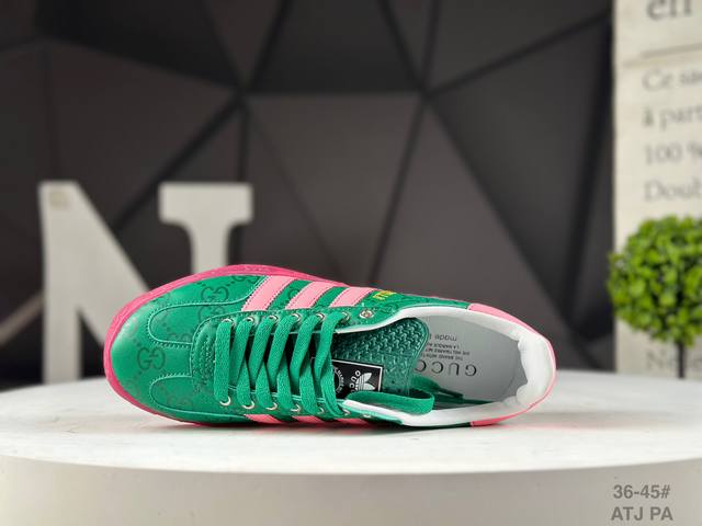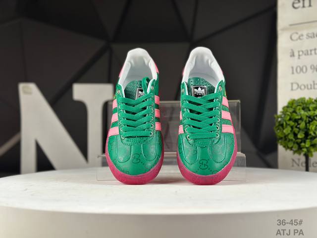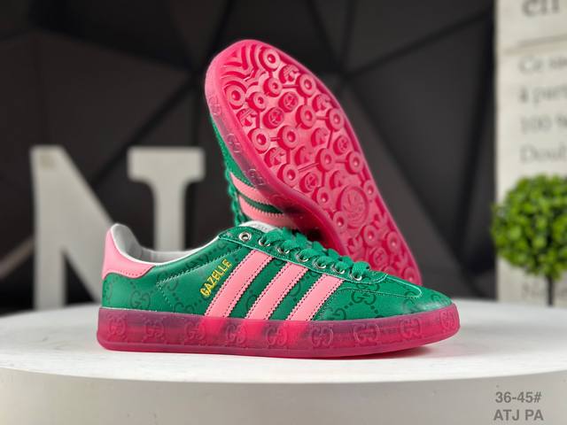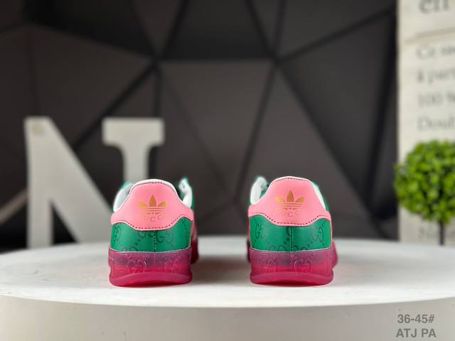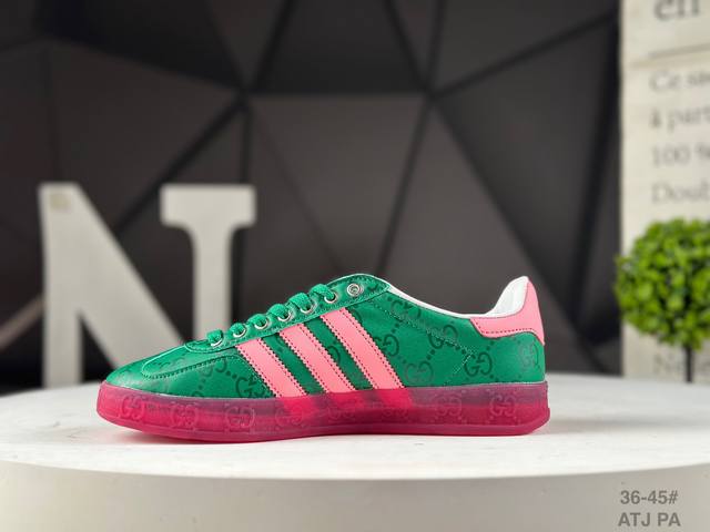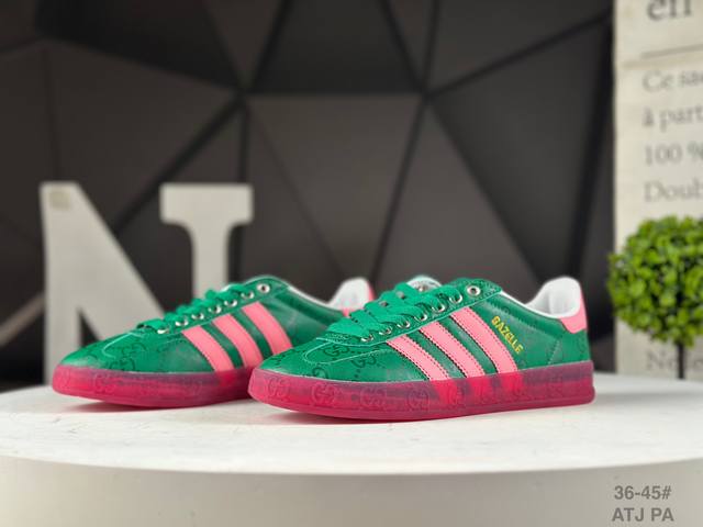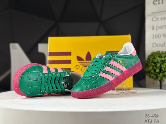 The Adidas X Gucci collaboration features the Trefoil logo and the iconic three-stripe design elements, combining them with the unique Gucci aesthetic. Both partners chose the Adidas Originals classic Gazalle silhouette as their model. The rubber sole features the Trefoil and Gucci logo, while the upper is covered in textures like python, suede, and suede, seamlessly blending luxury, retro, and sporty styles. The three-stripe Dexterity sneakers are expected to continue to be popular this year. Item Number: 737966 Faaw3 3746 Atj