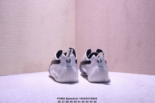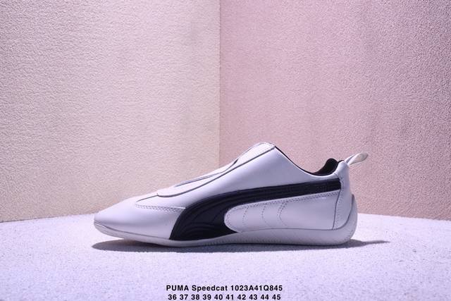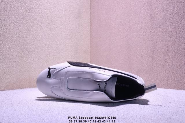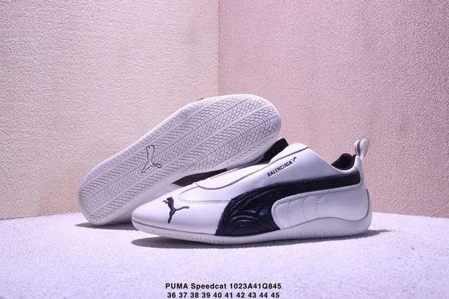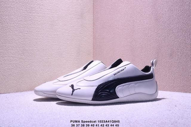 The Balenciaga x Puma Speedcat sneakers are inspired by racing shoes. The black leather and white stripes create a simple yet sporty look. The laceless design makes them easy to slip on and off. The thin sole makes them lightweight and suitable for everyday wear or sports. The upper features the Balenciaga and Puma logos, showcasing the unique aesthetic of the collaboration and embodying the boundless energy of racing. Style code: 406515-02. Sizes: 36, 37, 38, 39, 40, 41, 42, 43, 44, 45. No half sizes available. Xm1023Q845