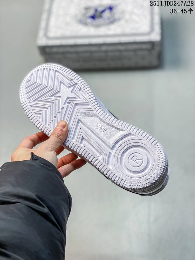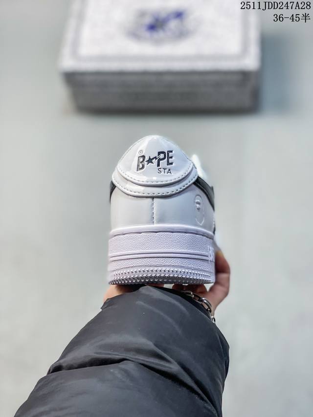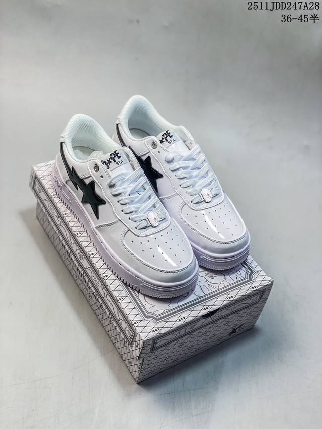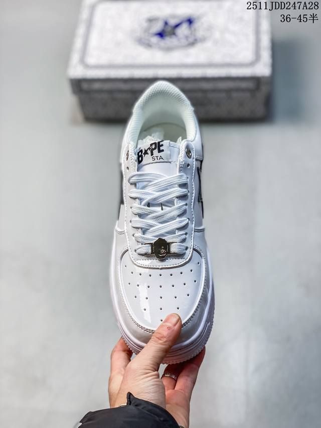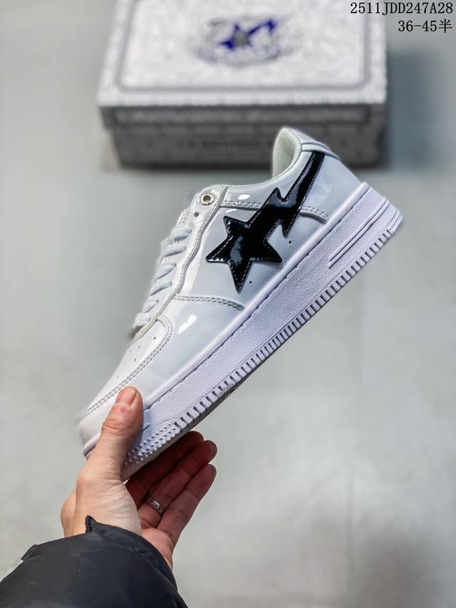 Bape Sta To Low Classic Patent Leather Low-Top Sports Casual Sneakers. Developed using original cardboard lasts to ensure authenticity and the most perfect low-slung design. Exclusive private mold, grinding tools, and punching for export platforms. Factory-supplied leather with zero deviation in gloss and color. The lining uses the best ultra-soft original factory filling cotton. Logo is printed on imported machines using the highest QC inspection standards, controlling glue overflow and ensuring consistent depth and positioning. The midsole incorporates Ortholite cushioning material. Complete original packaging including the Bape logo. DDD 11Jdd247A28 DDD