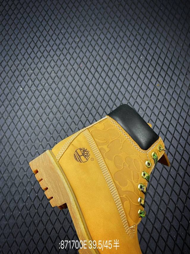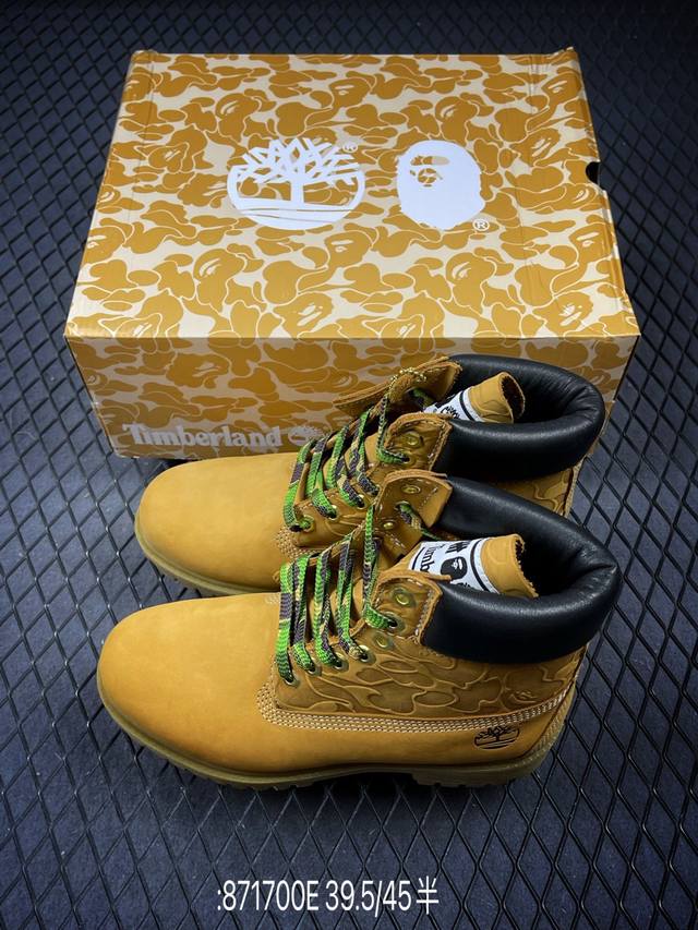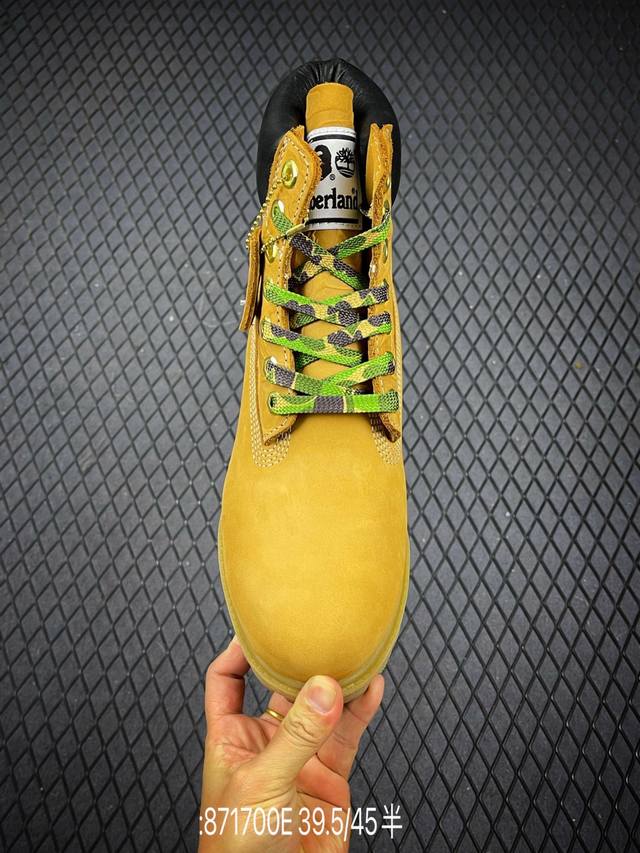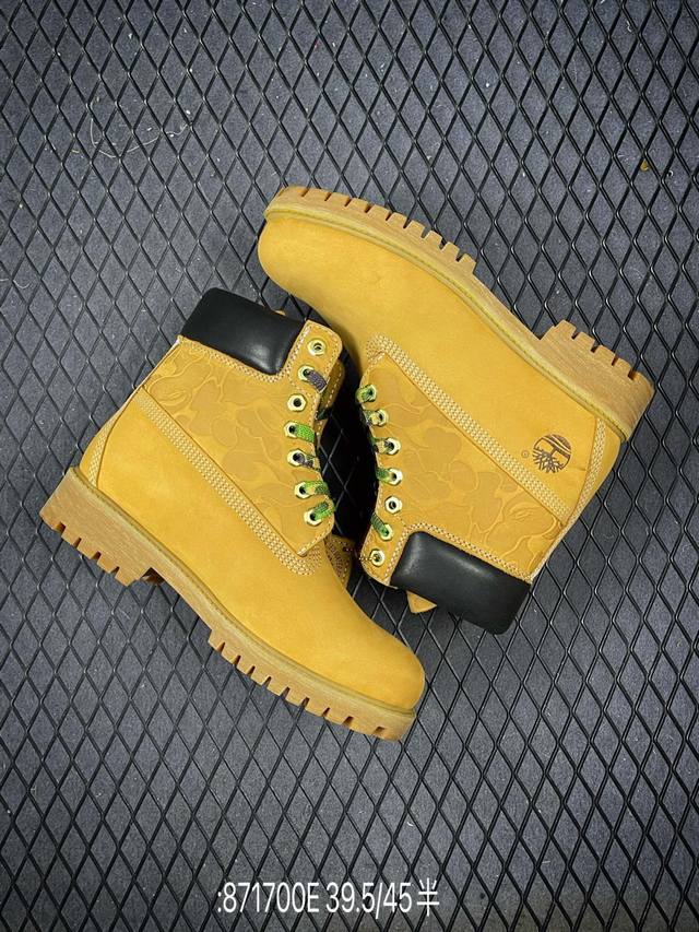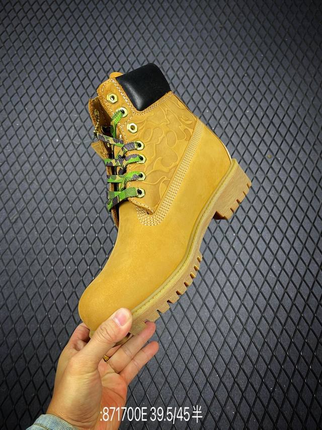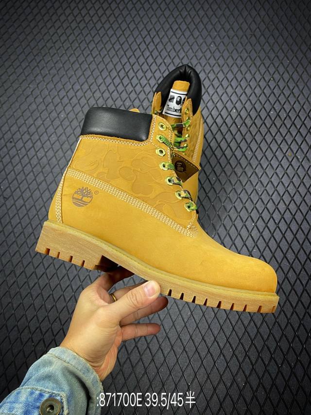 New Arrival# Original Channel Collaboration: Timberland, Bape, and Undefeated. This limited-edition, best-selling classic collaboration is available. Made in Zhongshan. Made with premium waterproof nubuck leather, premium injection-molded outsole. Authentic four-thread alignment. Authentic Bape embossed pattern, dynamic horizontal folding pattern, and splash-proof packaging. Includes all accessories. Sizes: 39.5, 40, 41, 42, 43, 44, 45. Code: 871700E.