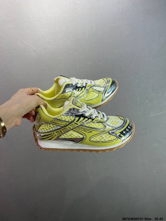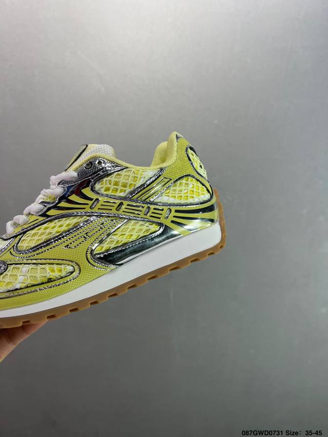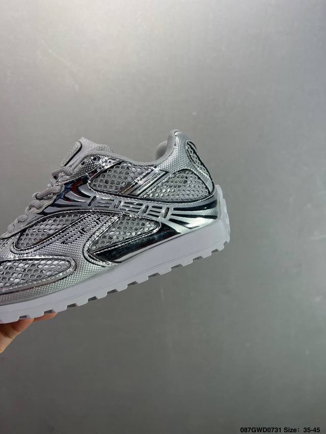 Company-level upgraded original last and paper version development pattern#Uses lightweight technical diamond mesh fabric upper material#Inlaid breathable mesh with thickened PU cushioning latex insole#External anti-deformation and wear-resistant TPU rubber outsole, paying homage to the brand's famous Intrecciato pattern! Italian luxury brand - Bottega Veneta - Orbit Lace-Up Low Sneakers Track Series Lace-up Low-top Breathable Comfortable Casual Sneakers "Metallic Red Wisteria Raw Rubber Sole" 755915V2X405851 DDD Sizes: 35-45 DDD Code: 087Gwd0731 DDD Bottega Veneta releases the new Orbit sneaker. The shoe is inspired by the silhouette of 90s sneakers, featuring the application of mesh texture and cross-overlay of different materials on the upper, undoubtedly paying homage to the brand's famous Intrecciato pattern. Furthermore, the sole design is slender and elegant, extending to the back of the heel, cleverly combining sporty elements with fashion inspiration. Available in silver-white, black, and silver/parrot green colorways. Product Details: Technical Fabric Lace-up Sneakers; Lining: Technical Fabric Rubber Outsole.