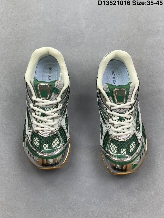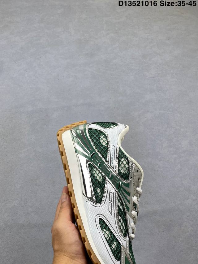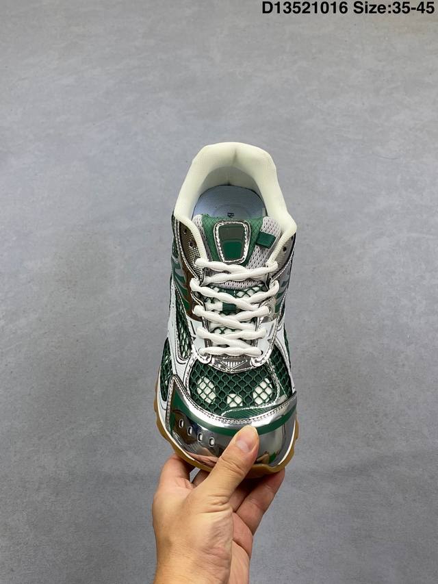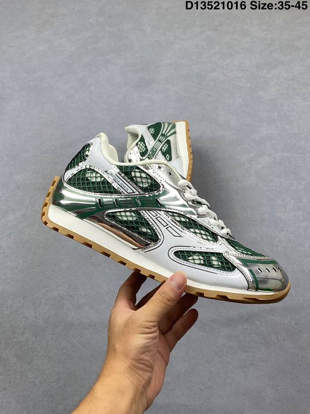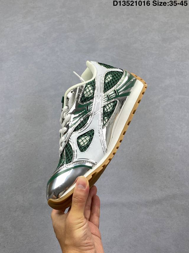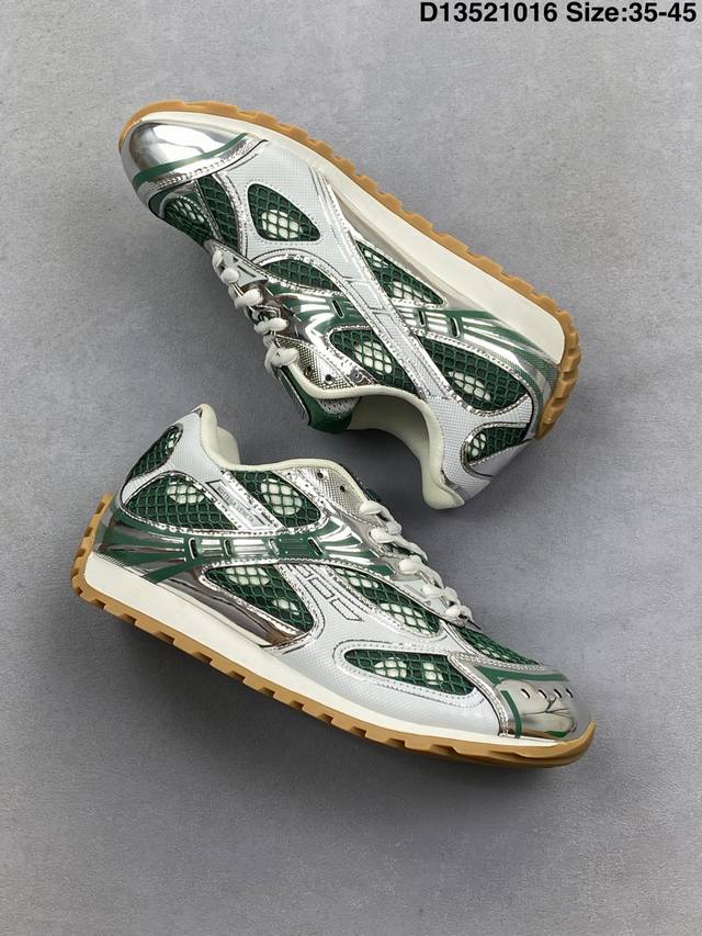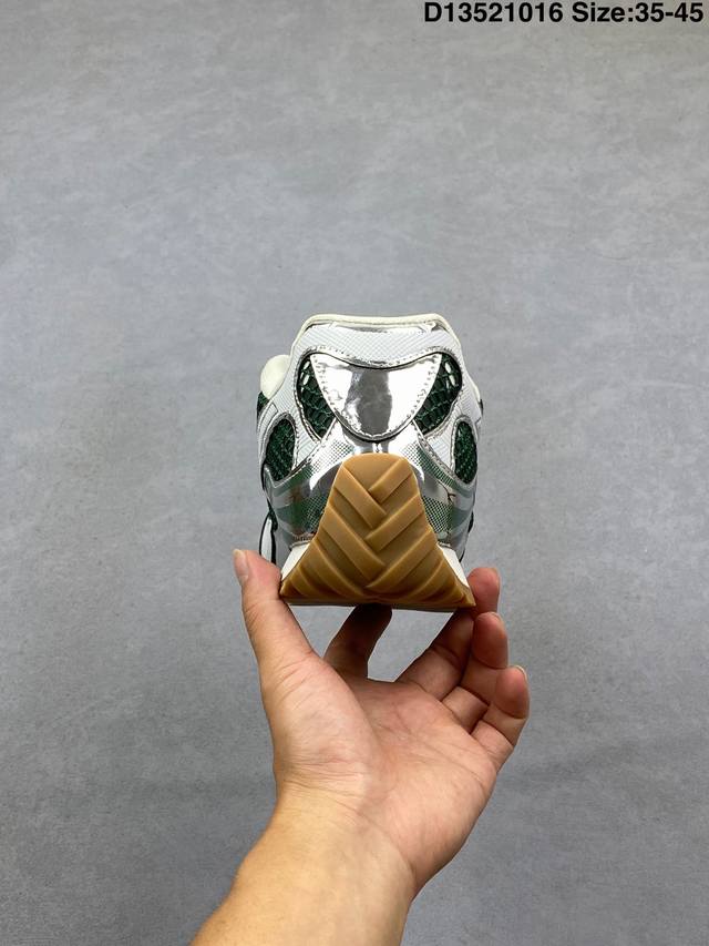 This company-grade original last and paper version features a lightweight, high-tech diamond-patterned mesh upper. It includes an embedded breathable mesh upper with a thickened PU cushioning latex insole and an external anti-deformation, wear-resistant TPU rubber outsole, paying homage to the brand's famous Intrecciato pattern! Bottega Veneta Orbit Lace-Up Low Sneakers, an Italian luxury brand, is a lace-up, low-top, breathable, comfortable, and casual sneaker in a mirrored silver/light pink finish. Sizes: 35-45. Bottega Veneta has released the new Orbit sneaker. Inspired by the silhouette of 90s sneakers, this shoe features a mesh texture and a cross-over upper made of different materials, undoubtedly paying tribute to the brand's famous Intrecciato pattern. Furthermore, the sole design is slender and elegant, extending to the back of the heel, cleverly combining sporty elements with fashion inspiration. Available in silver-white, black, and silver/parrot green colorways.