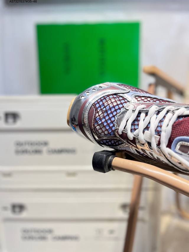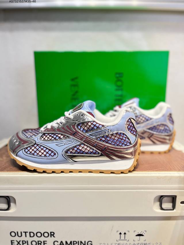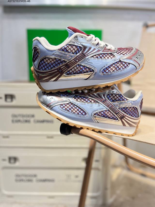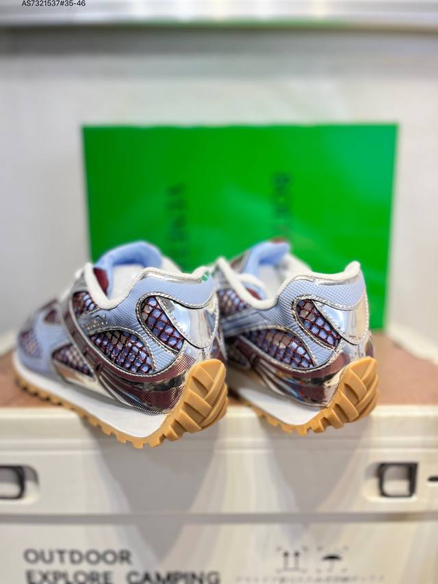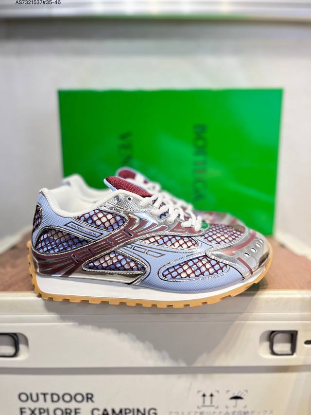Upgraded original last and paper version development model#Uses lightweight technical diamond mesh fabric upper material#Inlaid breathable mesh with thickened PU cushioning latex insole#External anti-deformation and wear-resistant TPU rubber outsole, paying homage to the brand's famous Intrecciato pattern! Italian luxury brand - Bottega Veneta - Orbit Lace-Up Low Sneakers Track Series Lace-up Low-top Breathable Comfortable Casual Sneakers "Metallic Red Wisteria Raw Rubber Sole" 755915V2X405851 DDD Sizes: 35-45 DDD Bottega Veneta releases the new Orbit sneaker. Inspired by the silhouette of 90s sneakers, this shoe features a mesh texture and a cross-overlay of different materials on the upper, undoubtedly paying tribute to the brand's famous Intrecciato pattern. In addition, the sole design is relatively slim and elegant, with the outsole extending to the back of the heel, cleverly combining sporty elements and fashion inspiration. It is available in silver-white, black, and silver/parrot green colorways. DDD Product Details DDD Technical Fabric Lace-up Sneaker Lining: Technical Fabric Rubber Outsole As7321537#35-46 DDD