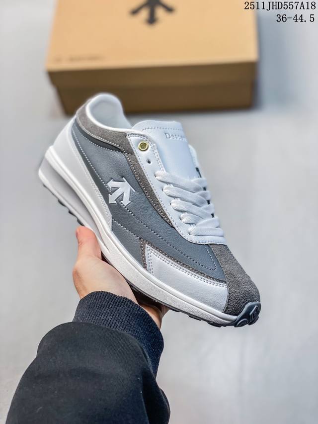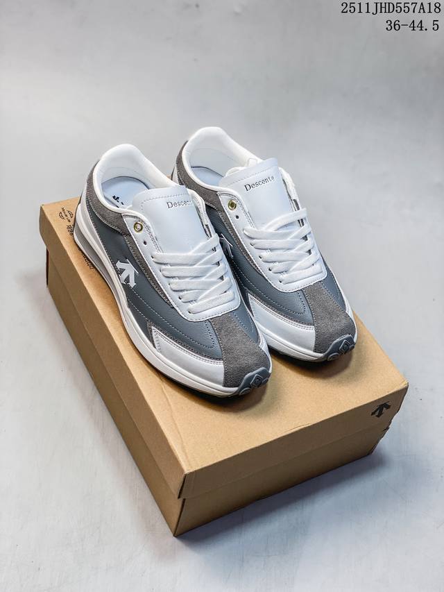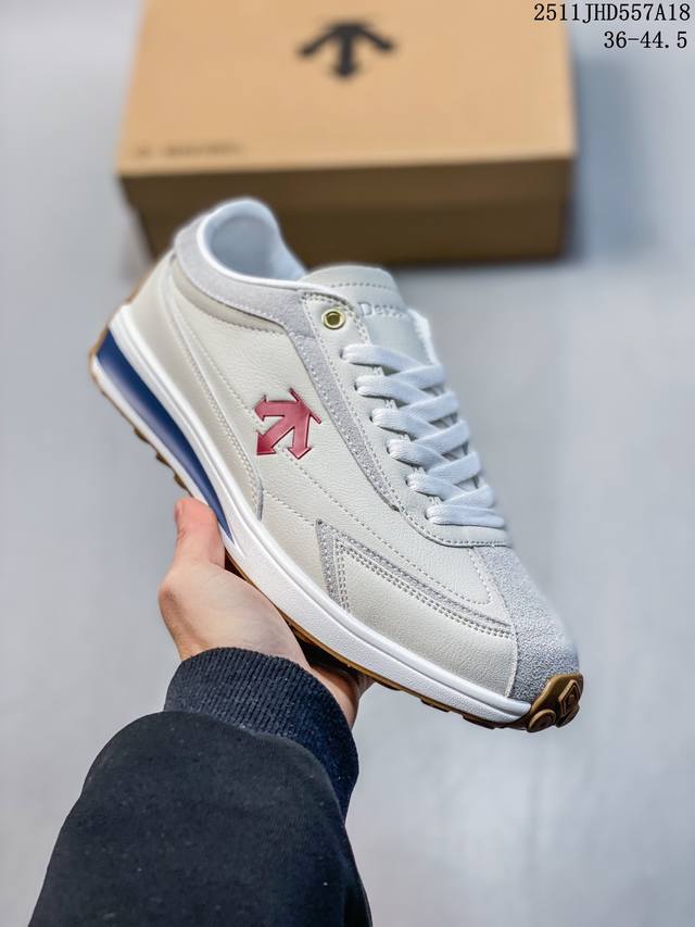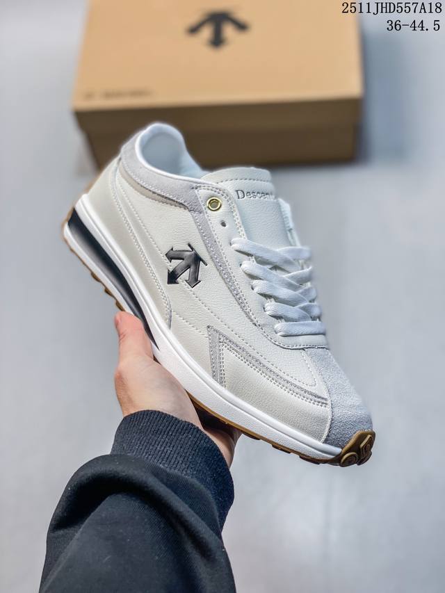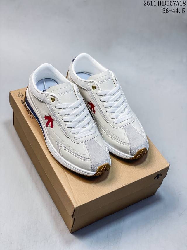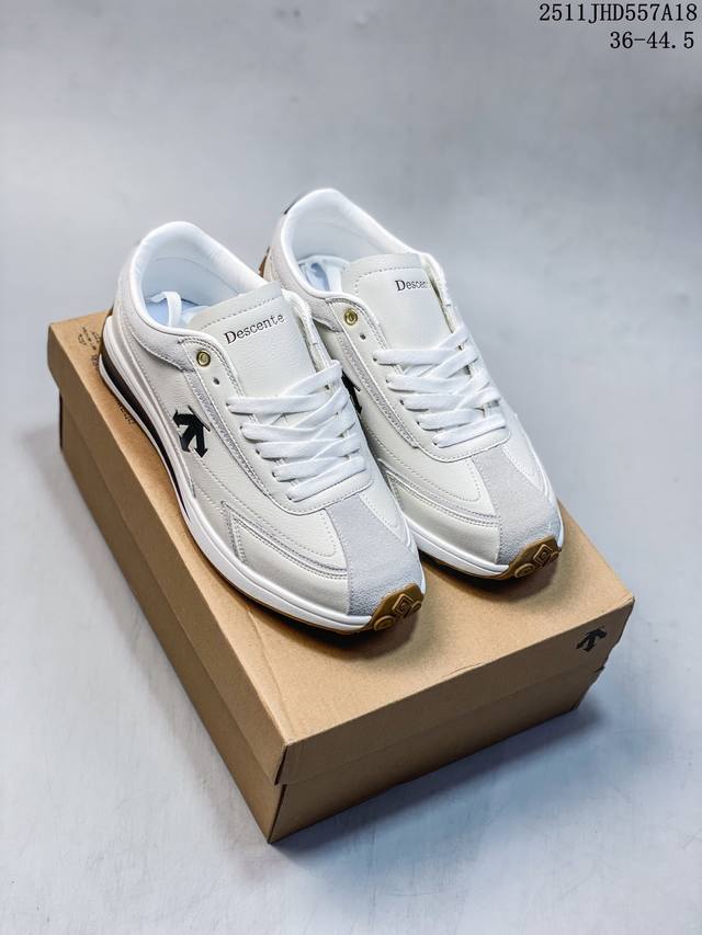 New Product: Descente Cron Racer Casual Sneakers, unisex design. The Descente Cron Racer series is a multi-scenario casual shoe that blends minimalist Japanese design with functional technology. Key features include: 1. Core Functions and Technology: All-weather anti-slip outsole: Suitable for urban commuting, rainy days, etc. EVA cushioning layer + TPU anti-torsion plate: Reduces foot fatigue after light exercise such as cycling and camping. Easy-care materials: A combination of cowhide and suede upper for easy cleaning, stain-resistant design, and antibacterial insole, suitable for students, mothers, and other frequent users. 2. Design Style and Styling: Japanese retro running shoe style: Matte leather and suede materials highlight the City Boy style. Suitable Scenarios: Light outdoor hiking, urban sports. The outsole pattern design enhances terrain adaptability. Simple and versatile, easy to wear for commuting and sports. A must-have in your wardrobe! These white sneakers feature a streamlined design that flatters the feet and makes them look slimmer. They pair effortlessly with any outfit and exude a trendy vibe! Product Code: S Lcr76 Sizes: 36-44.5 11Jhd557A18