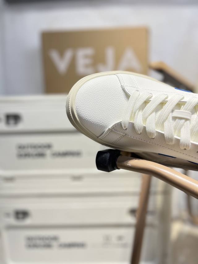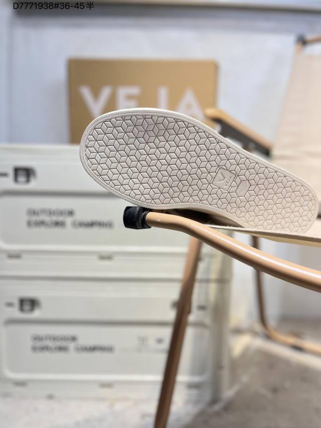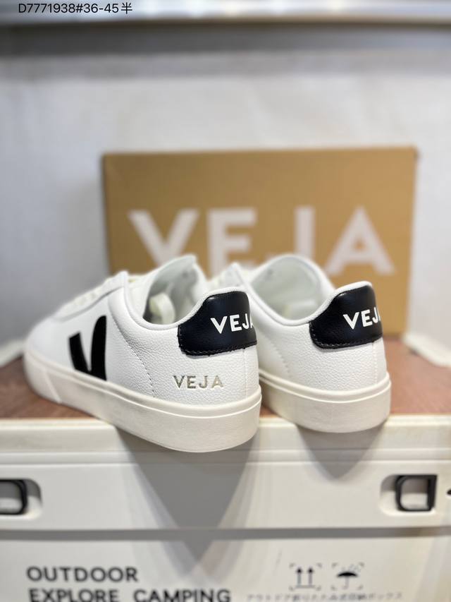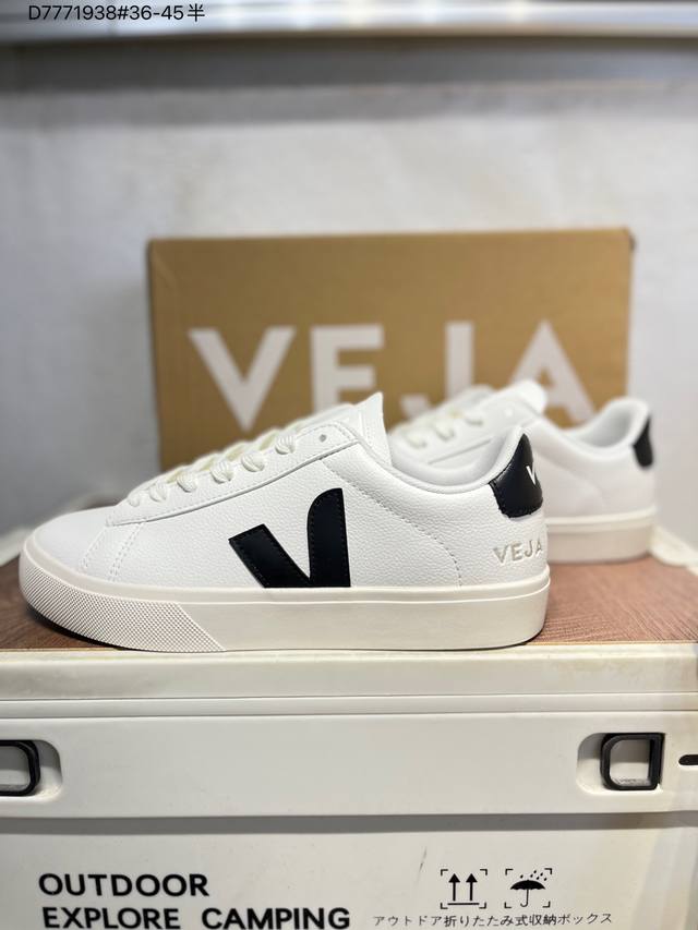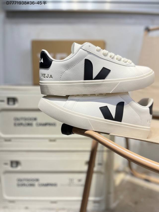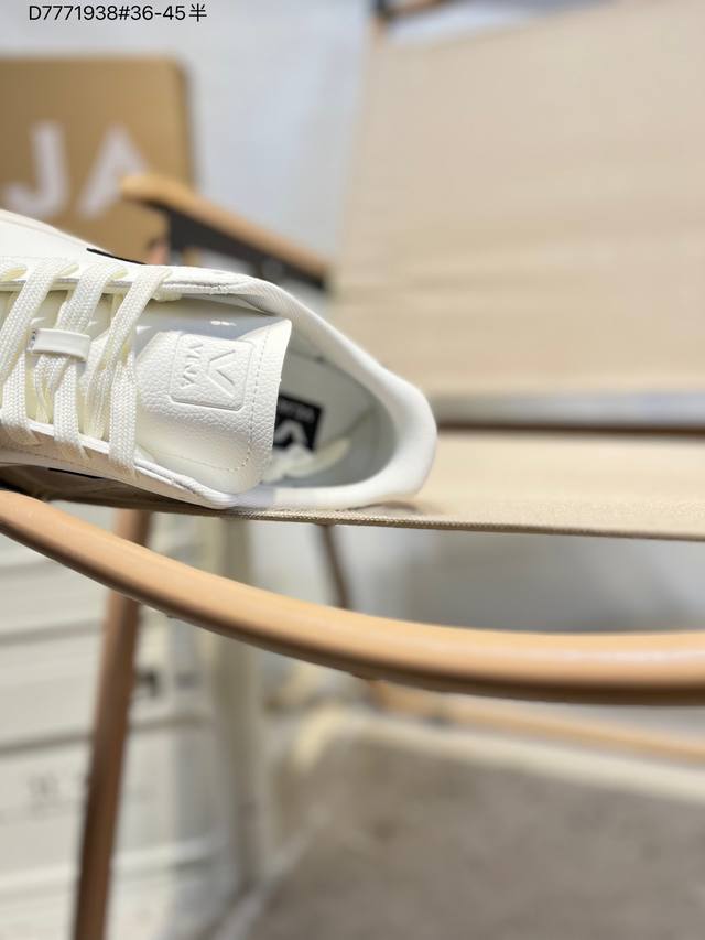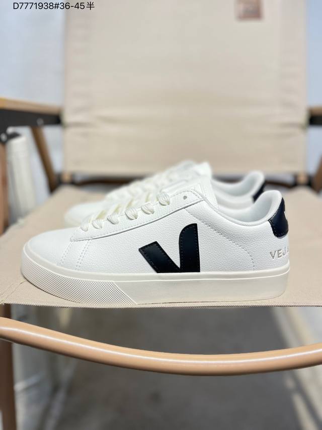 Minimalist everyday style, trendy white sneakers, Veja Campo Chrome Free Low Sneakers, a classic, stylish, versatile, thin-soled, casual, sporty white sneaker from the French national sneaker brand Veja. This Veja Campo Chromefree leather sneaker features a round toe design for comfortable wear. It has a black Veja brand logo on the side, a lace-up design at the front, and an overall black and white contrast color scheme, classic and stylish, suitable for everyday wear. The rubber flat sole provides comfortable movement. (Ea Cp0502818 D7771938# 36-45)
