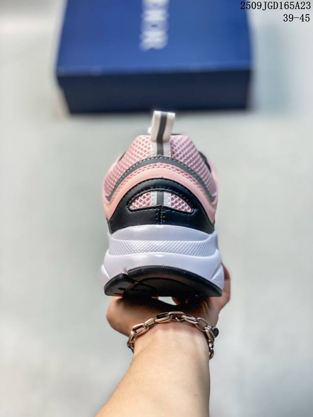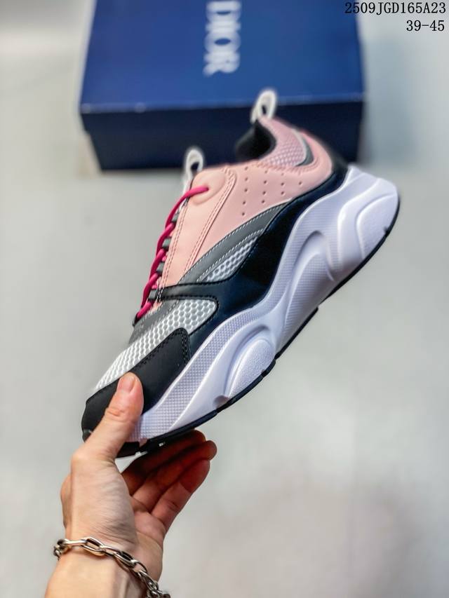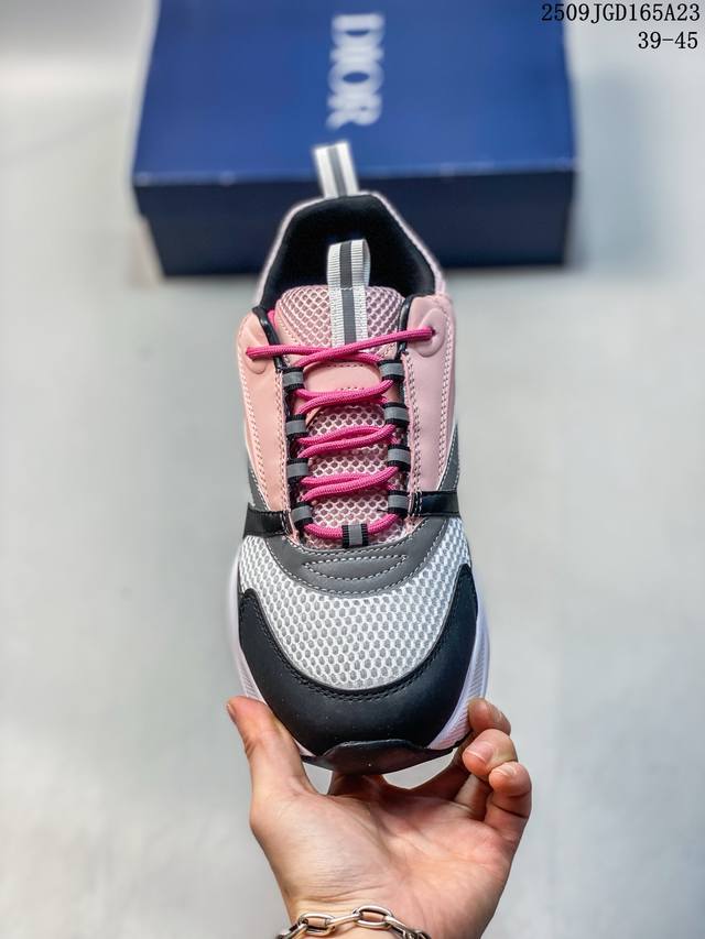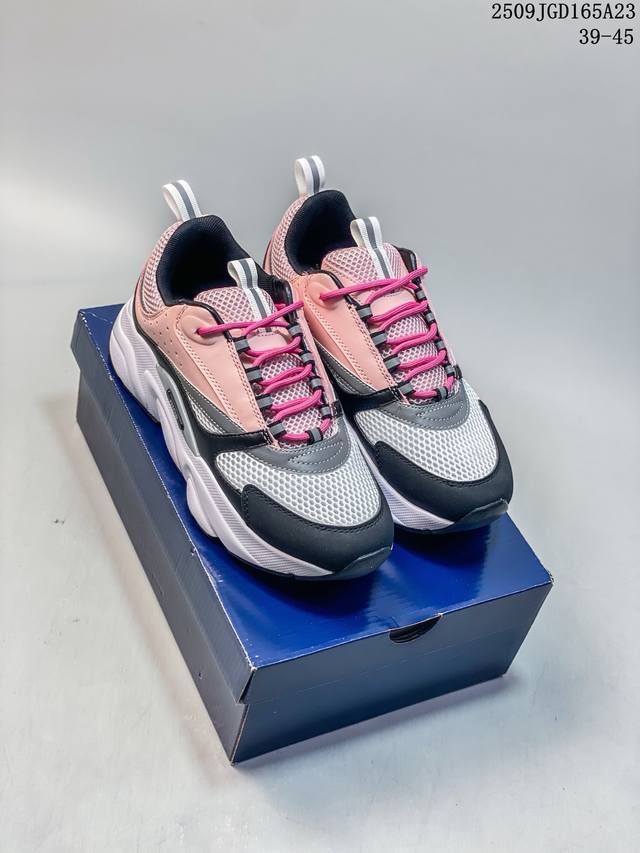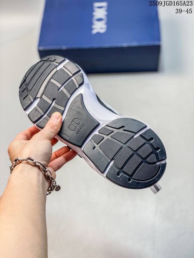 Developed from Dior's original last and paper data, this shoe features a smooth cowhide leather and mesh upper, a sweat-wicking mesh laminated to a sea glass CD-embossed insole, and an exclusive TPU stretch midsole with a glossy, durable, and serrated rubber outsole. This French luxury fashion brand, the Dior Homme B22 Trainer Sneaker, is a retro, thick-soled, dad-style casual sports jogging shoe. Size: As shown. Code: 09Jgd165A23