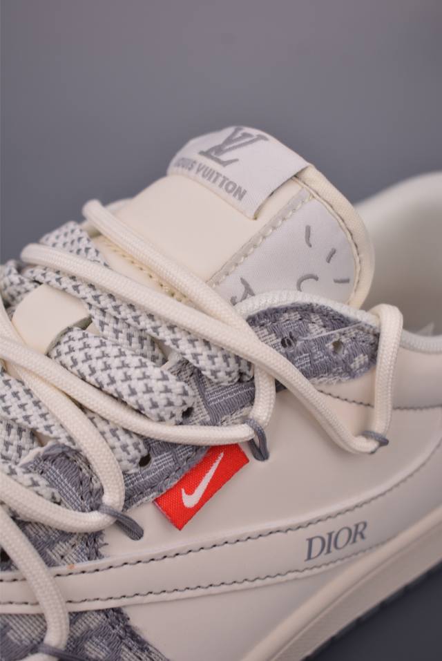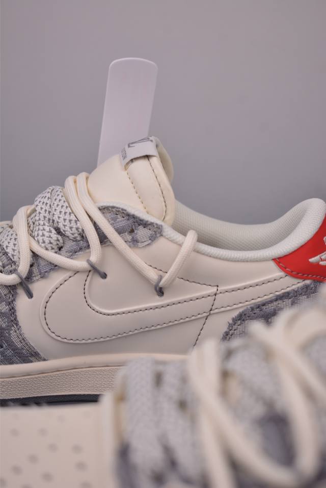 The new three-party collaboration low-top reverse swoosh upper continues the black toe design. The entire shoe is made of lychee leather, with a white reverse swoosh waistband and embellished with Travis Scott's iconic logo. The heel is dominated by Fujiwara Hiroshi's most famous blue color, completing the white, blue and black design style of Fragment Design. The left and right feet are decorated with Travis Scott's ghost face and Jordan's flying wings respectively, highlighting the luxurious style of the three-party collaboration.