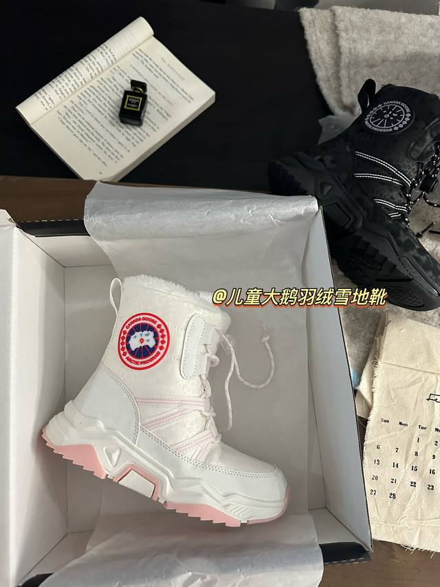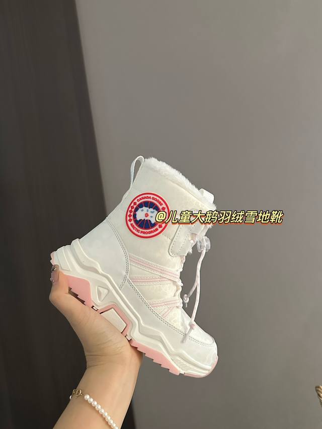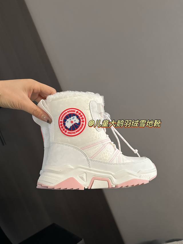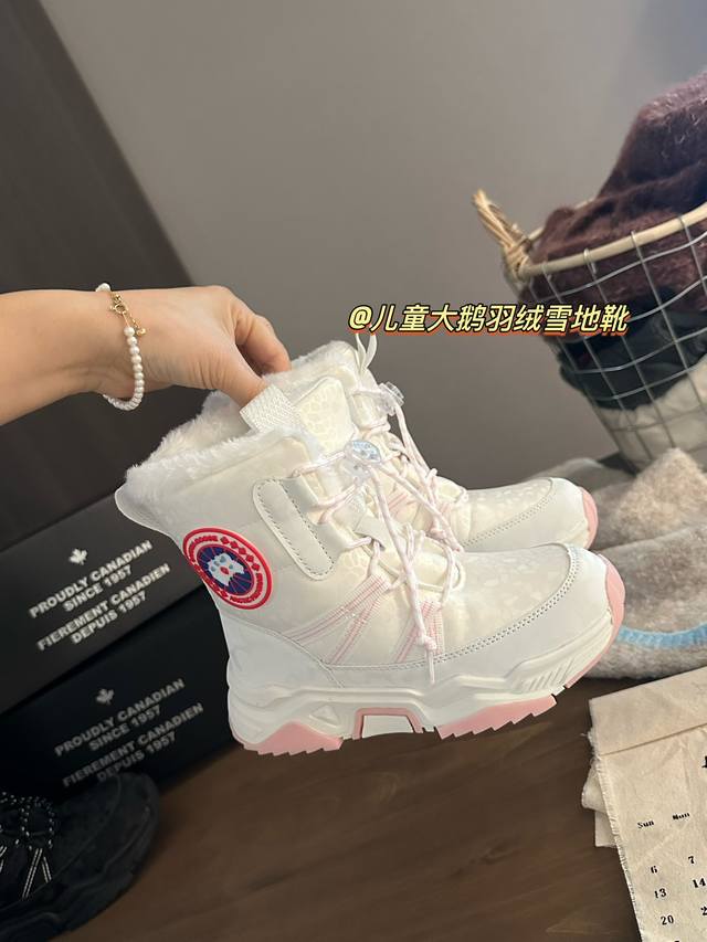 Light pink and white, not bulky and easy to wear. Stylish, comfortable, and versatile; very comfortable for babies to walk in. New Canada Goose fleece-lined high-top down children's snow boots. Size: 30-37. Superb Canada Goose series design. High-top style, warm and windproof. Adjustable laces with buckle design. Durable and non-slip rubber outsole for a great feel.
