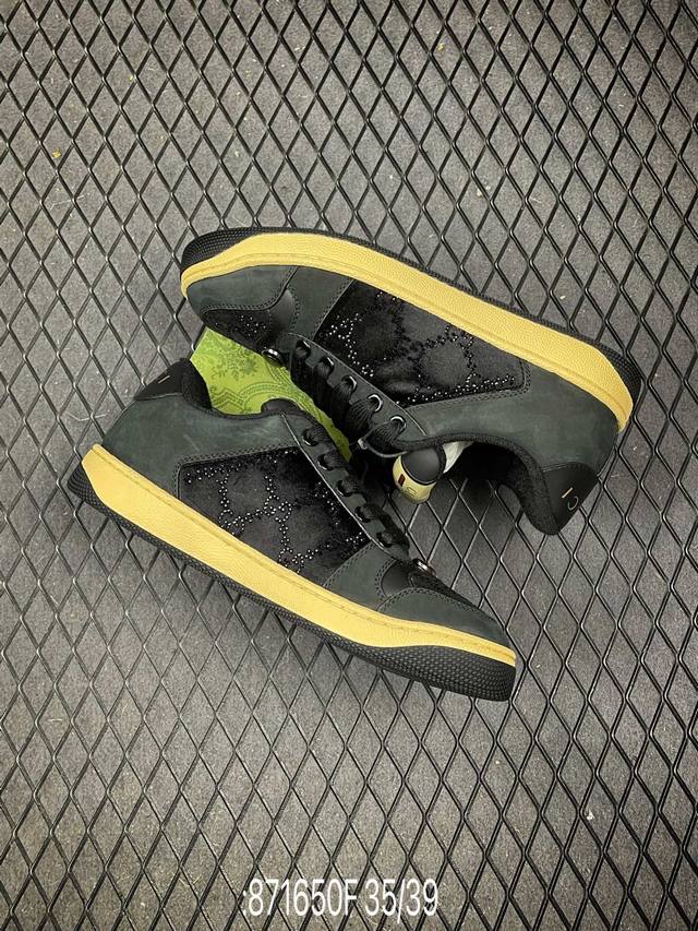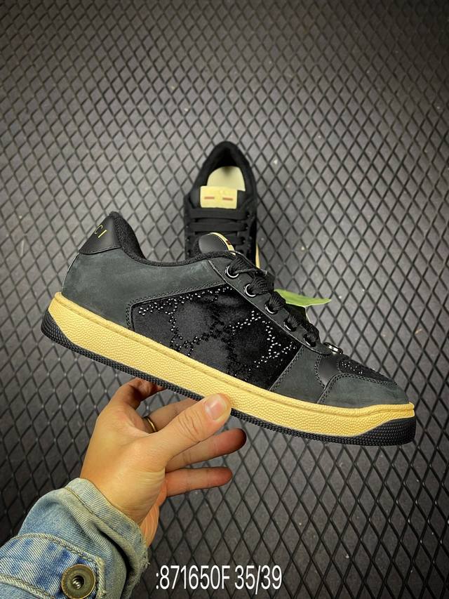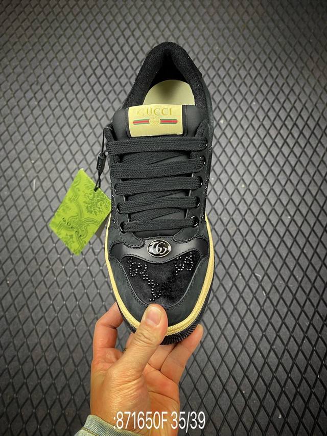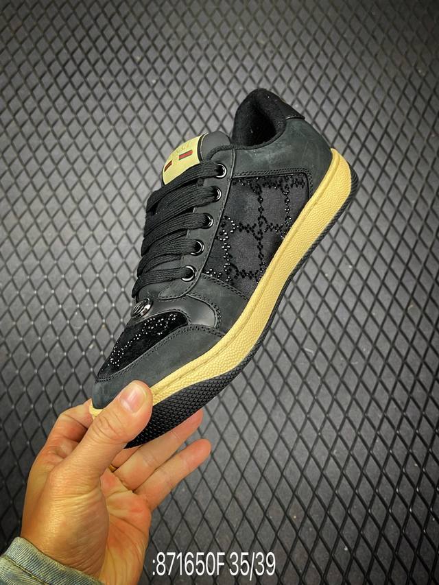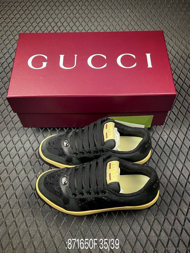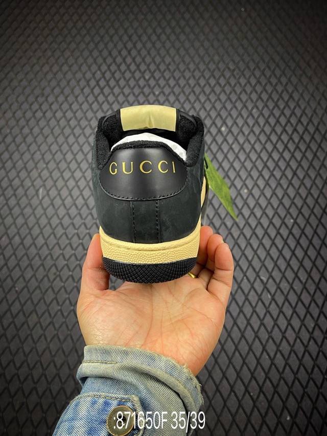 FGucci~~2026 latest colorway distressed sneakers, casual shoes, sports shoes. Genuine original version developed by Ddd Zp; metal double G crystal cylindrical label; Gucci original textured webbing. Upper: top-layer sheepskin spliced with double G embossed cowhide, leather edge with full oil-sealed closure, original water-dyed sheepskin lining, delicate, soft, comfortable, and breathable; insole: latex injection molding; private mold stamped two-tone original TPU outsole: wider lower layer, narrower upper layer. Sizes: 35-39. Code: 871650F.