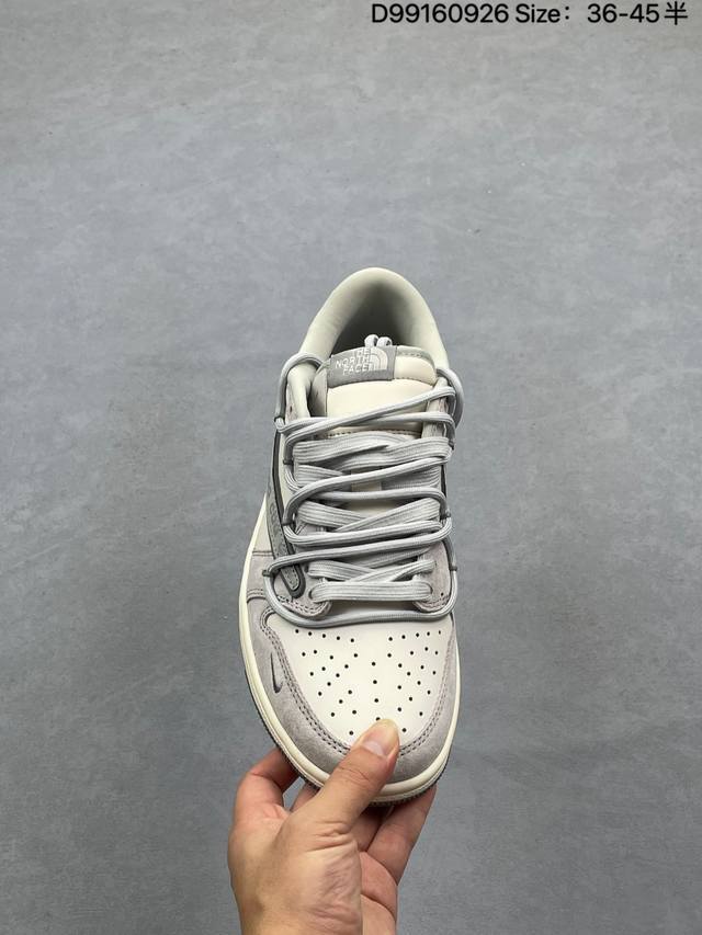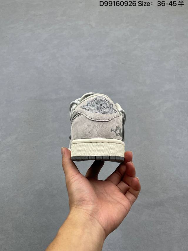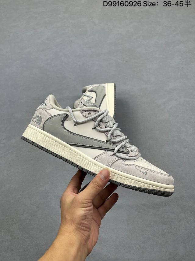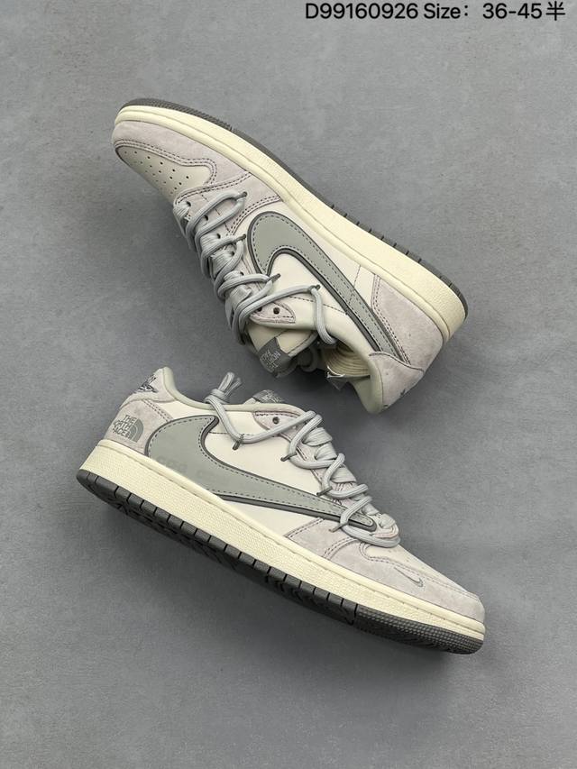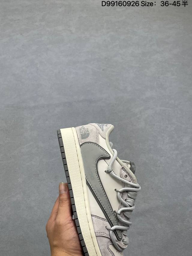 The new three-party collaboration low-top reverse swoosh upper continues the black toe design. The entire shoe is made of lychee leather, with a white reverse swoosh waistband and embellished with Travis Scott's iconic logo. The heel is dominated by Fujiwara Hiroshi's signature blue color, completing the white, blue and black design style of Fragment Design. The left and right feet are decorated with Travis Scott's ghost face and Jordan's flying wings respectively, highlighting the luxurious style of the three-party collaboration.