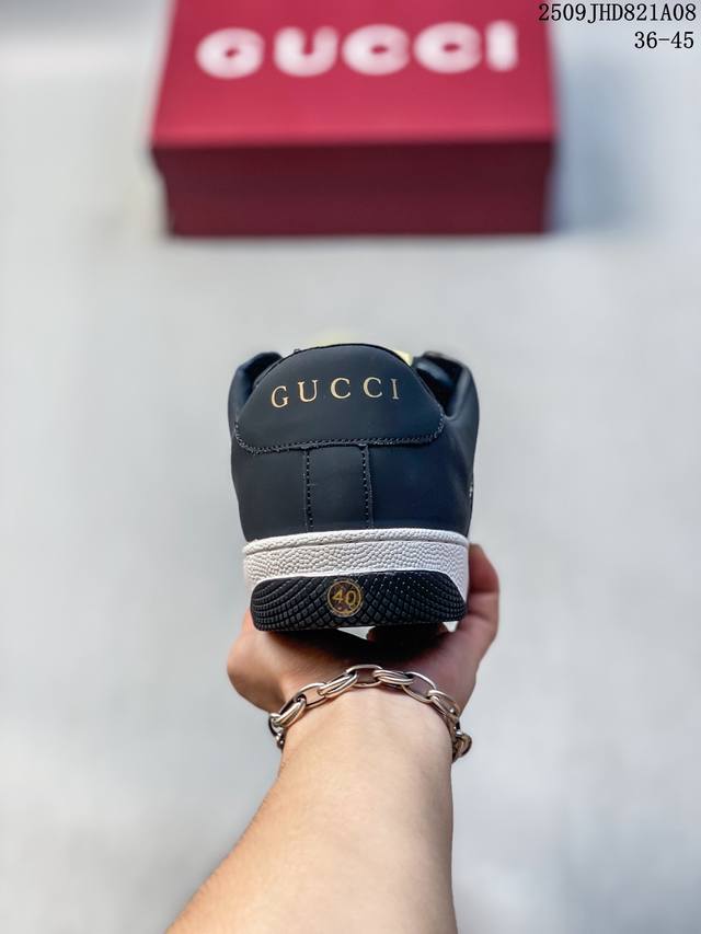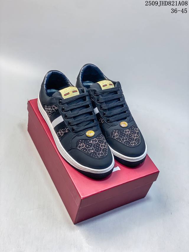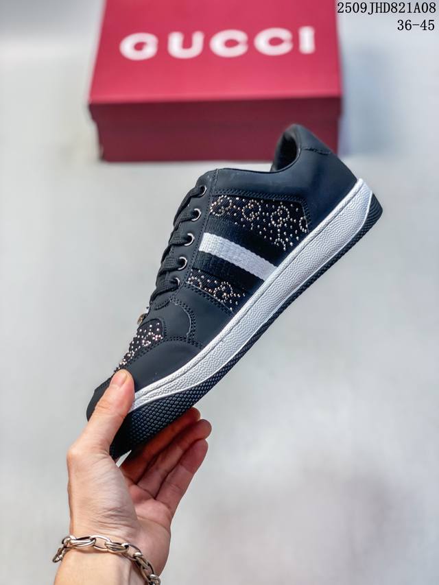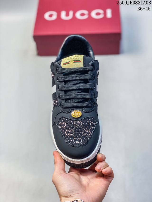 Gucci Men's and Women's Imperial Edition Gucci Screener Collection shoes feature distressed, dirty shoes, stylish thick-soled, height-enhancing retro sneakers. The retro preppy style and fabrics infused with nostalgic sportswear have been popular for decades, creating a symphony of different styles that provides rich inspiration for the early spring collection. Inspired by classic 70s sneakers, these shoes feature a monogram finish on the sides and a special treatment for the vintage Gucci logo, creating an overall distressed effect. They feature vintage-style nylon webbing, canvas details, a terry fleece lining, and a thickened sole specially treated for a vintage, distressed effect. They are adorned with a metal Double G oval enamel detail and a vintage Gucci logo on the label. The thickened two-tone sole creates a noticeable height-enhancing effect. Made in Italy!
