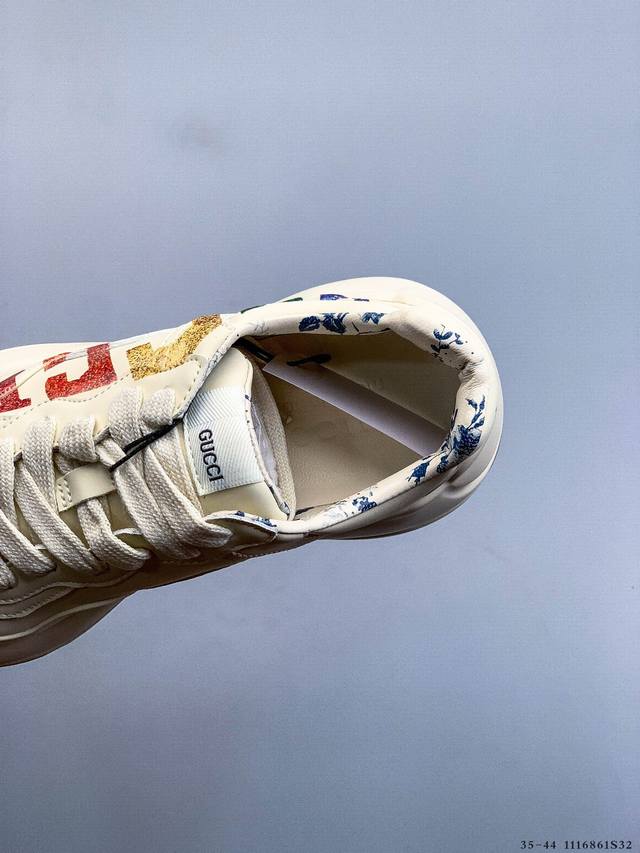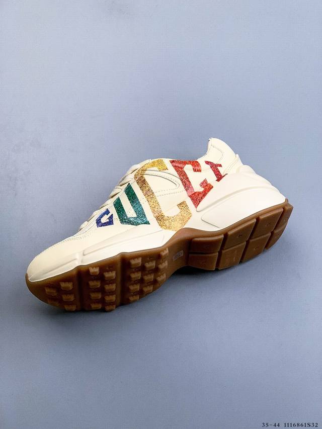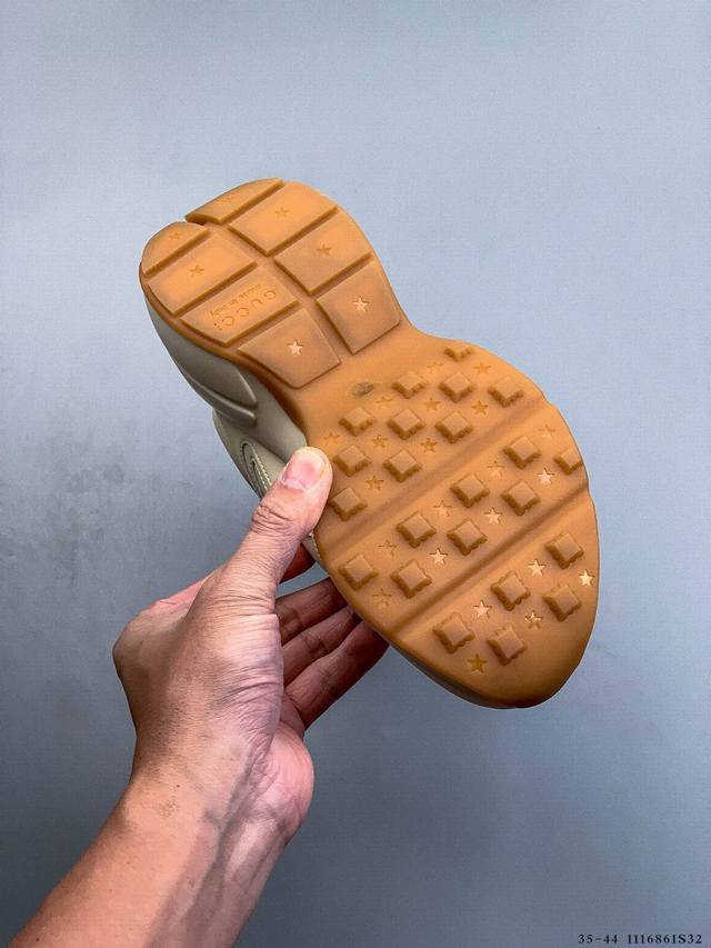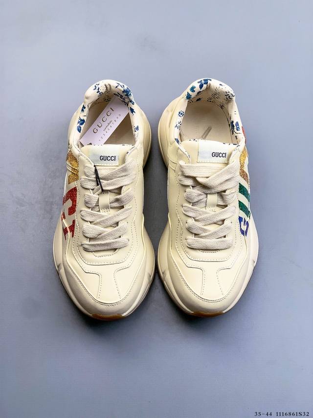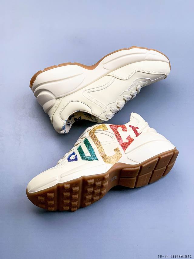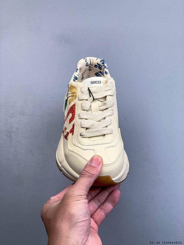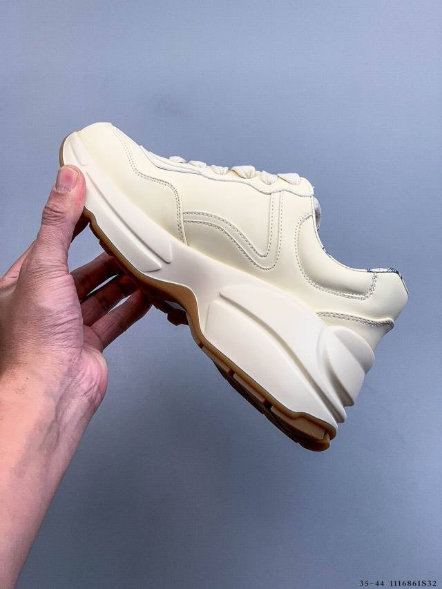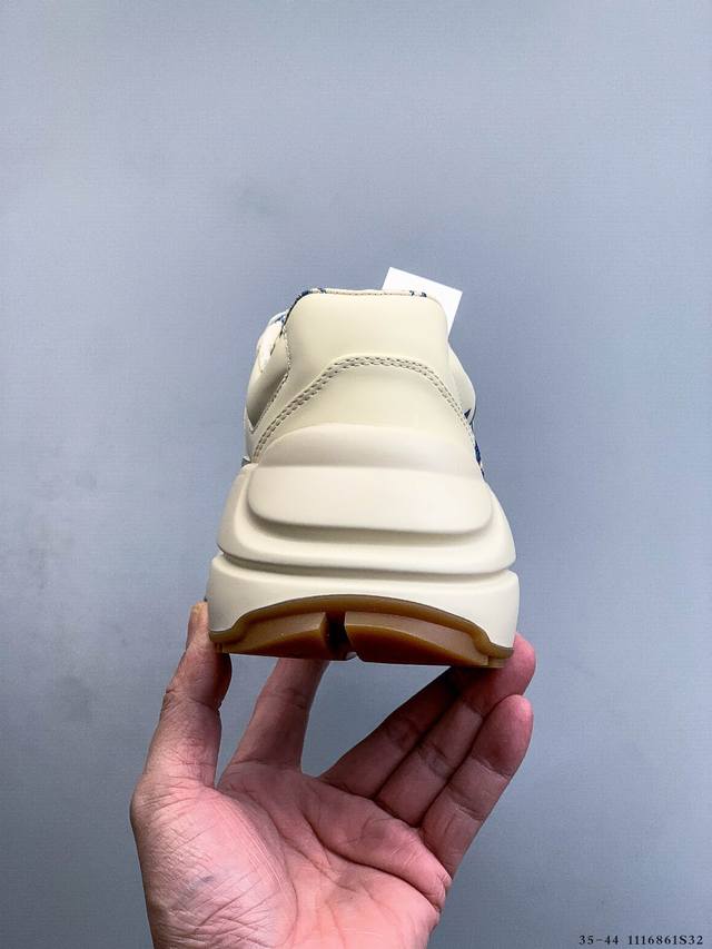 Gucci Rhyton Vintage Trainer Sneaker, distressed leather horn-shaped retro running shoes. The fading Balenciaga grandfather trend gives way to the fashion world's trendsetter, Gucci grandfather shoes. #Italian handmade factory, original last# Original calfskin upper, lambskin lining, highest fidelity to the original shoe, TPU material sole with wear-resistant foam. DDD 1116861S32 DDD