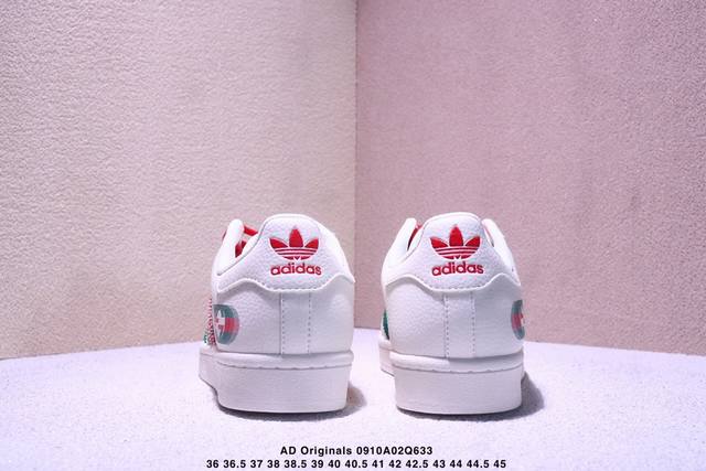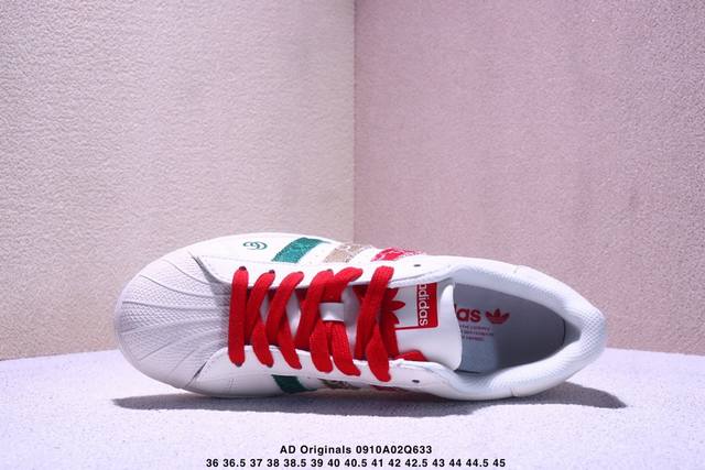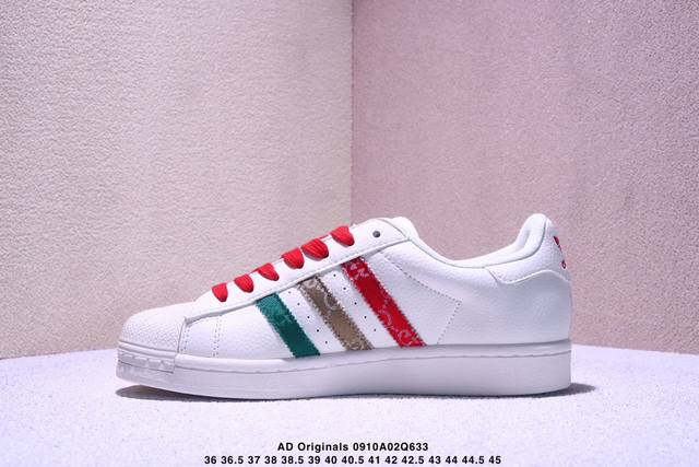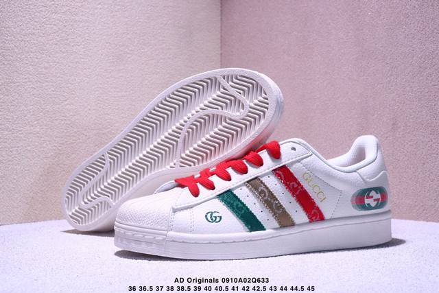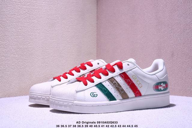Pure Original Clot X Ad Originals #ShellToe Gucci Limited Edition collaboration. Made of soft, laminated leather and featuring a red, brown, and green three-stripe colorway, this shoe's overall design and style are truly Clot-inspired. The shoe's main colorway is effortlessly stylish, while the thickened zigzag outsole and signature shell toe design further highlight its unique character.