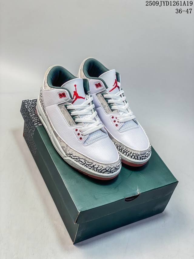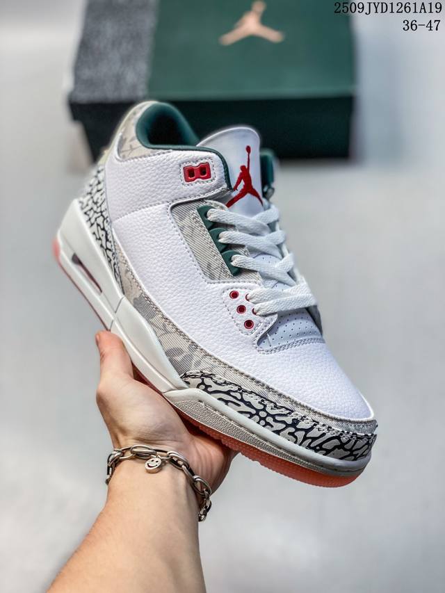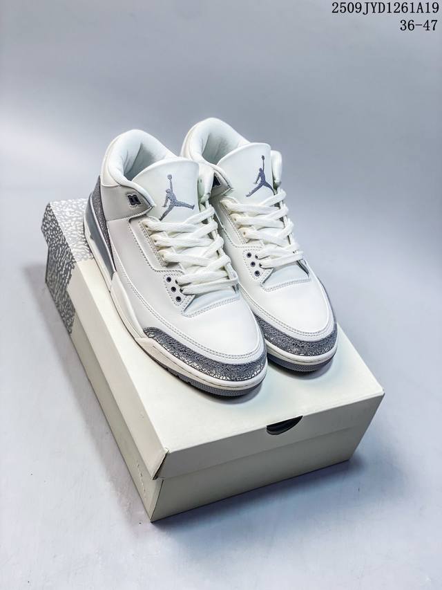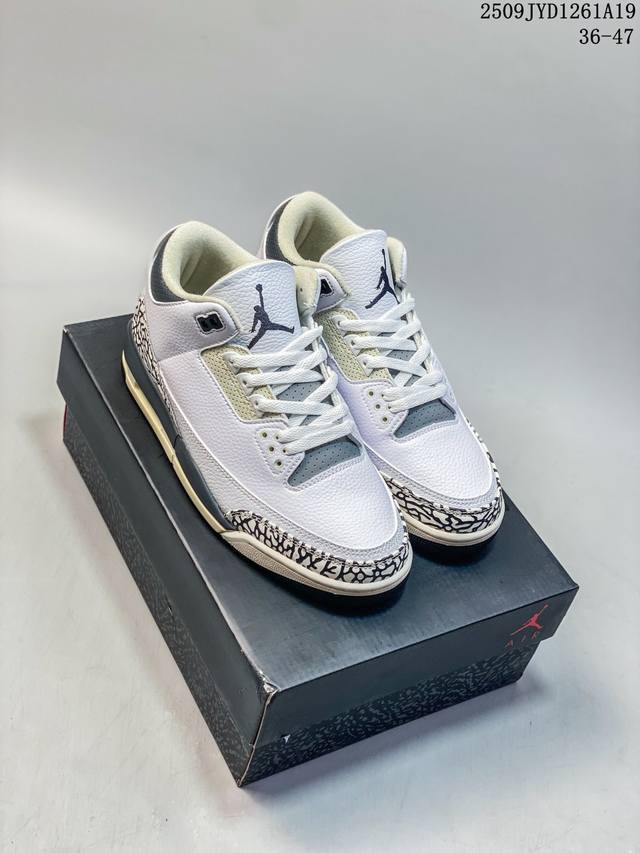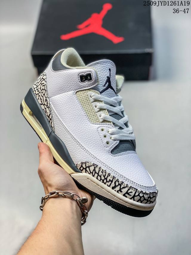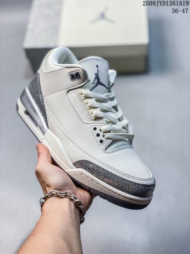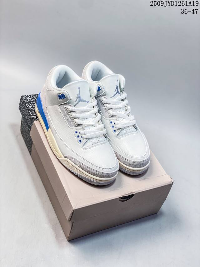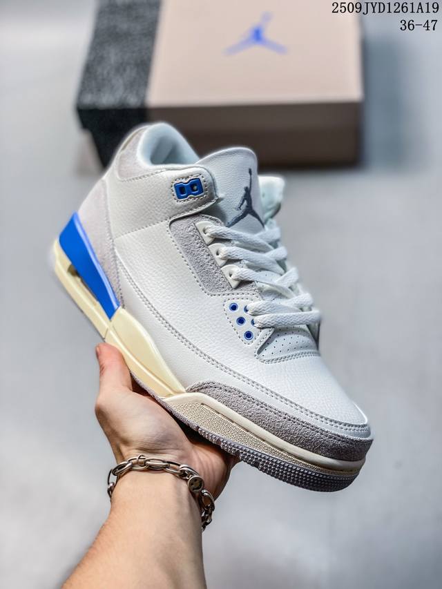 A Ma Maniere x Air Jordan 3 Retro Diffused Blue Joint White, Black and Blue Aj3 Jordan 3 Generation Aj3 Joe 3 Joint White and Blue Jordan Basketball Shoe Series, this time a collaboration between Atlanta fashion store A Ma Maniere and Jordan Brandt, continues the ultra-high specifications; the entire shoe body is covered with a large area of white lychee texture, and the classic crackle pattern on the toe and heel is replaced with a highly textured black suede patchwork, bringing a unique temperament different from other Air Jordan 3s and creating a different texture; the tongue, shoelace eyelets and shoe collar are made of black suede. The off-white TPU heel is decorated with the original Nike Swoosh logo and Air. The lining is made of diamond texture material, continuing Amm's usual high- standard design. In addition, the tongue is decorated with a blue Jumpzman logo and A embroidery, highlighting its co-branded identity. Finally, the overall design is completed by a distressed oxidized midsole, a black outsole and blue Nike lettering.