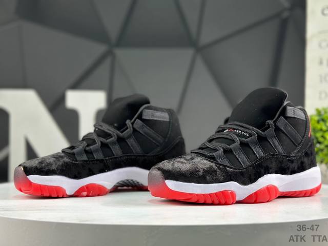 Air Jordan 11 Retro Wmns Bred Velvet High-Top Black/Red Velvet. This shoe features a predominantly black velvet colorway, with the most striking feature being the replacement of the original patent leather with a special velvet material, giving it a novel look. Additionally, the heel is adorned with a unique metallic red Jumpman logo, adding a touch of sophistication. Finally, a white midsole paired with a dark blue crystal outsole completes the design. Official Style Code: Db5457-061 Sizes: As shown in the picture.