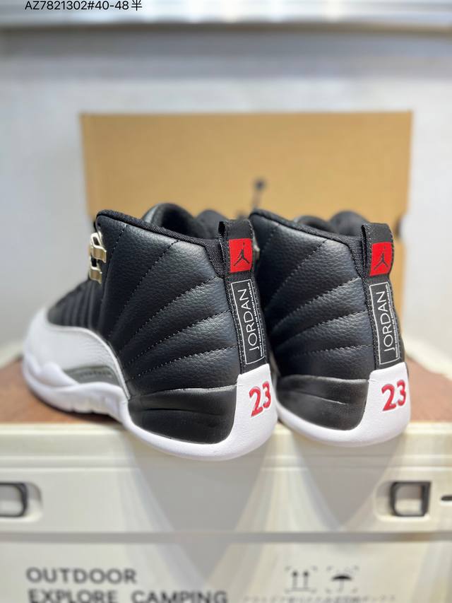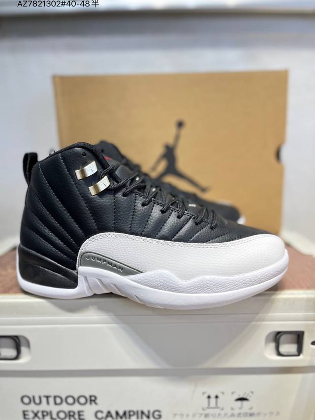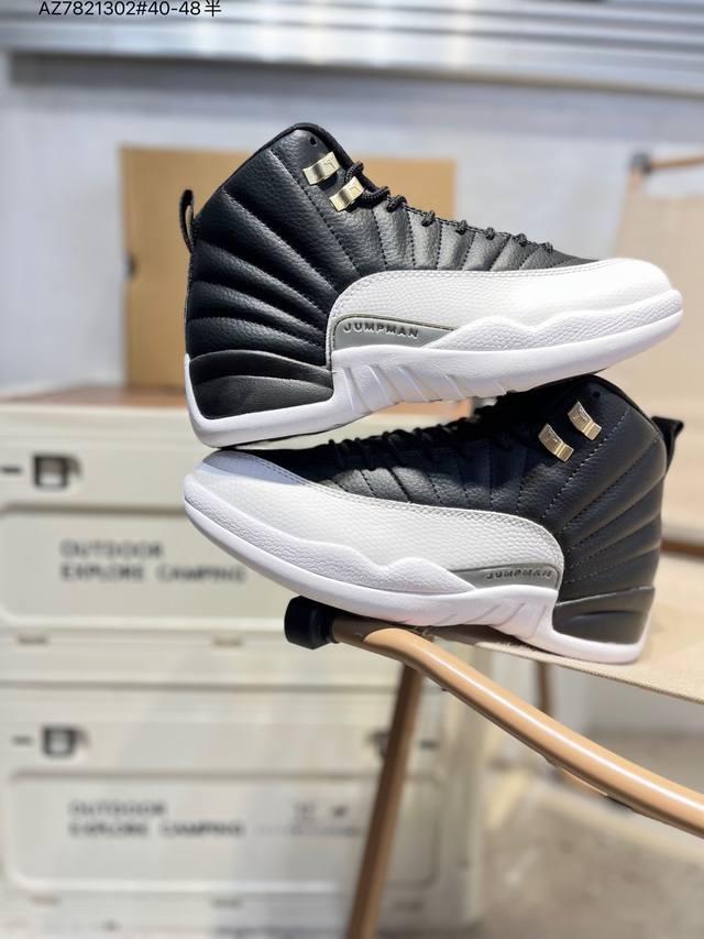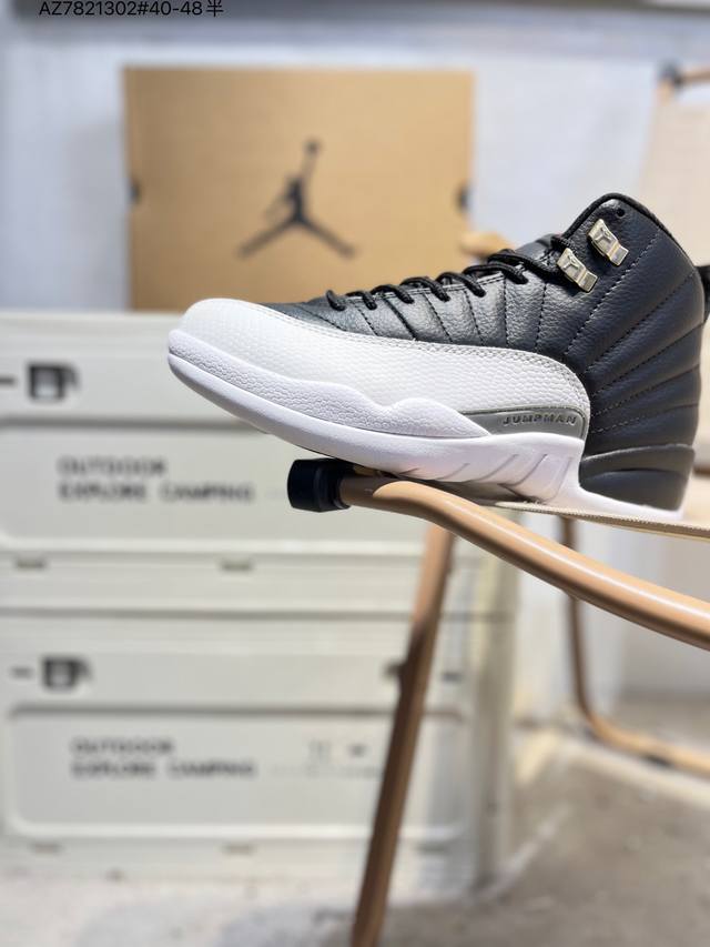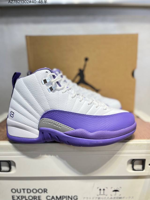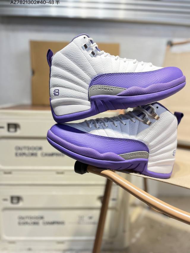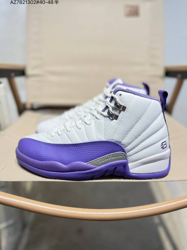 Air Jordan 12 Retro French Blue High-Top Retro French Blue AJ12, Jordan 12 High-Top Retro White and Blue Jordan Basketball Shoes Series French Blue 2025. The overall design continues the classic Air Jordan 12 silhouette. The upper is made of white leather with a blue pebbled textured frame overlay. The white Jumpman logo on the toe is particularly eye-catching against the white and blue main color scheme. The tongue is decorated with a college blue Jumpman logo and the "Two3" lettering, echoing the metal silver buckle on the side. The classic J.J. Jumpman logo on the tongue is presented in blue embroidery, showing great attention to detail. The midfoot features a gray mudguard, and the heel pull tab features a white Jumpman logo and embroidered Jordan lettering, along with the iconic red "23," highlighting the shoe's identity. It is equipped with Air Zoom cushioning and a large carbon fiber plate, providing excellent cushioning and stability.