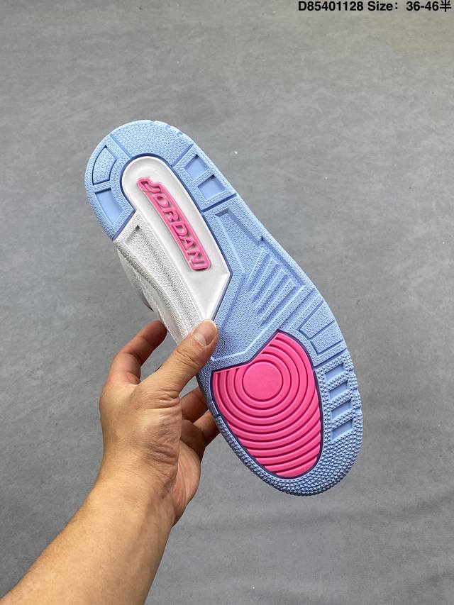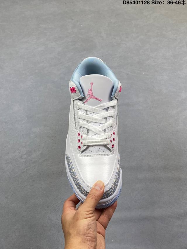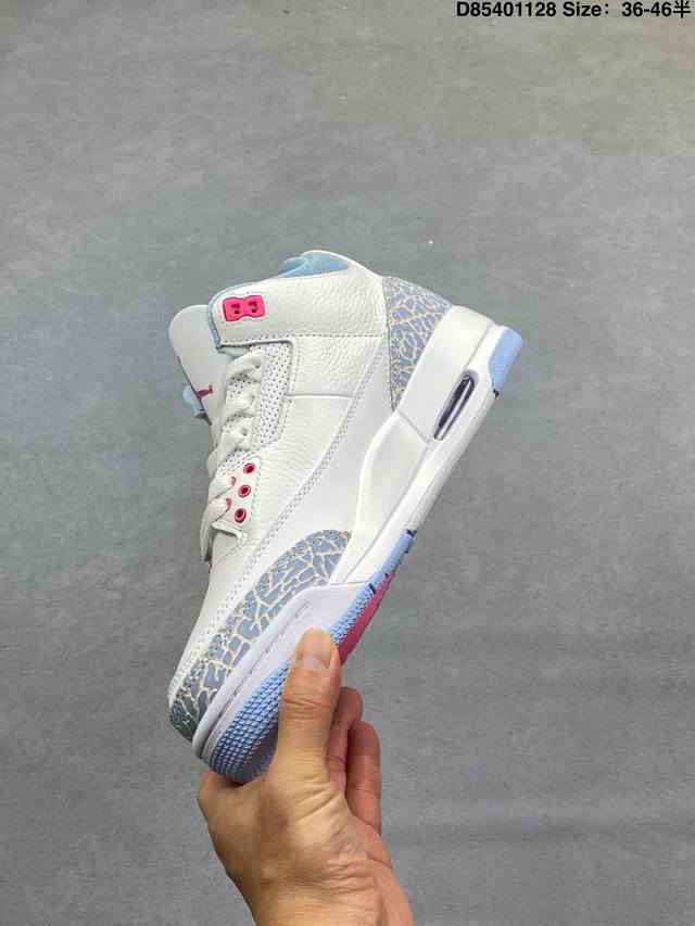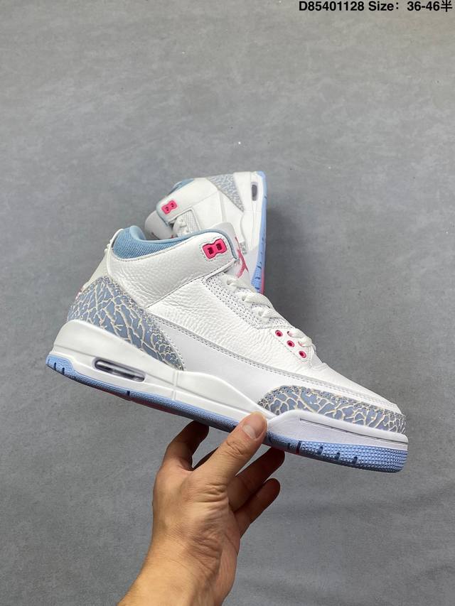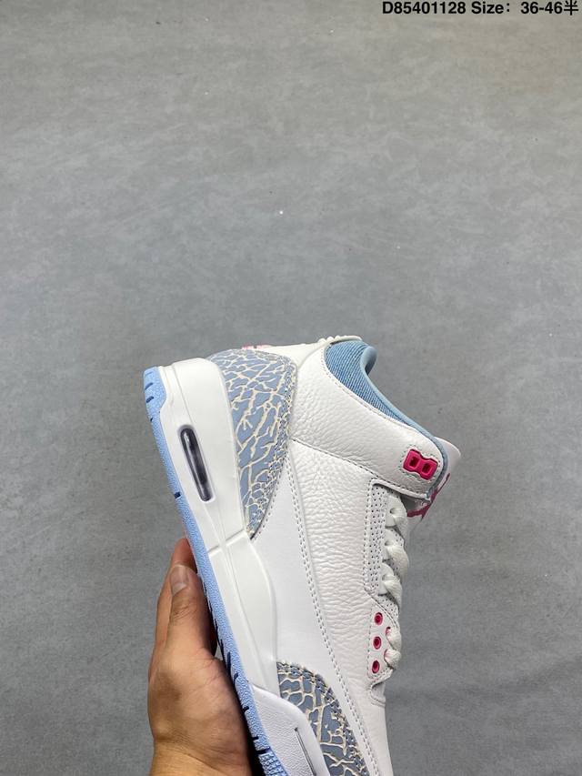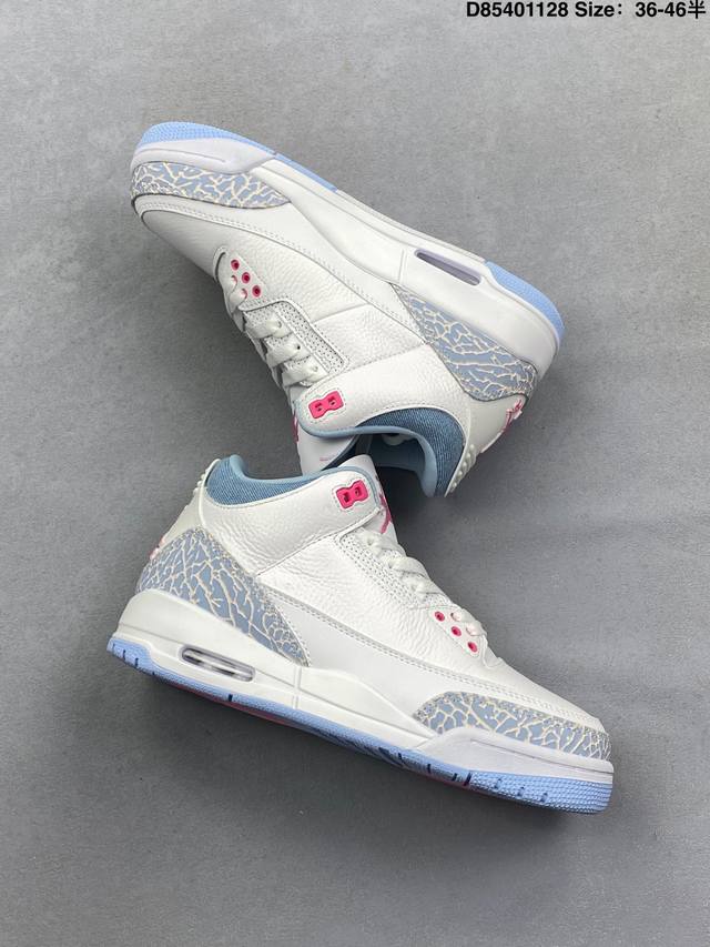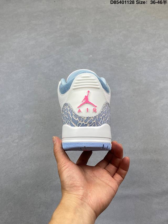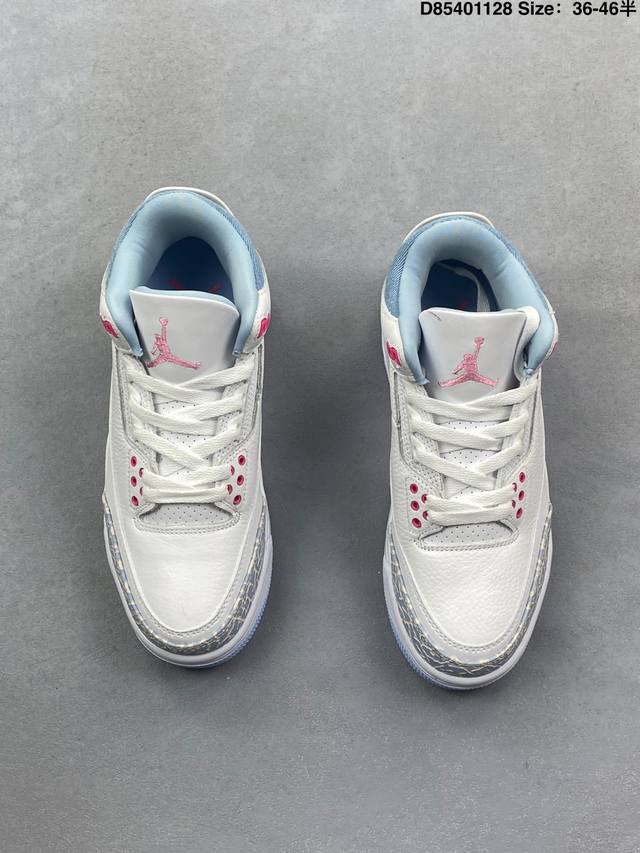 Air Jordan 3 Retro White And Cobalt Bliss AJ3 Jordan 3, a basketball shoe series featuring a pure white leather base, creating a clean and refreshing visual tone; the fresh and eye-catching cobalt blue, with its interwoven blue elephant pattern, gives the shoe a unique artistic look, retaining the charm of the AJ3's iconic elements while injecting new fashion genes; the collar is covered with denim material, providing a soft touch for a comfortable wearing experience, while the retro denim style collides and blends with modern trends, creating a unique and trendy appearance. The highlight of this design is undoubtedly the vibrant and lively pastel fluorescent color. From the eyelets to the Jumpman logo on the tongue and the Jordan lettering on the outsole, fluorescent pink sparkles like stars, cleverly distributed throughout the shoe, instantly igniting a vibrant atmosphere and adding a dazzling touch to the overall look. The Jumpman logo and Air element on the heel are also adorned with three-dimensional fluorescent pink accents, showcasing the ingenuity of the design. Product Code: Hq0784-10 Code: D85401128 Size as shown