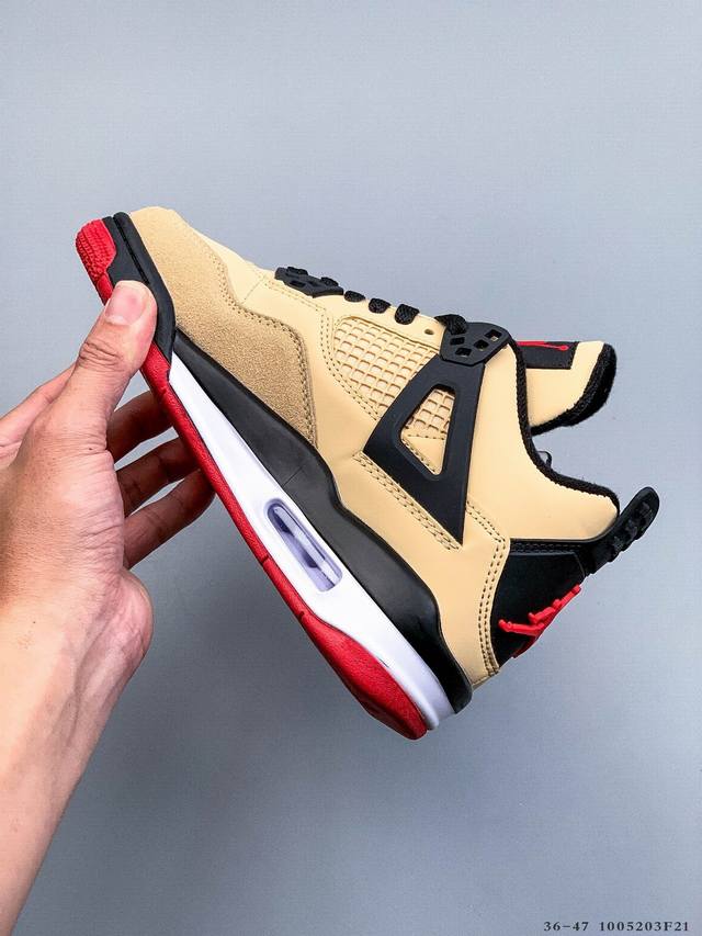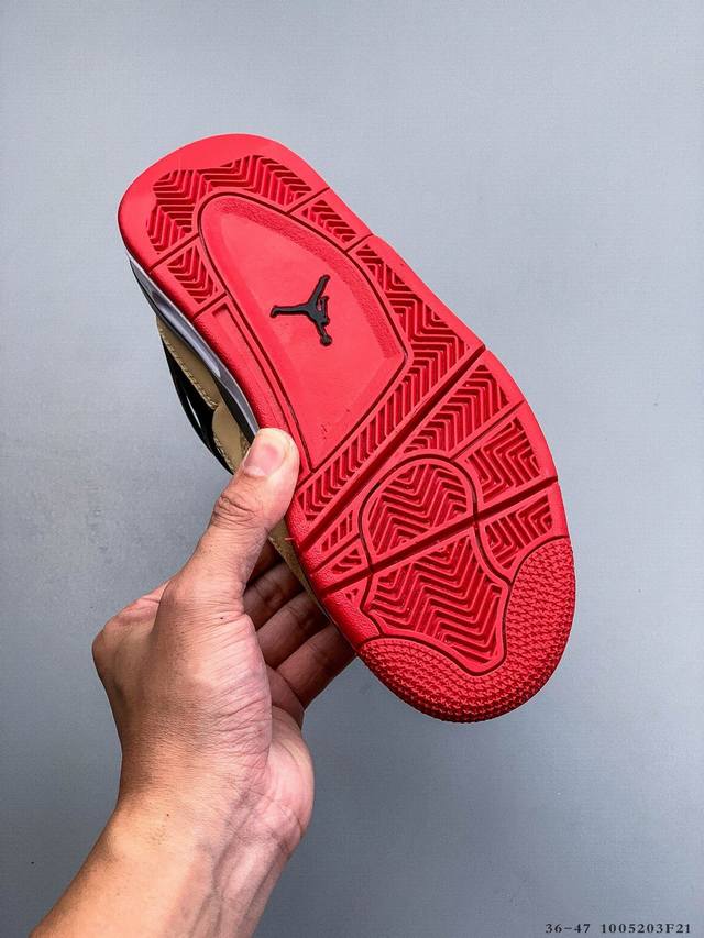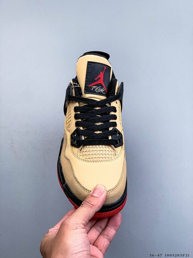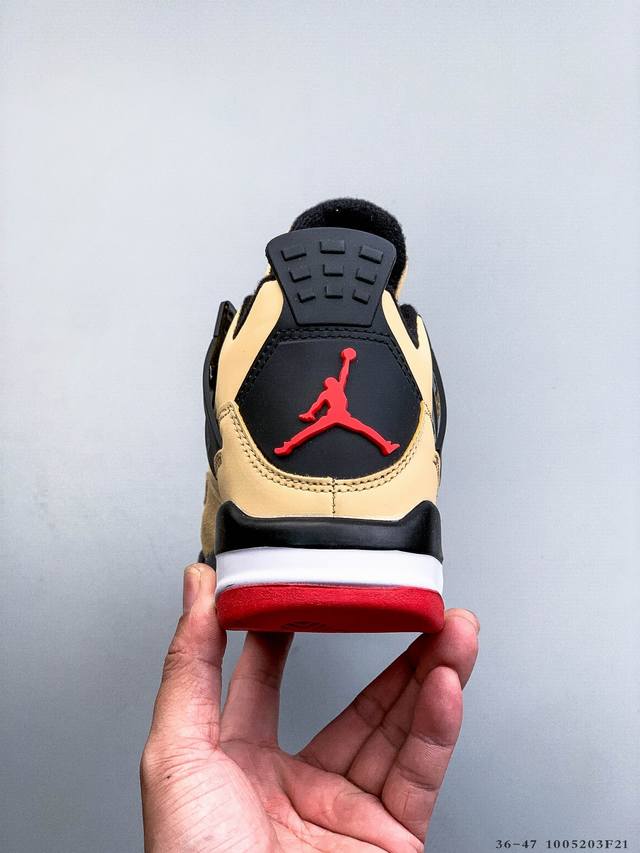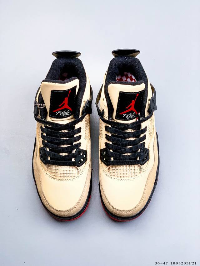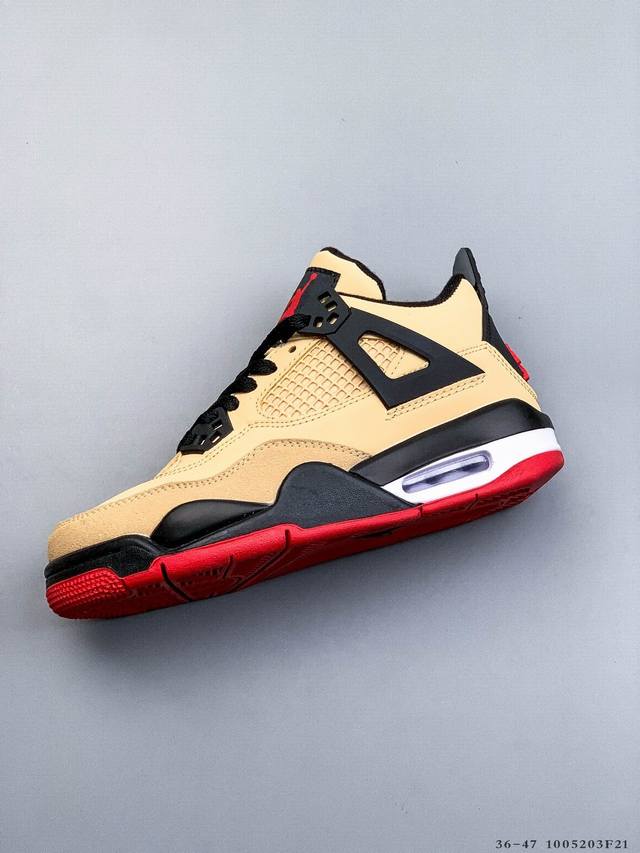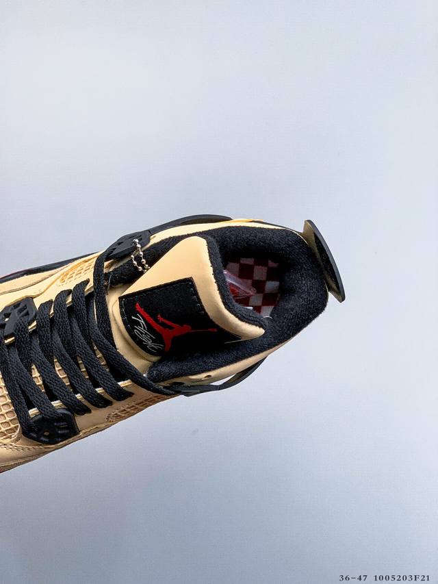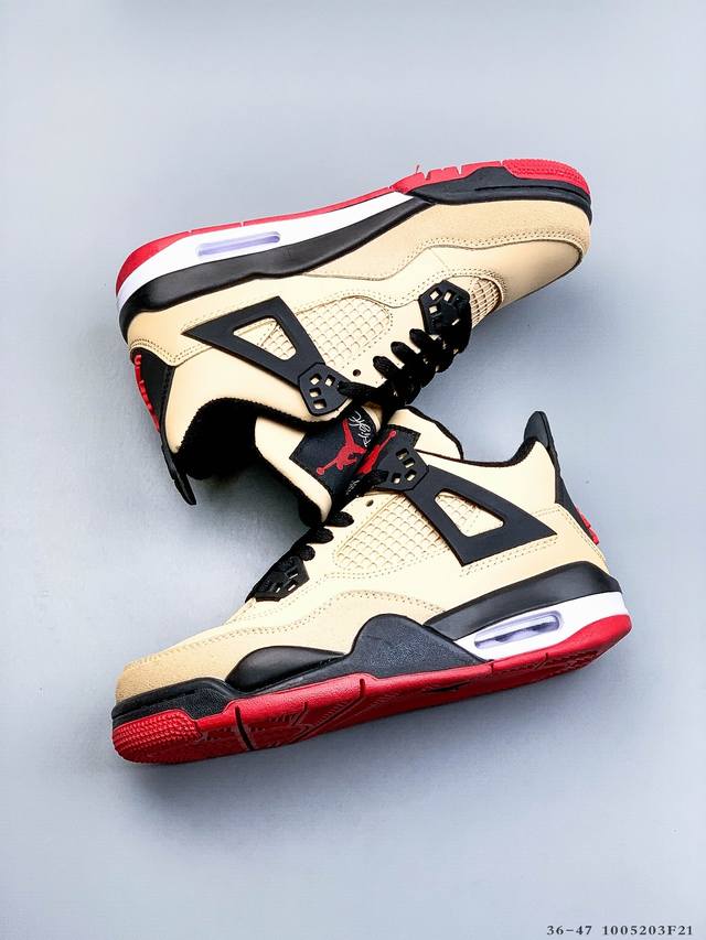 Air Jordan 4 AJ4 mid-top retro casual basketball shoe. Adhering to the design philosophy of lightweight speed basketball shoes, this shoe reduces weight while improving comfort. The midsole continues the use of a split, visible Air Sole unit in the heel. The lacing eyelets and heel pull tab are inspired by basketball nets, cleverly integrating basketball into the shoe's design, giving it a fluid, rhythmic, and elegant feel. (