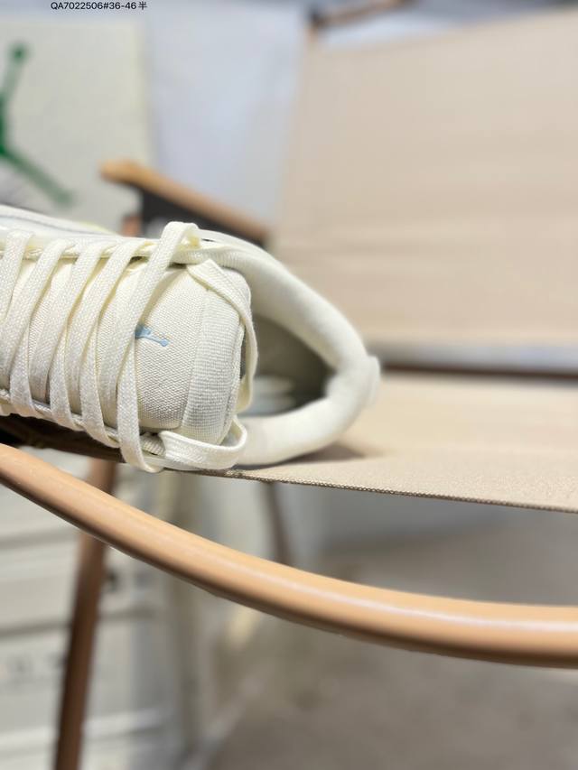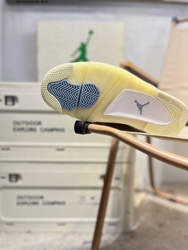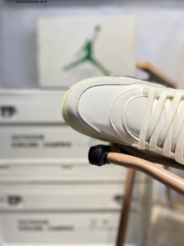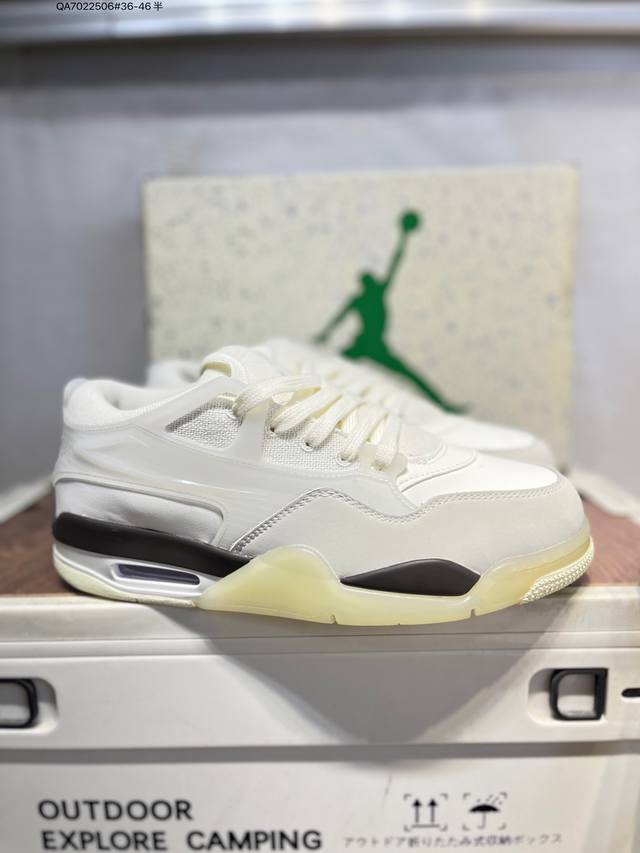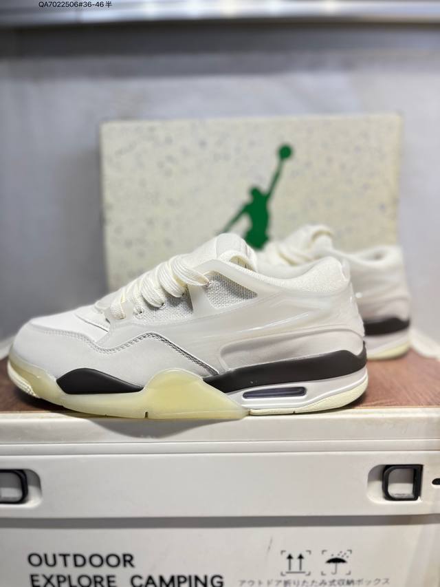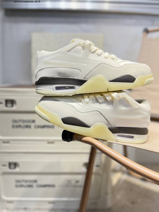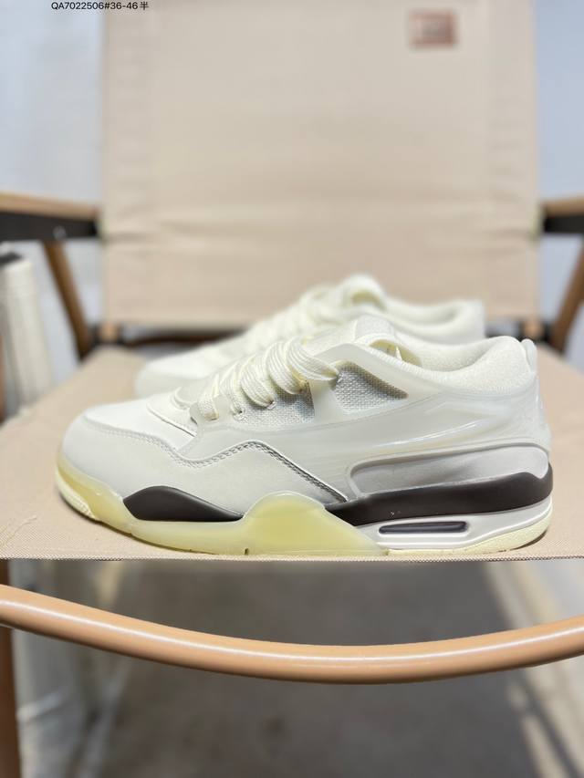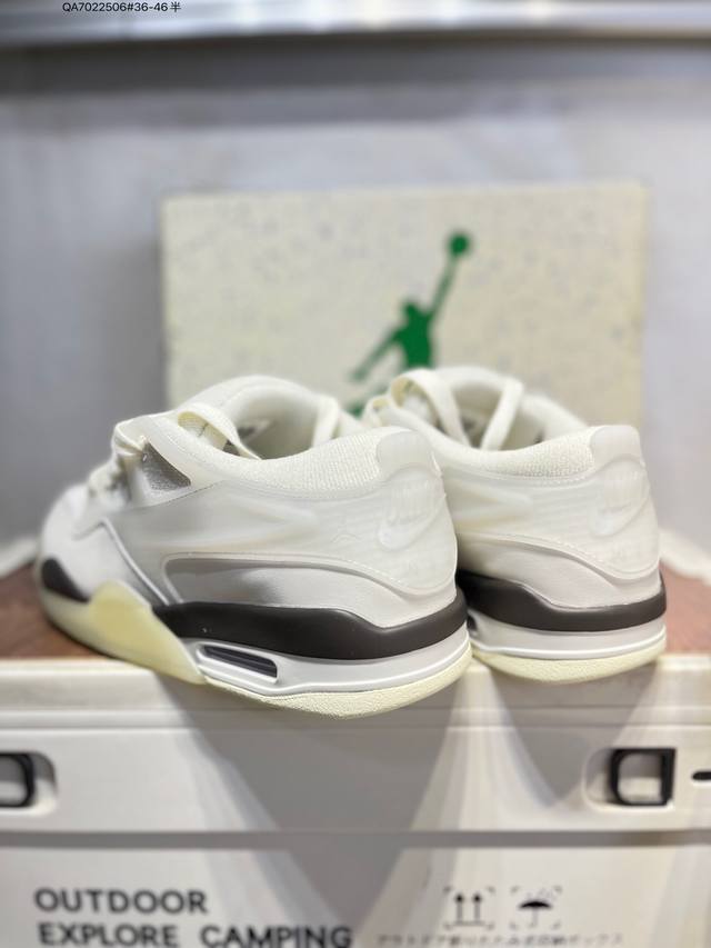 Air Jordan 4 RM Remastered Off-White/Brown AJ4. This off-white Jordan basketball shoe features a leather and canvas upper, with off-white canvas as the main body and an off-white leather frame at the toe. While retaining the classic Air Jordan 4 silhouette, it removes the original mesh and is paired with white laces for a more cohesive look. The tongue features a blue Jumpman logo and "Flight" lettering, highlighting the shoe's identity. The collar and heel pull tabs use off-white TPU material, adding more color depth. The heel features an off-white Nike Swoosh logo, and the midsole continues the use of a split, visible Air Sloes unit in the heel. Finally, a brown midsole, off-white rubber outsole, and blue Jumpman logo complete the overall design. Product Code: Ib8857 Qa7022506#36-46 Half-