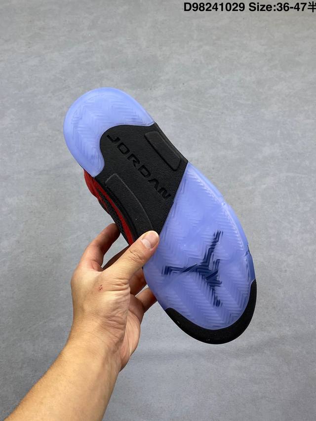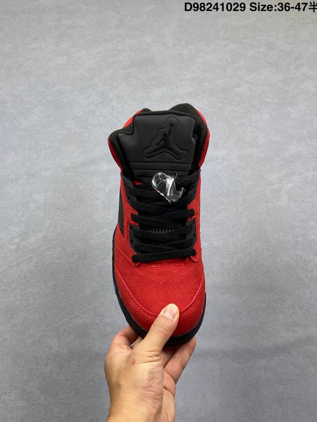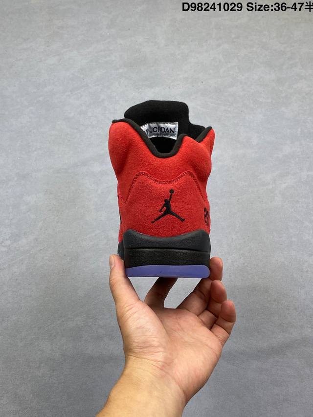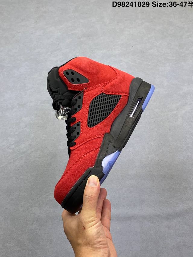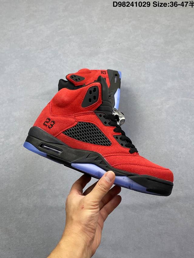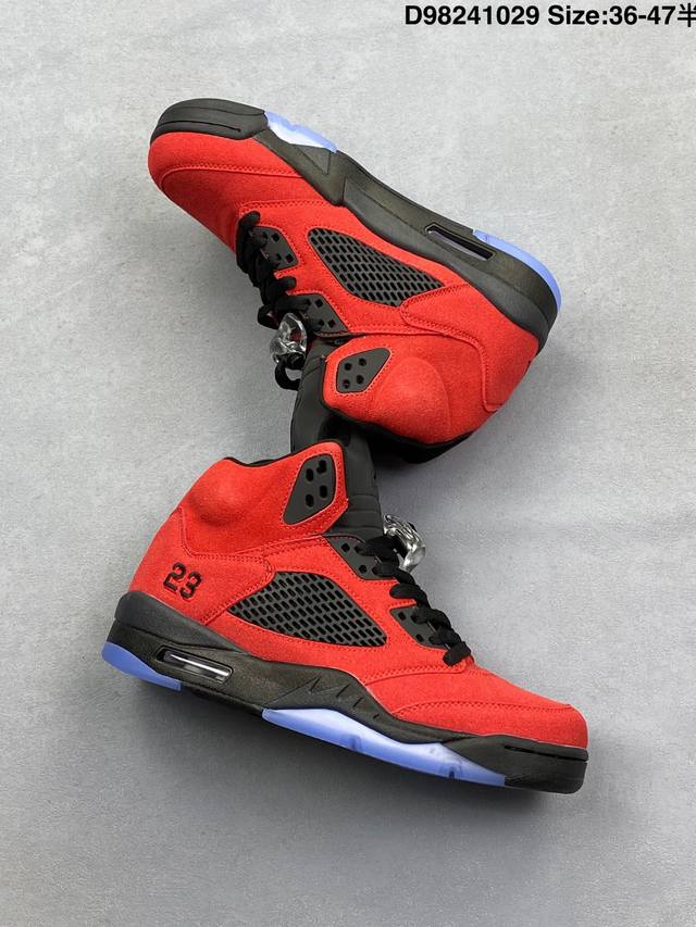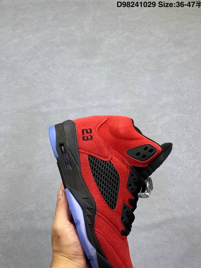 Air Jordan 5 Retro Wolf Grey High-Top Reissue. This high-top Jordan basketball shoe features a premium wolf grey suede upper with white breathable TPU mesh on the sides, creating a striking look. The overall design is wolf grey with white accents on the lining. The tongue retains the classic 3M reflective material and a white Jumpman logo. A transparent Air Sole unit is visible in the midsole, and the Jumpman logo on the heel is embroidered in white, echoing the tongue. The iconic "23" embroidery remains on the lower heel. The silver shark tooth pattern on the midsole is very eye-catching. The outsole features a grey midsole paired with an ice-blue transparent crystal outsole, with a black Jumpman logo printed underneath, completing the design.