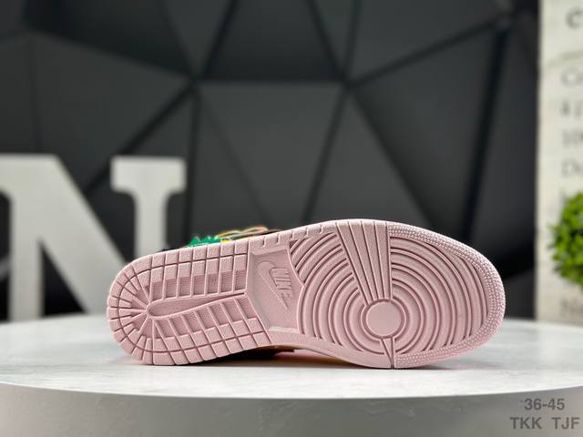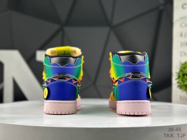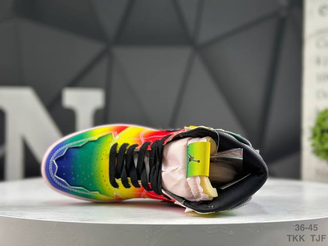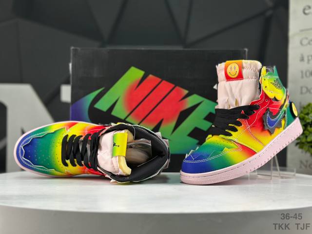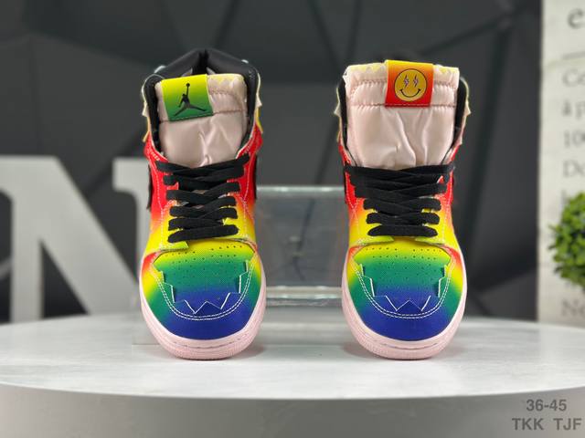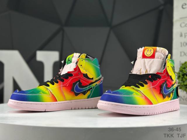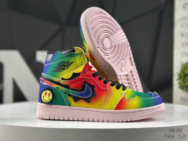 Authentic AJ1 X Jbalvin Reggae King Collaboration Smiley Face Rainbow Tie-Dye DDD American reggae singer Jbalvin performed on stage with Latin pop stars Jennifer Lopez and Shakira. His Air Jordan 1s attracted a lot of attention; the shoes were extremely eye-catching, with a very high-end design and rich details that made them seem like custom-made sneakers. DDD The entire upper is covered in rainbow tie-dye canvas, with serrated edges on each piece of fabric appearing for the first time, creating a unique visual effect. DDD The tongue of the left shoe and the heels of both shoes are adorned with J Balvin's iconic smiley face logo. DDD Style Code: Dc3481-900 DDD Sizes: 36-45 Tkk Tjf DDD
