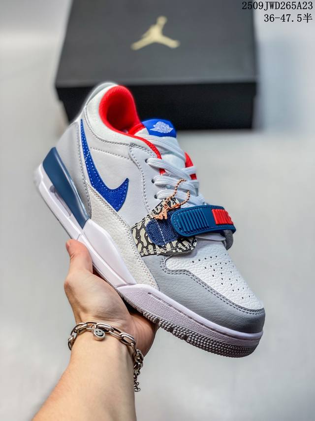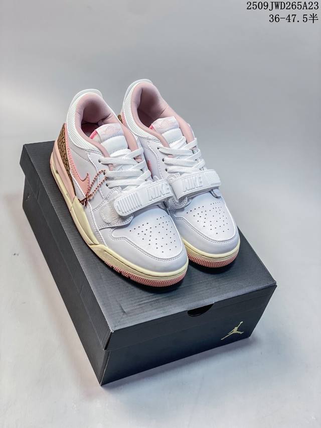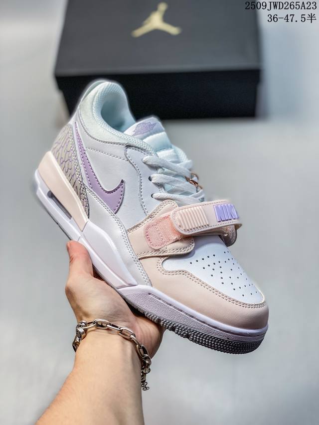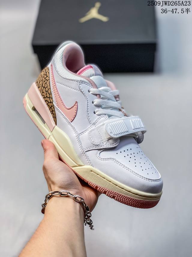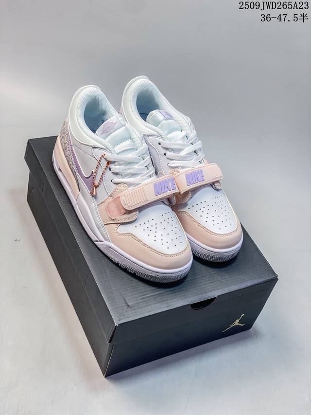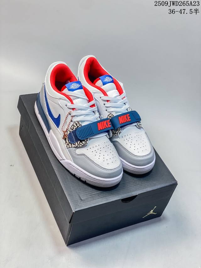 Air Jordan Legacy Aj312 low-top shoe is made of leather. The Velcro across the upper is very eye-catching. The Swoosh logo on the side is partially obscured by the upper, which is quite interesting. The Velcro is marked with the NK logo, and the tongue features the classic Jordan Wings logo. The heel and sole both use the design of the Air Jordan 3, and the heel also uses the classic crackle pattern