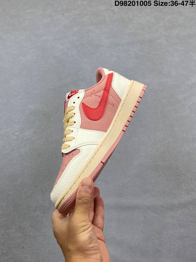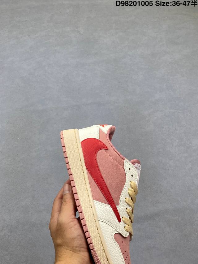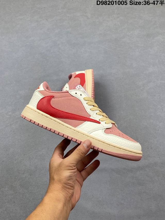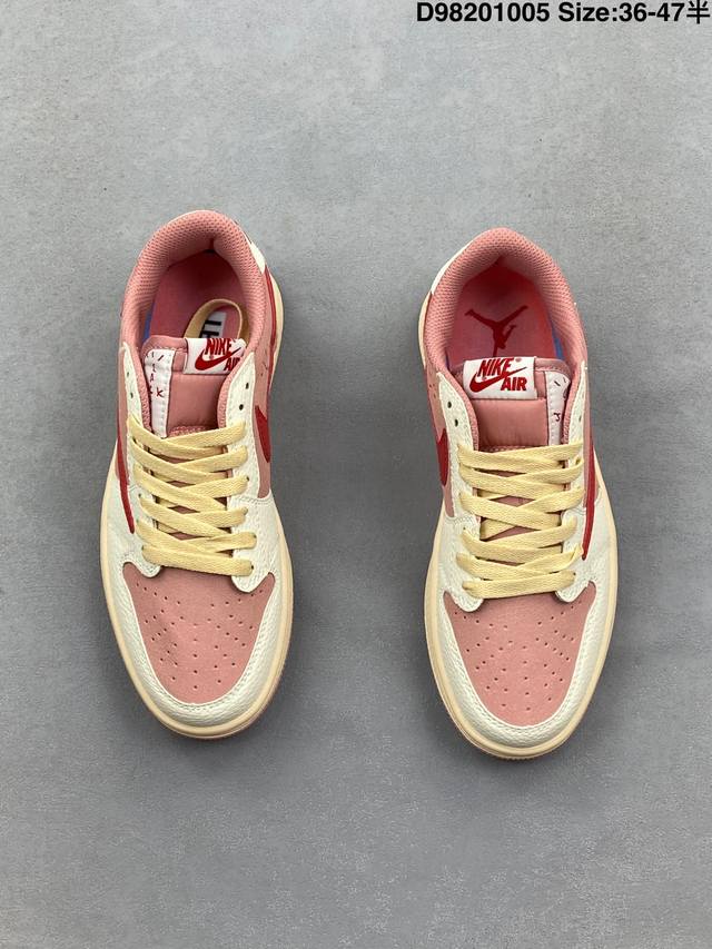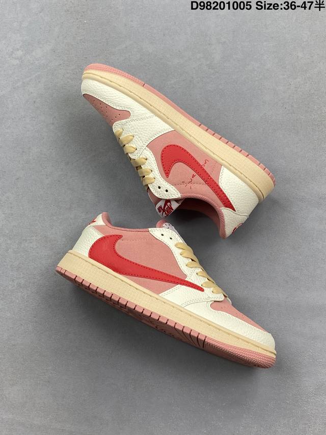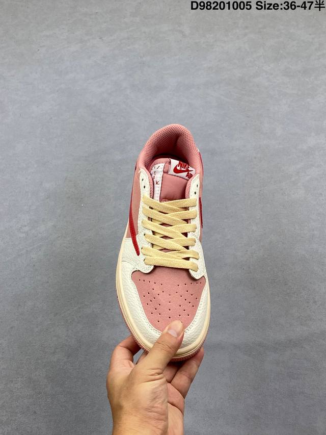 Authentic label with half sizes. Travis Scott X Air Jordan 1 Low, red, white, and black reverse Swoosh AJ1. This Jordan 1 low-top basketball shoe features a white leather base with a red frame overlay. The iconic reverse Swoosh logo is accented with black leather, while the inner side features a black Swoosh logo. Many signature Travis Scott elements, including the tongue, are retained. A red Nike Swoosh logo embroidered on the tongue, and the Cactusj Jack logo on the inner side of the shoe is also in red. The ghost face logo and Wings logos on the heel are crafted with white stitching, highlighting the collaboration. Finally, a white midsole and red rubber outsole complete the design. Style Code: Dm7866-101 Code: D9820 5 Size: 36