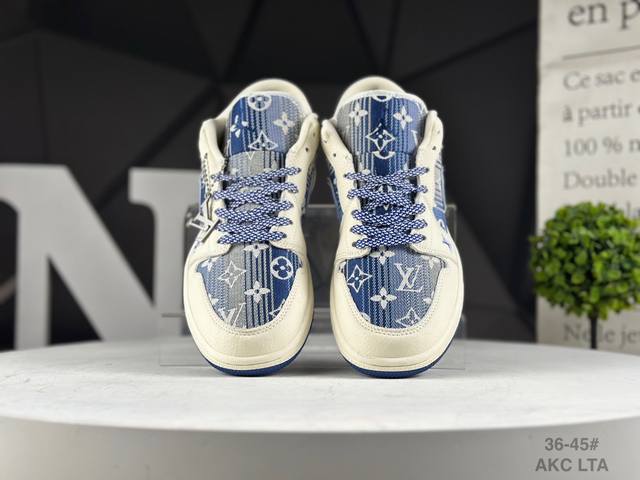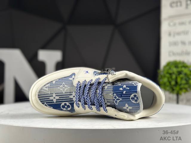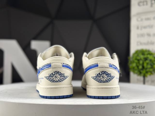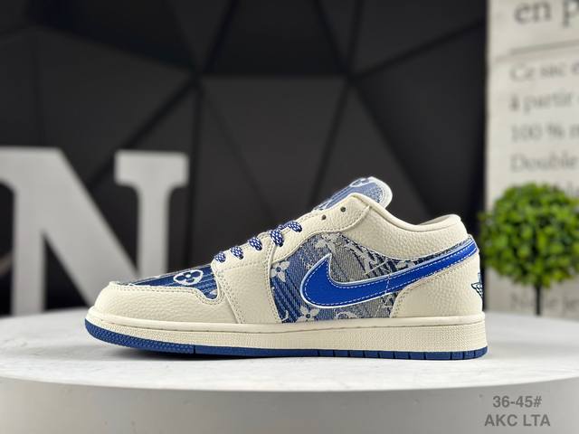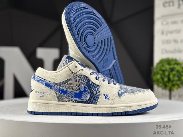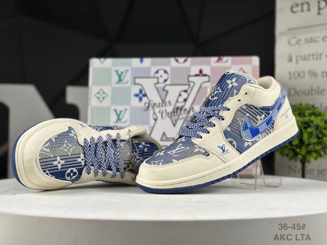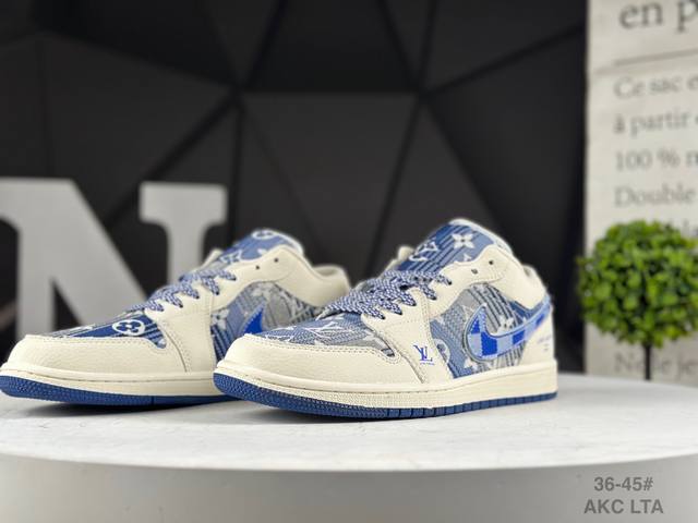 Customized version of Air Jordan 1 Low Aj1 Joe 1 "LV Louis Vuitton co-branded --- off-white blue canvas denim print" high-end customized low-top retro basketball shoes