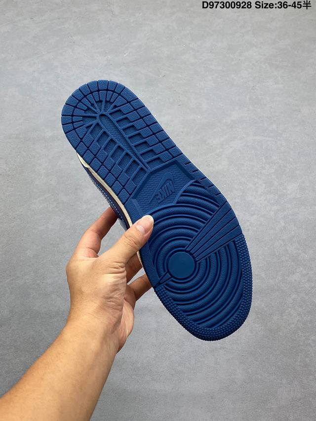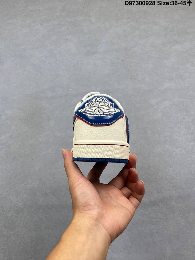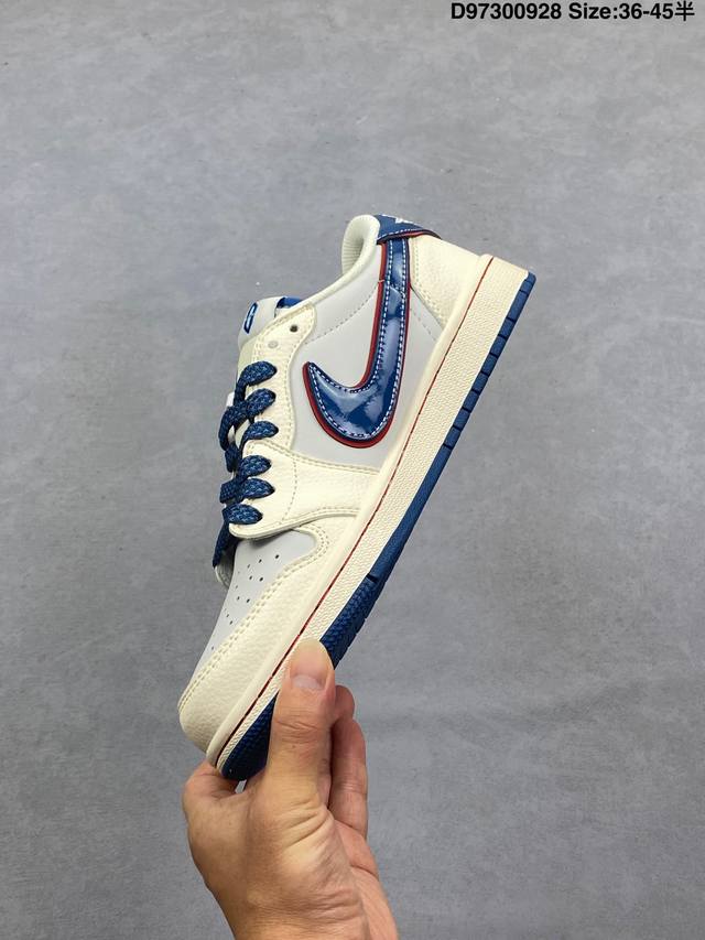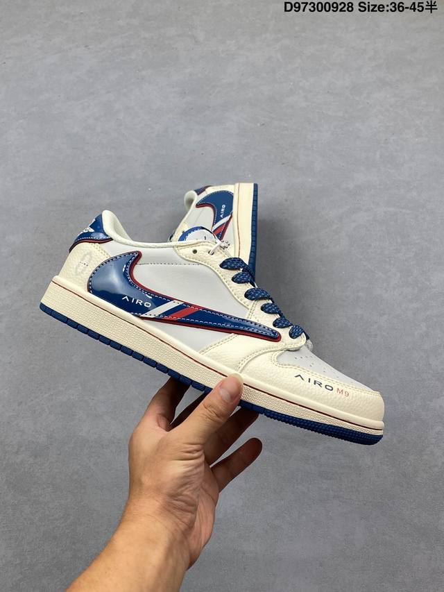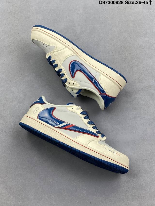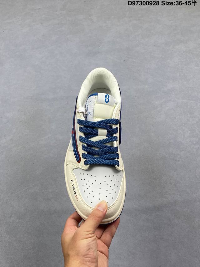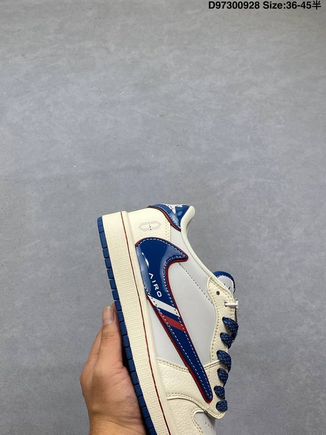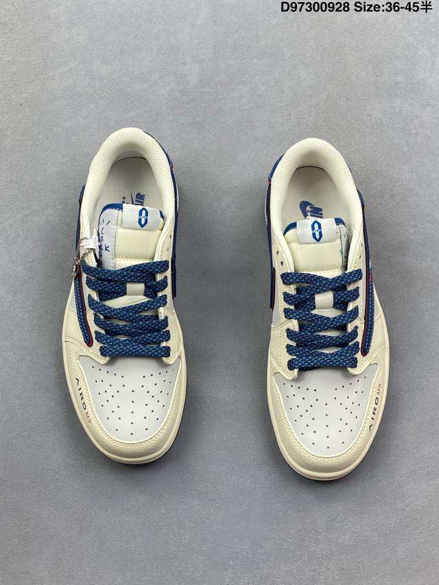 Value-for-money shipping in original box. The new three-party collaboration low-top reverse hook upper continues the black toe design. The entire shoe is made of lychee leather, with a white reverse hook waistband and embellished with Travis Scott's iconic logo. The heel is dominated by Fujiwara Hiroshi's signature blue color, completing the white, blue and black design style of Fragment Design. The left and right feet are decorated with Travis Scott's ghost face and Jordan's flying wings respectively, highlighting the luxurious style of the three-party collaboration.