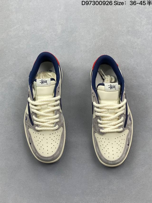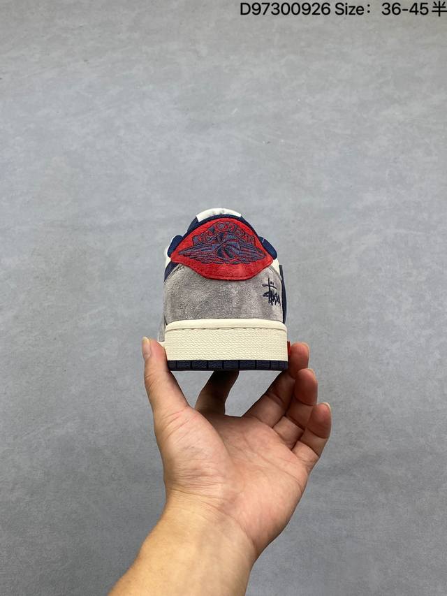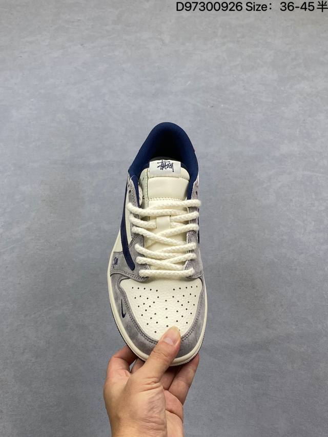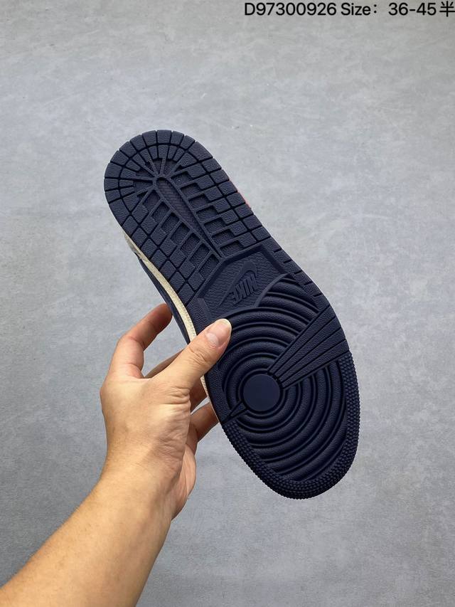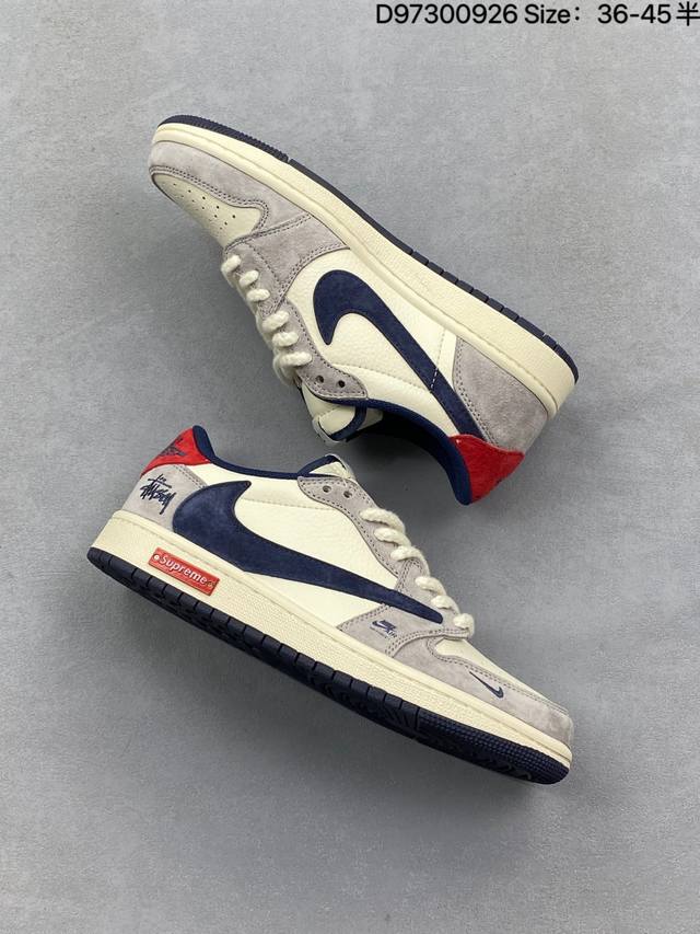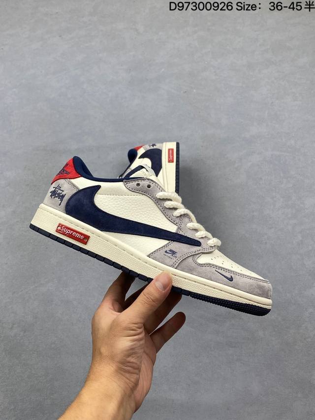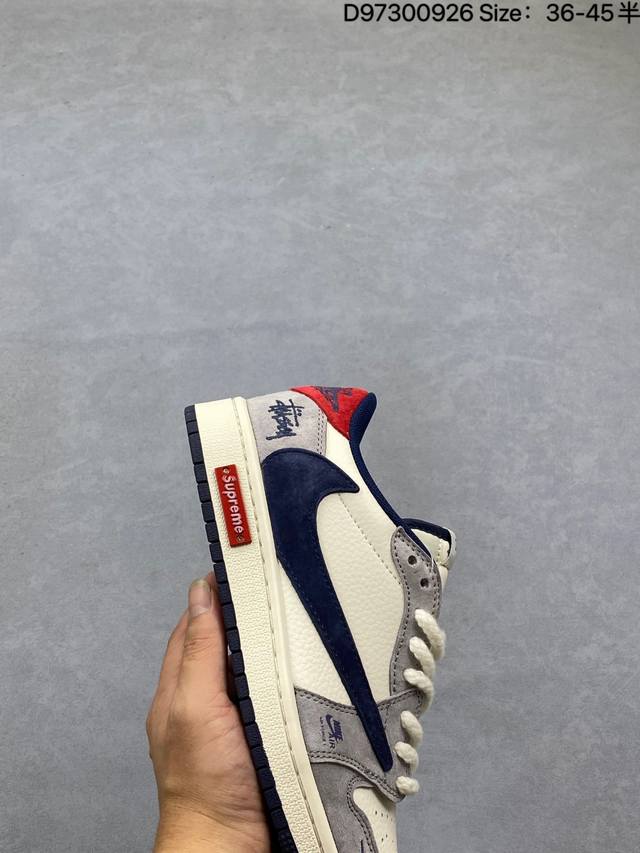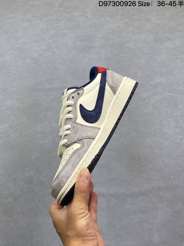 Value-for-money shipping in original box. The new three-party collaboration low-top reverse hook upper continues the black toe design. The entire shoe is made of lychee leather, with a white reverse hook waistband and embellished with Travis Scott's iconic logo. The heel is dominated by Fujiwara Hiroshi's signature blue color, completing the white, blue and black design style of Fragment Design. The left and right feet are decorated with Travis Scott's ghost face and Jordan's flying wings respectively, highlighting the luxurious style of the three-party collaboration.