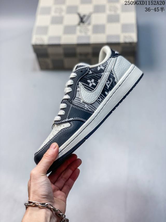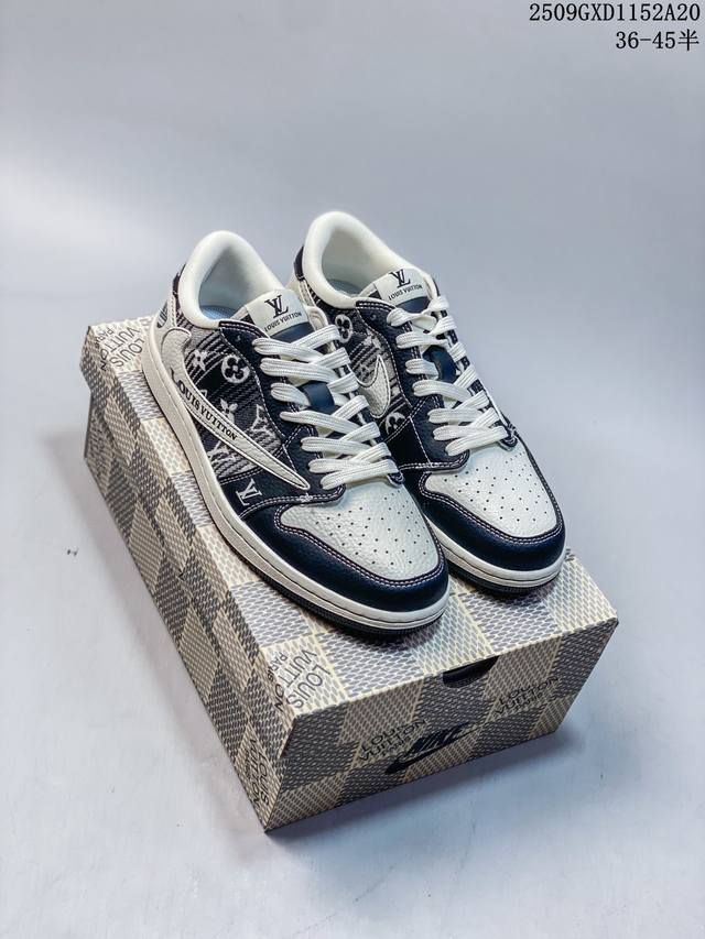 High-end custom Travis Scott x Jordan 1 Low Lv joint - black and white denim inverted hook low-top casual version Original full-grain leather factory pure original quality shipment Pure version custom shoe box Leather cut cleanly without any burrs Perfect details Ultra-high cleanliness