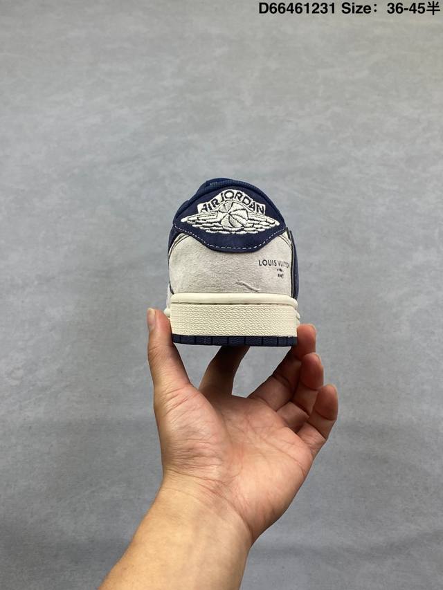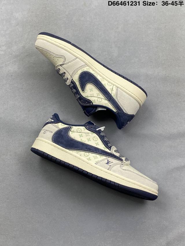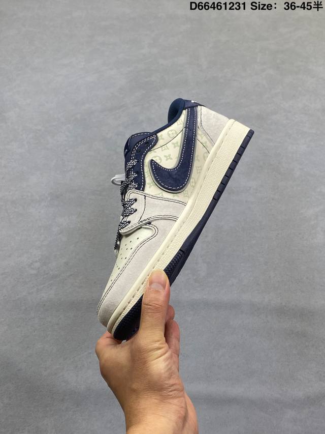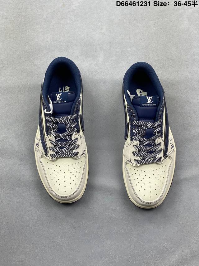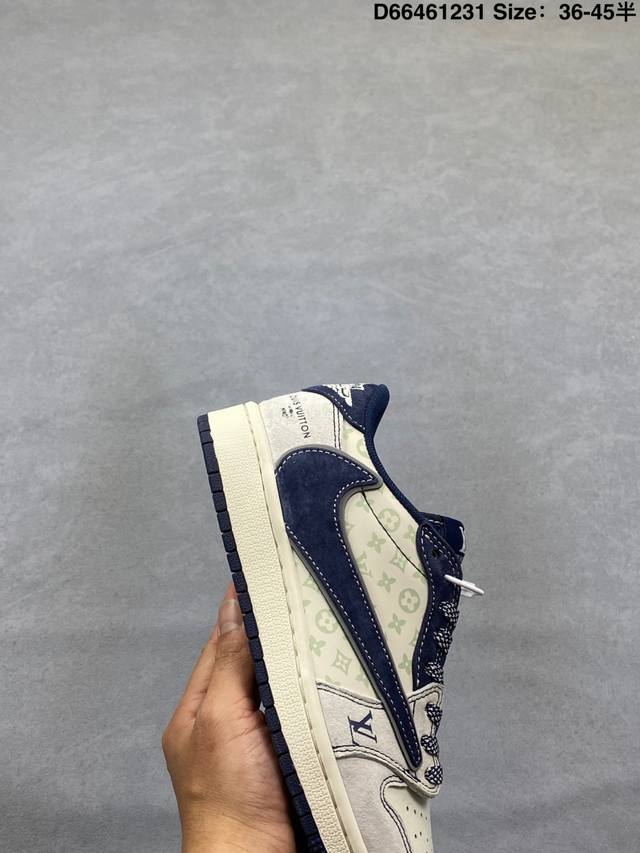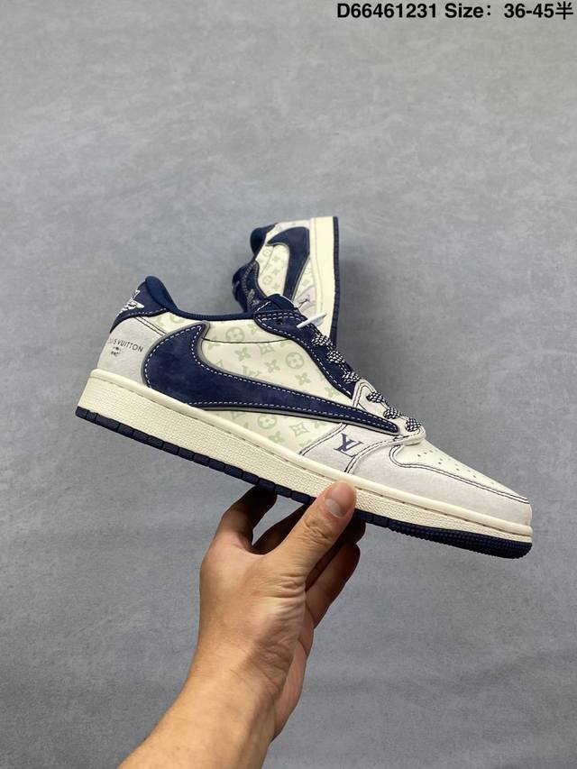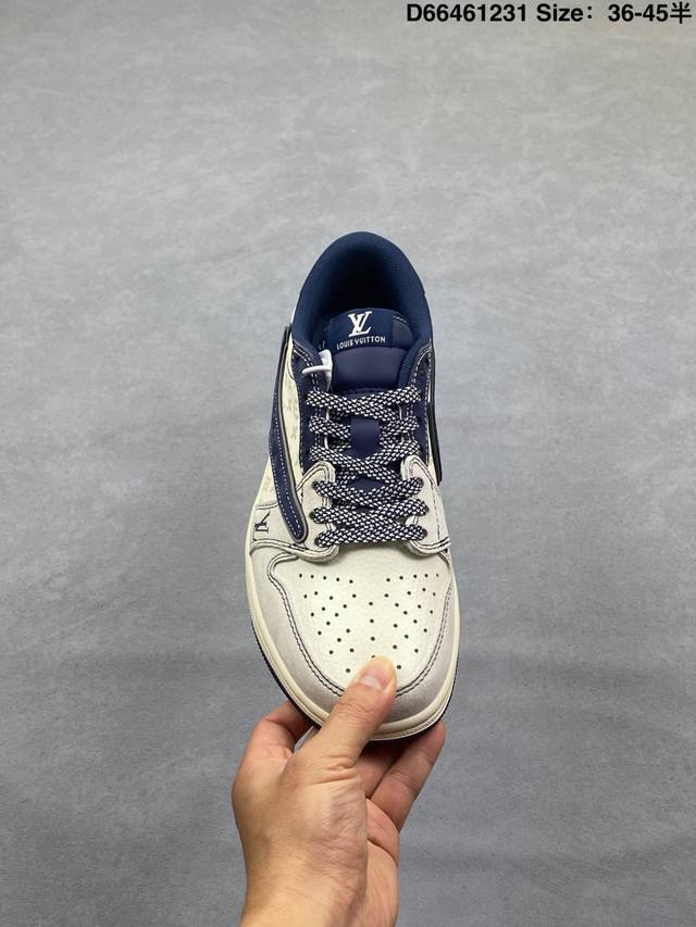 Jordan Fragment X Travis Scott X LV Air Jordan 1 Low Three-Way Collaboration with Reverse Swoosh. The entire shoe is crafted from pebbled leather, featuring a white reverse Swoosh on the waist and Travis Scott's iconic logo. The heel uses Hiroshi Fujiwara's signature blue as the main color, perfecting the white, blue, and black design style characteristic of Fragment Design. The left and right shoes are decorated with Travis Scott's ghost face and Jordan's Wings logo respectively, showcasing the luxurious style of the three-way collaboration. Sizes: 36 36.5 37.5 38 38.5 39 40 40.5 41 42 42.5 43 44 45 Style Code: Dm7866-292 D66461231