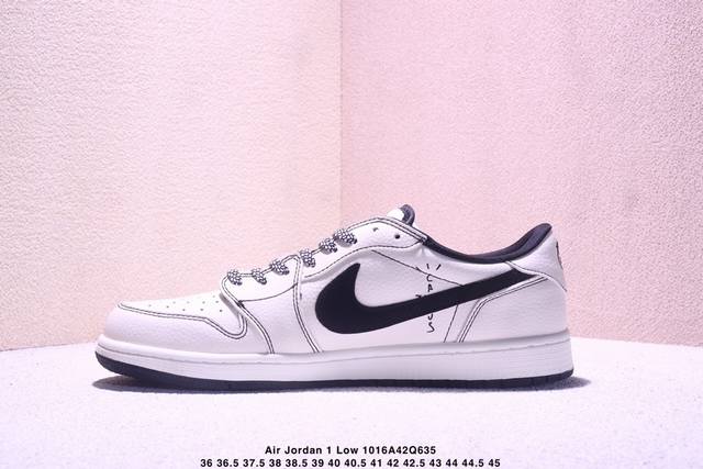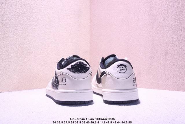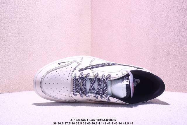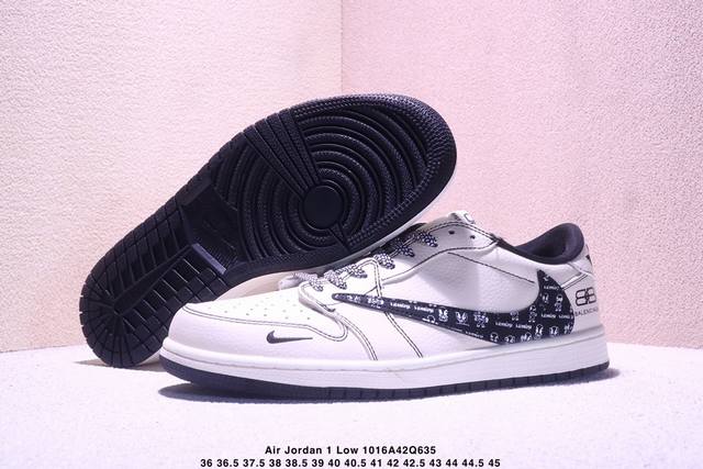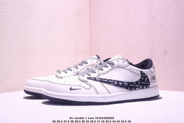 Limited release of overseas hot item! High-end custom Travis Scott X Fragment Design X Jordan Air Jordan 1 Low Og Sp "Balenciaga Collaboration - Off-white Black Swoosh Paris Print" High-end custom reverse swoosh three-way collaboration low-top basketball shoes